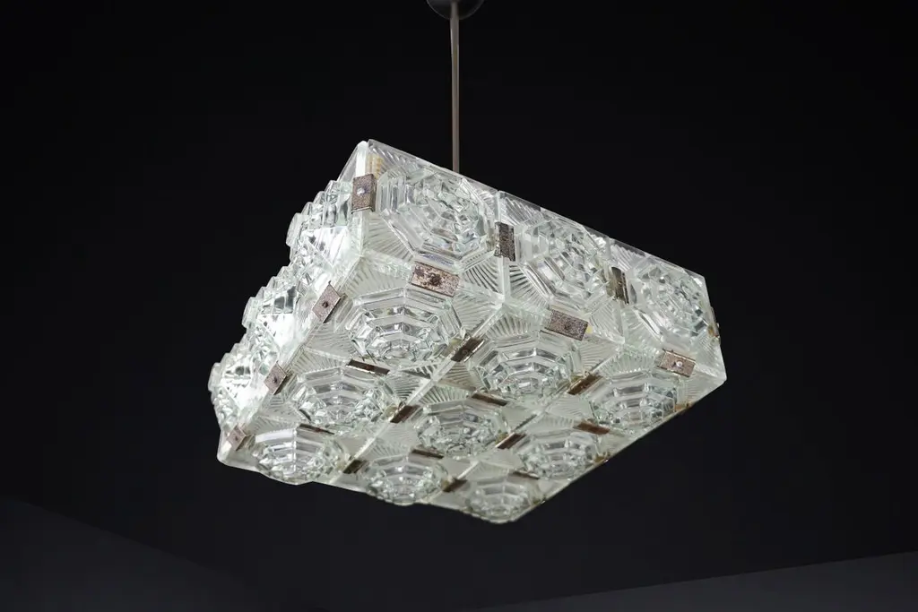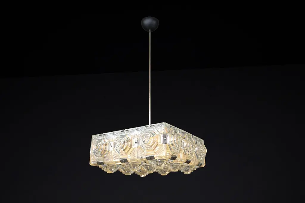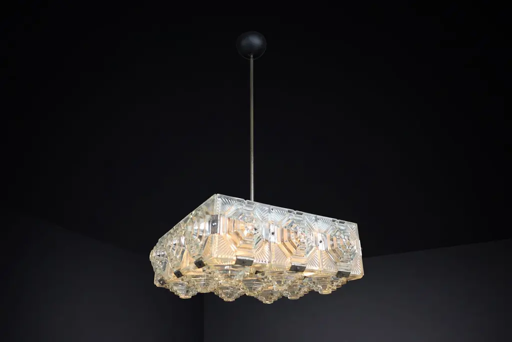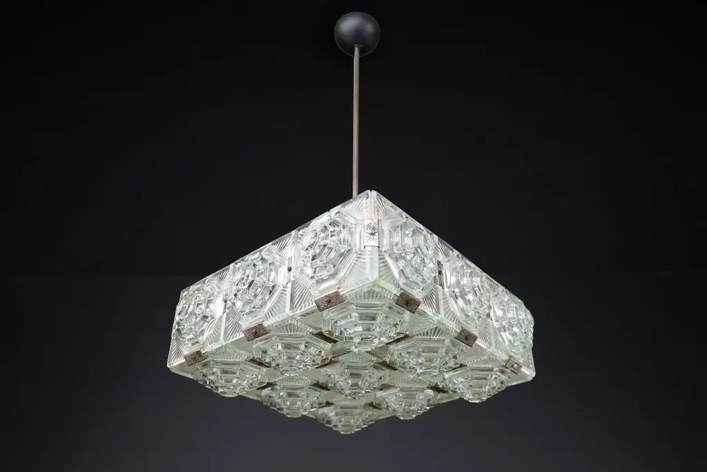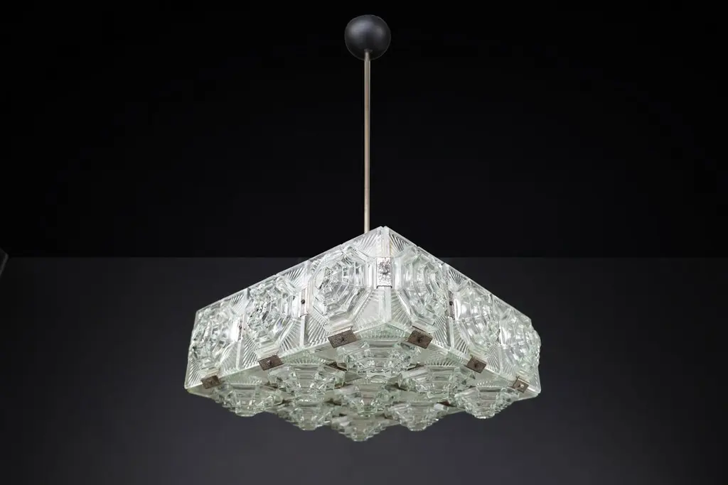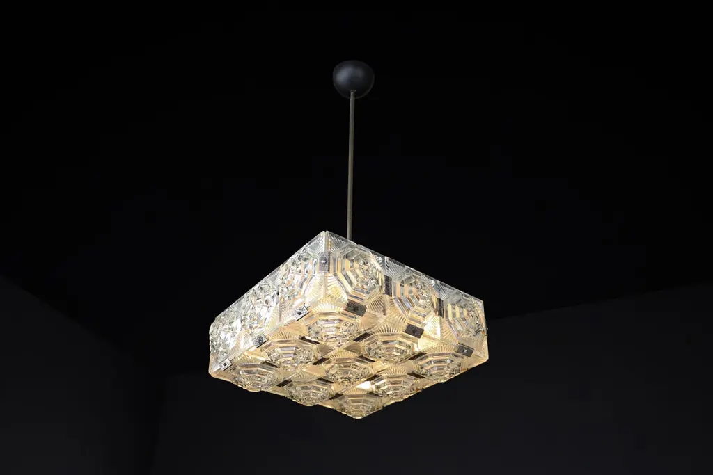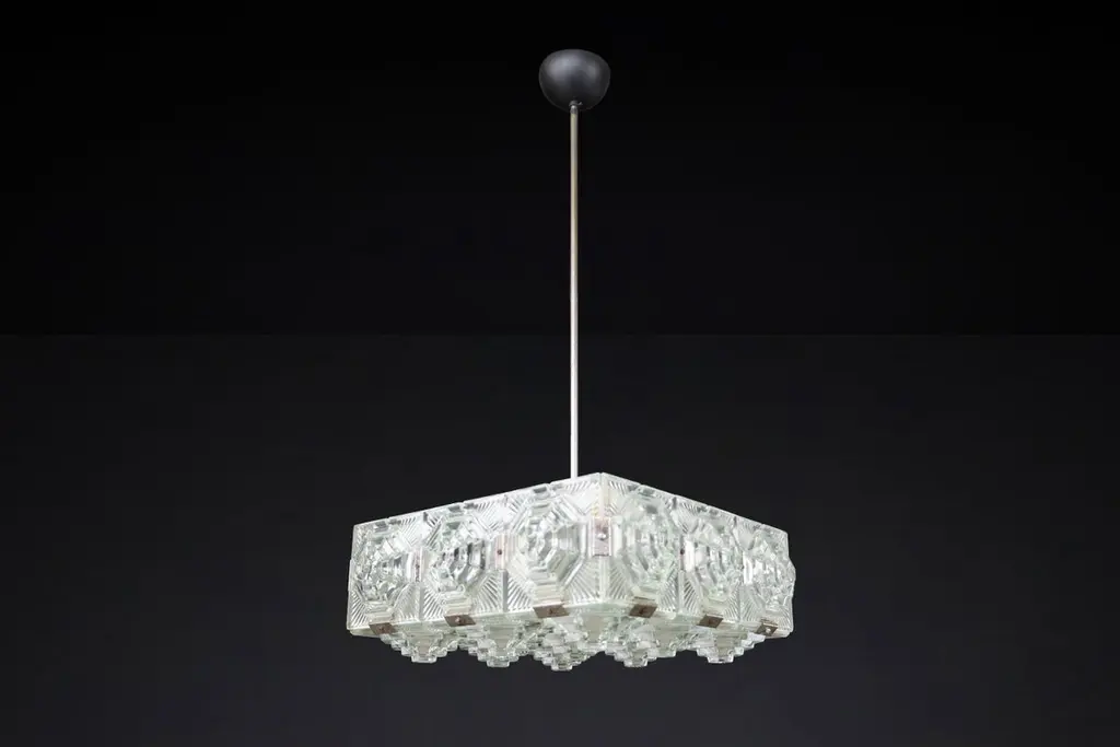 Bohemian Mid-Century Modern Glass & Chrome Chandelier, Czechoslovakia, 1970s – 21 Glass Elements, Restored (12+ Available, Priced Per Piece)This rare Bohemian chandelier from 1970s Czechoslovakia is a beautiful expression of Mid-Century Modern design and Eastern European craftsmanship. Featuring 21 thick, textured glass modules arranged in a geometric chrome-plated frame, the fixture combines sculptural elegance with functional lighting.Each pressed-glass element is designed to refract light in all directions, casting a warm and decorative glow. The square format and chrome structure provide a bold architectural silhouette, perfect for interior spaces that appreciate clean lines with artisanal detail.The chandelier has been professionally restored and thoroughly cleaned, while preserving its vintage character. It is fitted with E27 sockets, fully compatible with LED bulbs, and has been rewired to meet international safety standards. It is ready for immediate installation worldwide—no conversion necessary.The metal components retain some original patina, adding authenticity and charm appropriate to its age. The overall condition is excellent, with all glass elements intact and sparkling.Specifications:Origin: CzechoslovakiaDate: 1970sStyle: Mid-Century Modern / BohemianMaterials: Pressed glass, chrome-plated steelGlass Modules: 21Socket Type: E27 (standard screw, LED compatible)Dimensions: 45 × 45 cmSuspension Height: 80 cmWiring: Updated for international use (US, UK, EU compatible)Condition: Excellent vintage condition; some patina on metalPrice: Per chandelierAvailability: 12+ in stock – ideal for large-scale residential or hospitality projectsA rare opportunity to acquire multiple units of an iconic European design—perfect for designers, collectors, or anyone seeking bold, vintage lighting with global functionality.