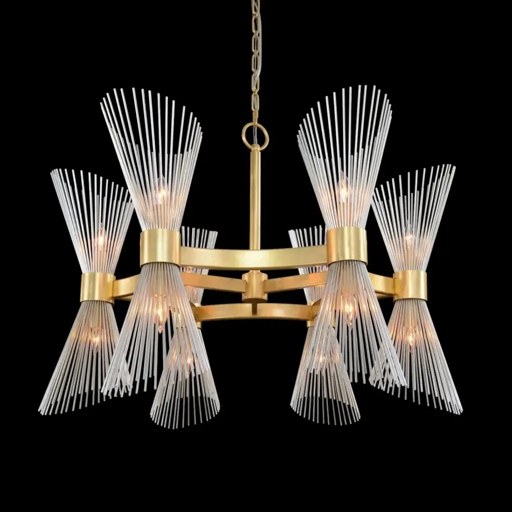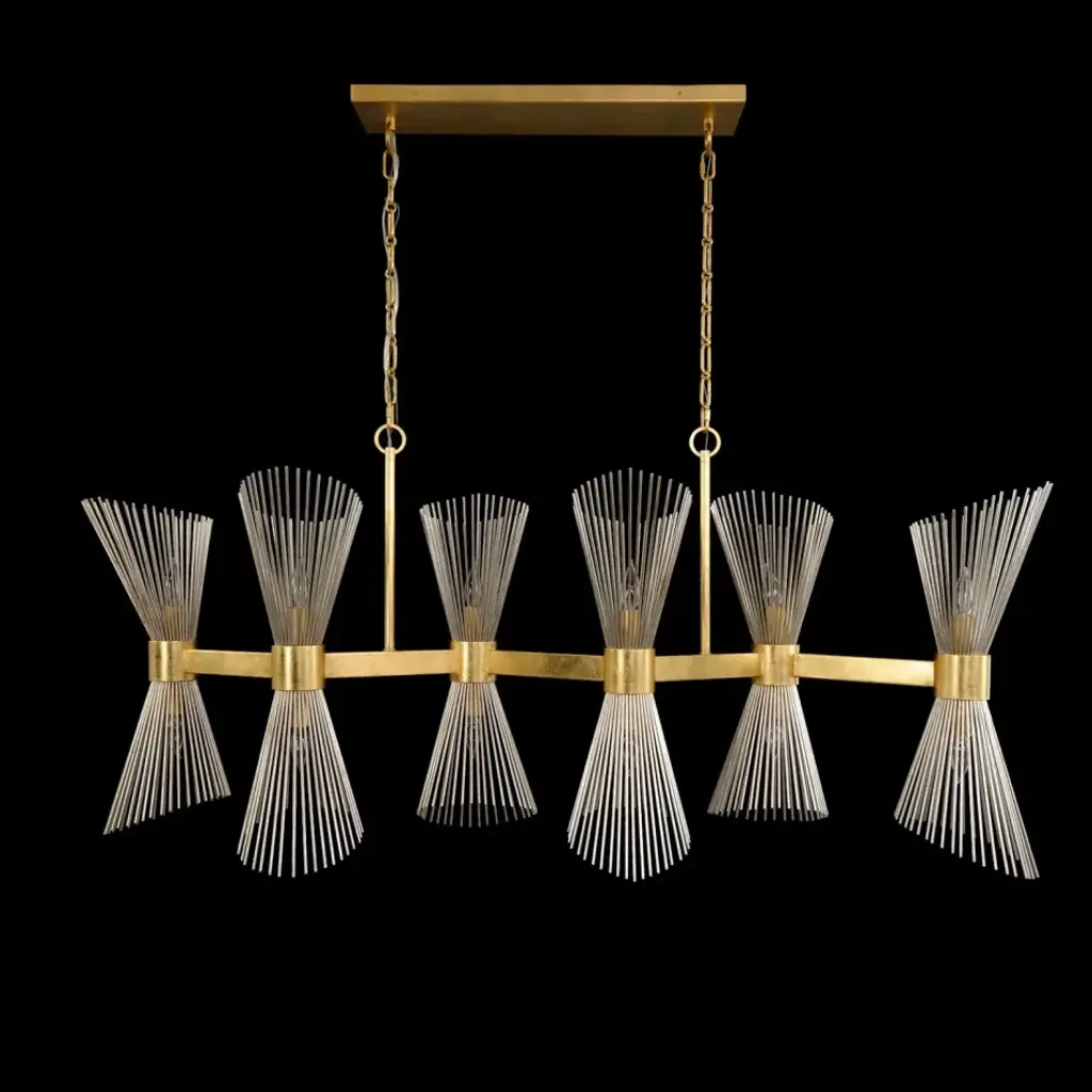 The Bonheur is a lively, charismatic twelve-light horizontal chandelier with an adjustable dimmer that fills an interior space with an air of tasteful sophistication. Adjustable shades crafted from slant cut rods are finished in silver leaf and arranged at staggered heights to form a charming conical shape. The silver leaf is directly contrasted by an opulent gold leaf finish adorning the metallic frame, resulting in stunning juxtaposition that generates an alluring element of visual interest. The Bonheur Twelve-Light Horizontal Chandelier possesses timeless appeal that seamlessly blends with a variety of contemporary spaces.