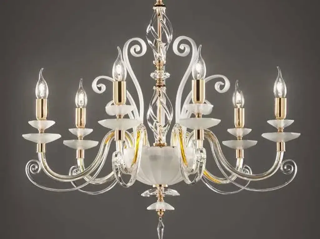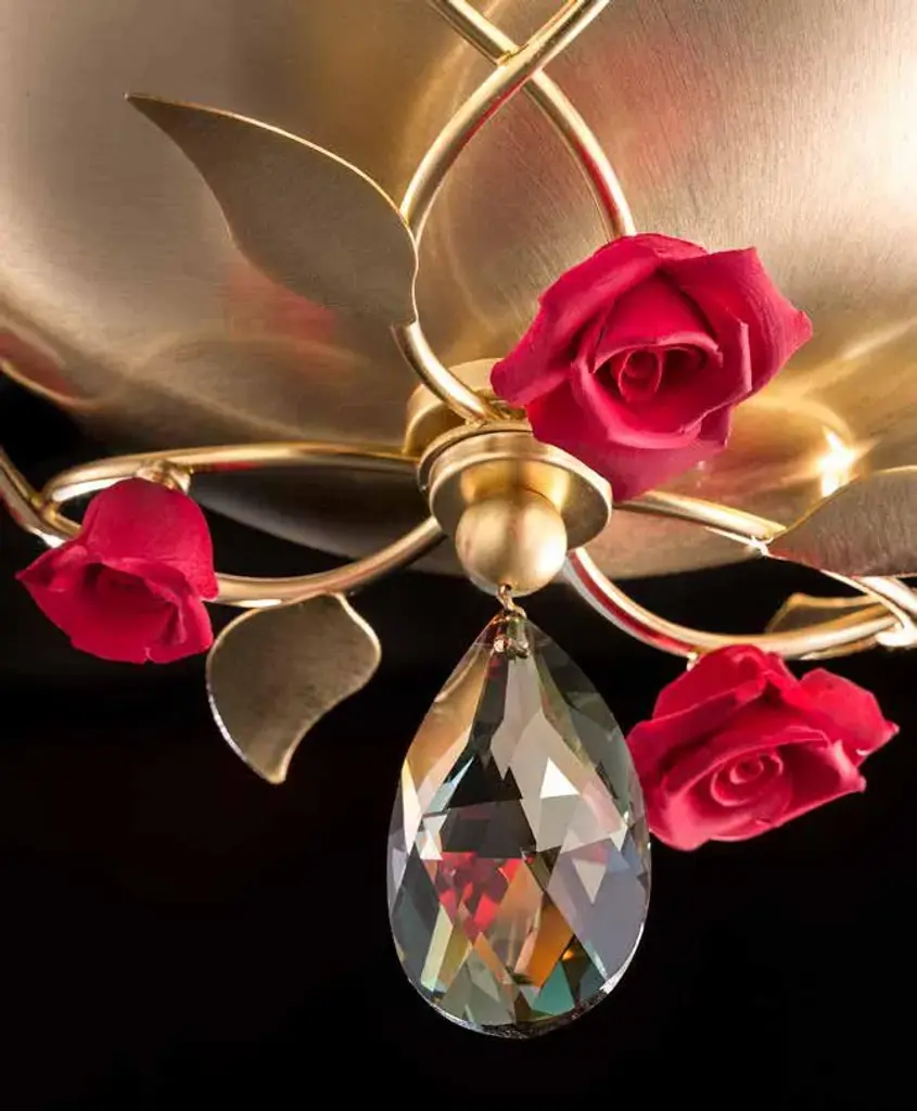 Finitura: black nichel, shiny brown tin, satin gold, ivory. Other finishes on request.Colori: midnight blue, fumè bronze, rosaline,tiffany.Porcelain colors: blue, ivory, red, rosaline, tiffany.Particolari: Bora collection is an idea by Euroluce lampadari – studio in project. Elements in Capodimonte porcelain and metallic components are designed by Euroluce lampadari- studio in project and they are modelled handmade from artisans teacher. Glass element are made in Venice.Central body in hand-blown glass is made in Tuscany. Embellished with Swarovski ® pendant. It’s possible to require G9 lamp cap or E14 lamp cap.Shade 34/65 mod. high cylinder with wrinkled fabric / pvc in ivory, red or blue colors