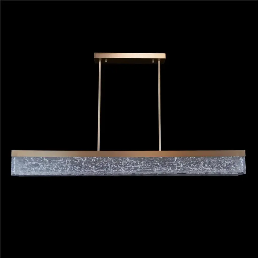 The Boreal Horizontal Chandelier showcases an elegant look that blends subtle wintry motifs with opulent tones. Crafted from acrylic with a stunning icy texture, the light is nested within a rectangular metal frame finished in Antique Brass.