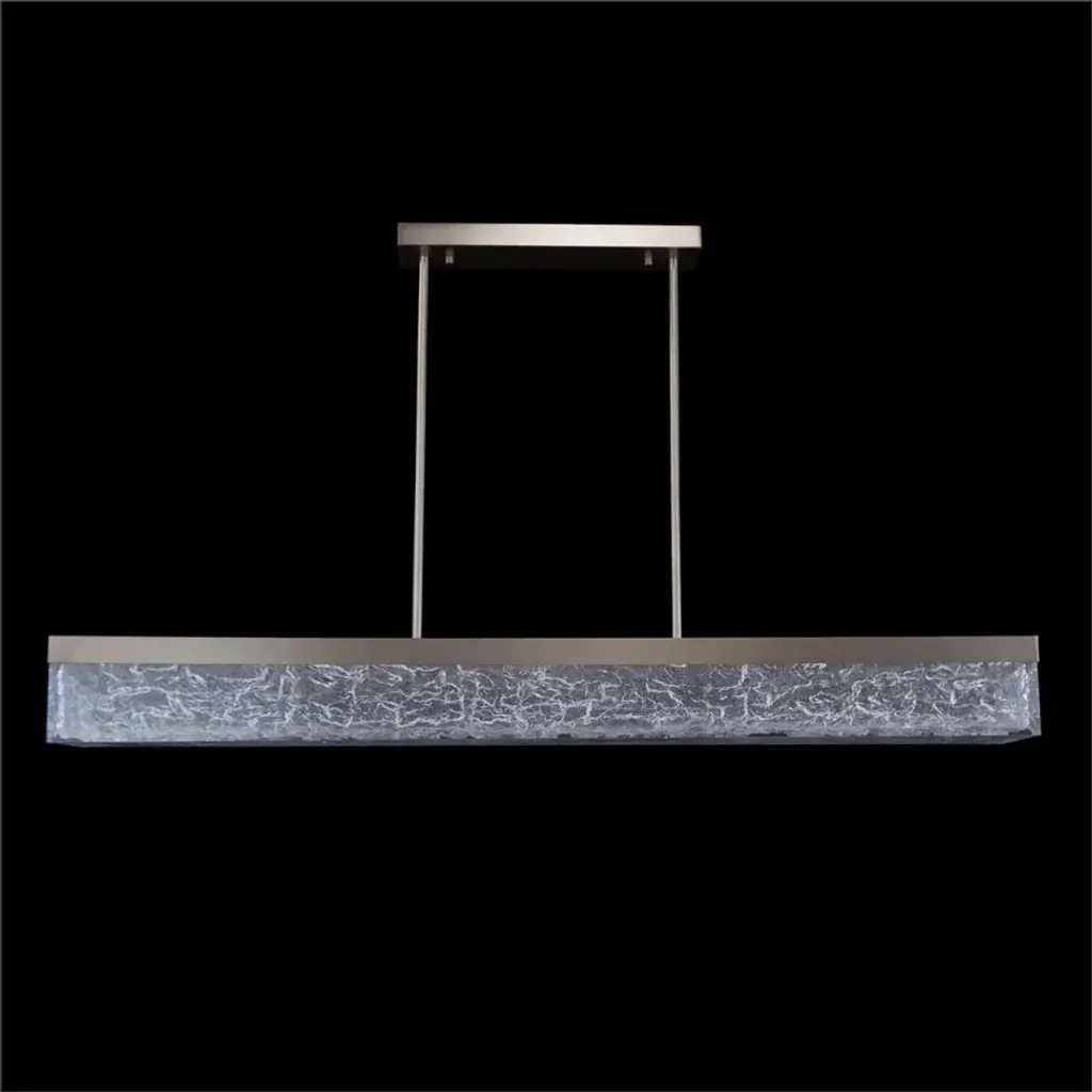 The Boreal Horizontal Chandelier showcases an elegant look that blends subtle wintry motif with opulent tones. Crafted from acrylic with a stunning icy texture, the light is nested within a rectangular metal frame finished in Brushed Nickel.