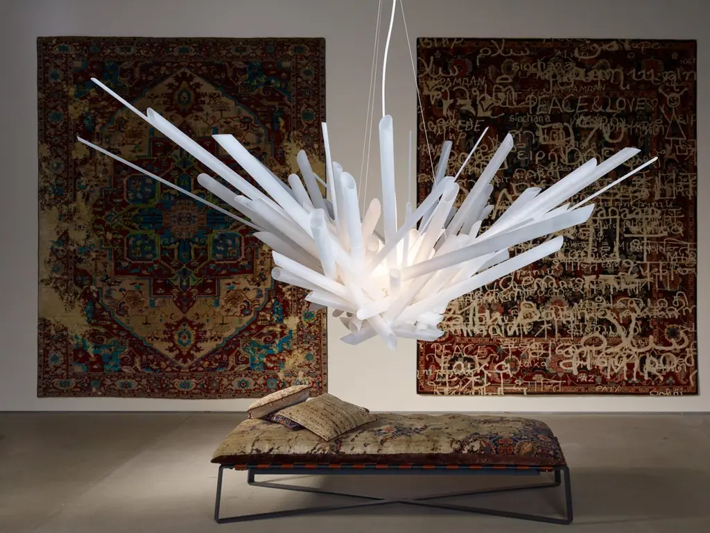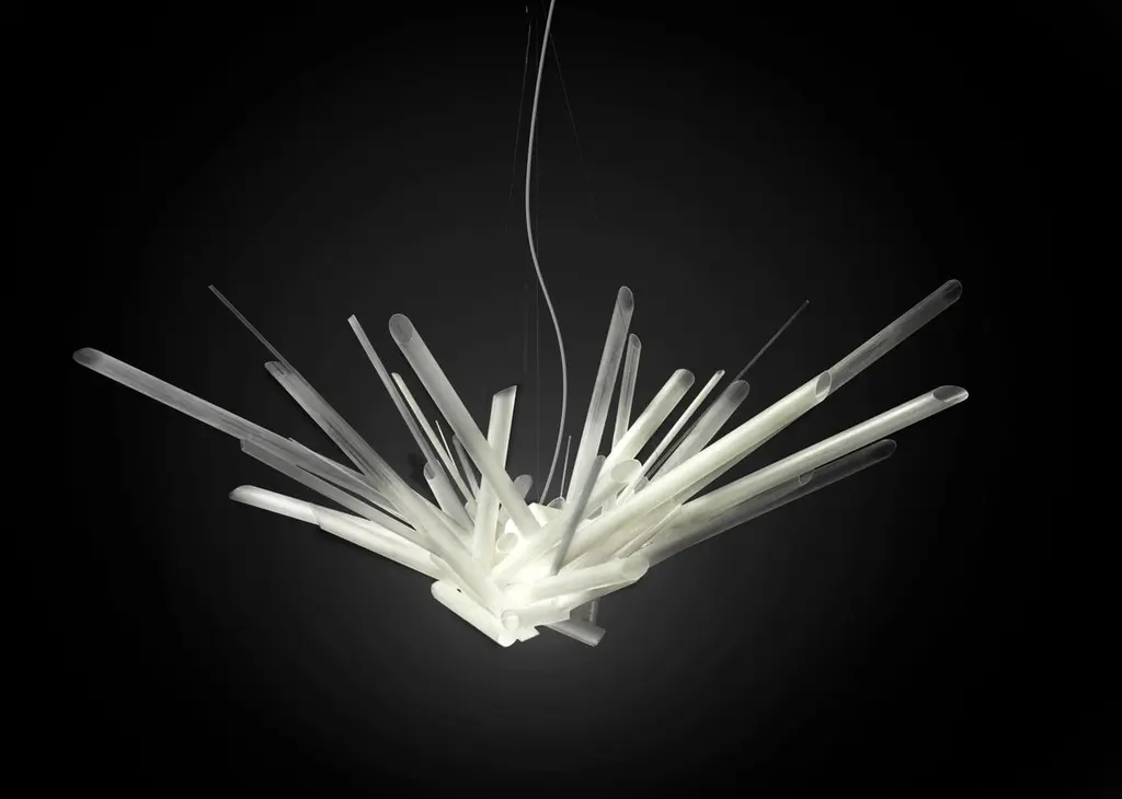 Boro Boro chandelier by Neal Aronowitz DesignDimensions: Ø 132 x H 61 cm.Materials: Borosilicate glass tubes and rods, stainless steel suspension, dimmable xenon halogen bulbs.One of a kind.All our lamps can be wired according to each country. If sold to the USA it will be wired for the USA for instance.Award-winning lighting design in the LAMP 2016 International Lighting ExhibitionThe Boro Boro Chandelier is constructed solely of glass, except for the stainless steel cable suspension and Xenon bulbs and sockets. The form and placement of these minimally cold-worked, frosted borosilicate tubes and rods of varying diameters and lengths express an explosion of force while gently diffusing and guiding the radiating luminous glow of light out from the center.In Feng Shui practice, the burr crystal embodies unfettered learning and growth in all directions and allows for the free unrestricted flow of Universal Life Force.Dynamic, exuberant, and playful from every angle and perspective, The Boro Boro Chandelier functions as a sculptural, efficient light source with an inviting and energetic presence.Neal Aronowitz art/design was founded in 2014 and with just a few powerful and iconic pieces of furniture and lighting, has quickly won acclaim in the international design world.The vision of the studio is the design and fabrication of highly sculptural, hand crafted bespoke furniture and lighting.Aronowitz’s debut piece was the Whorl Coffee Table, which won international notice including a feature in Elle Décor and was the recipient of a People’s Choice Award at the AZ Design Awards, sponsored by Azure Magazine.