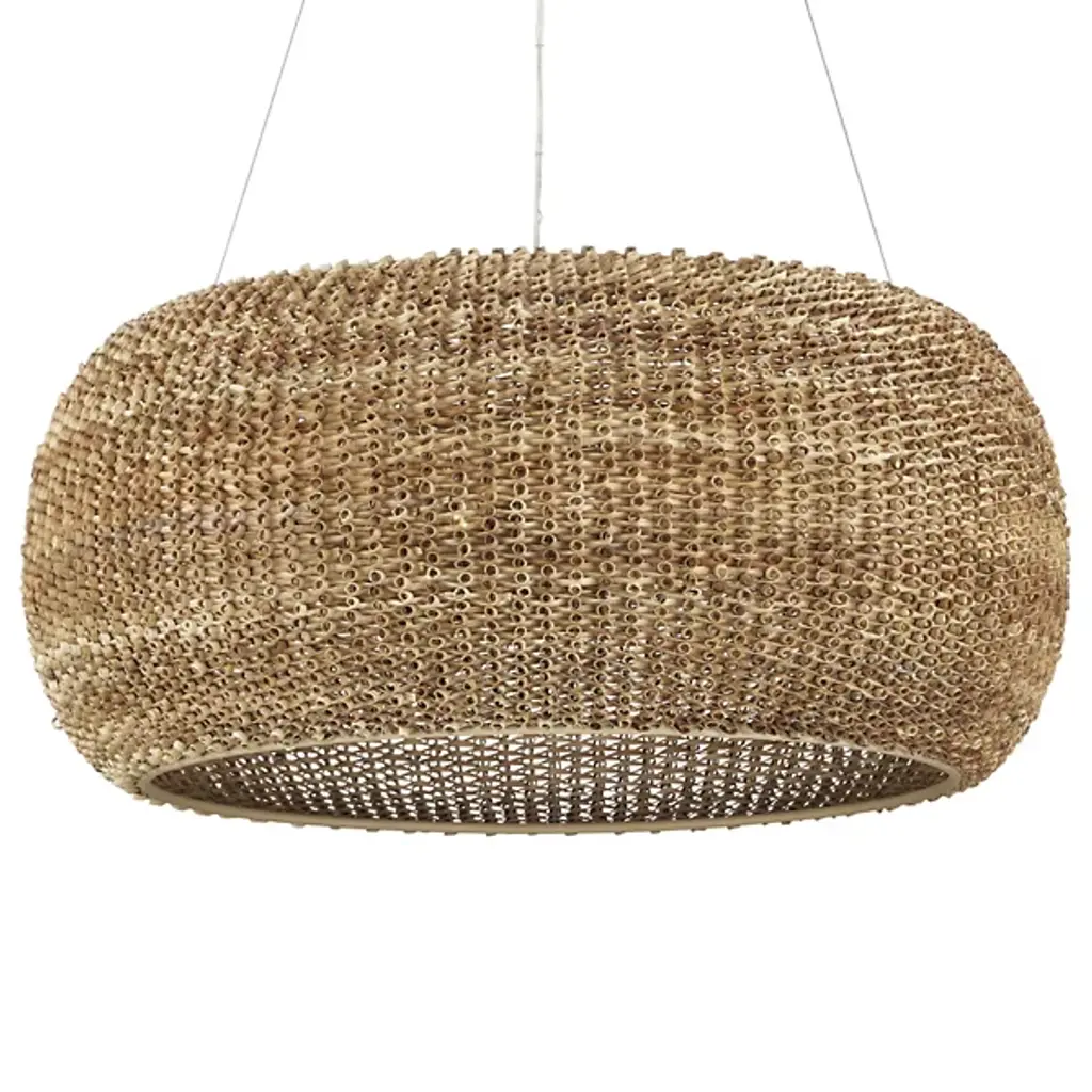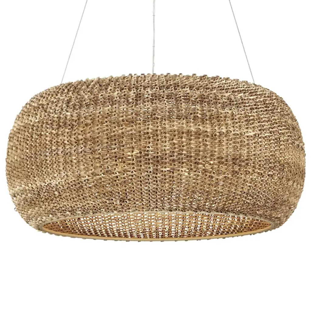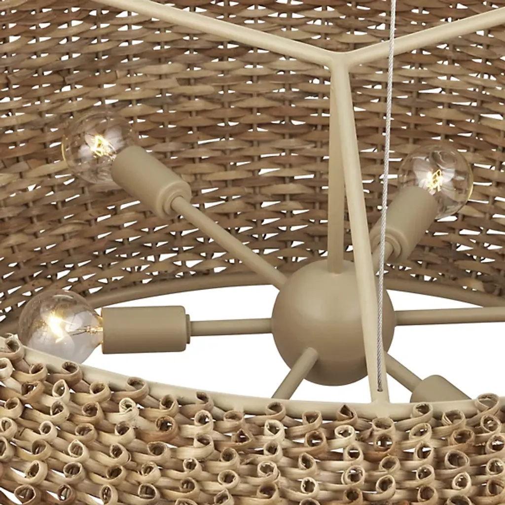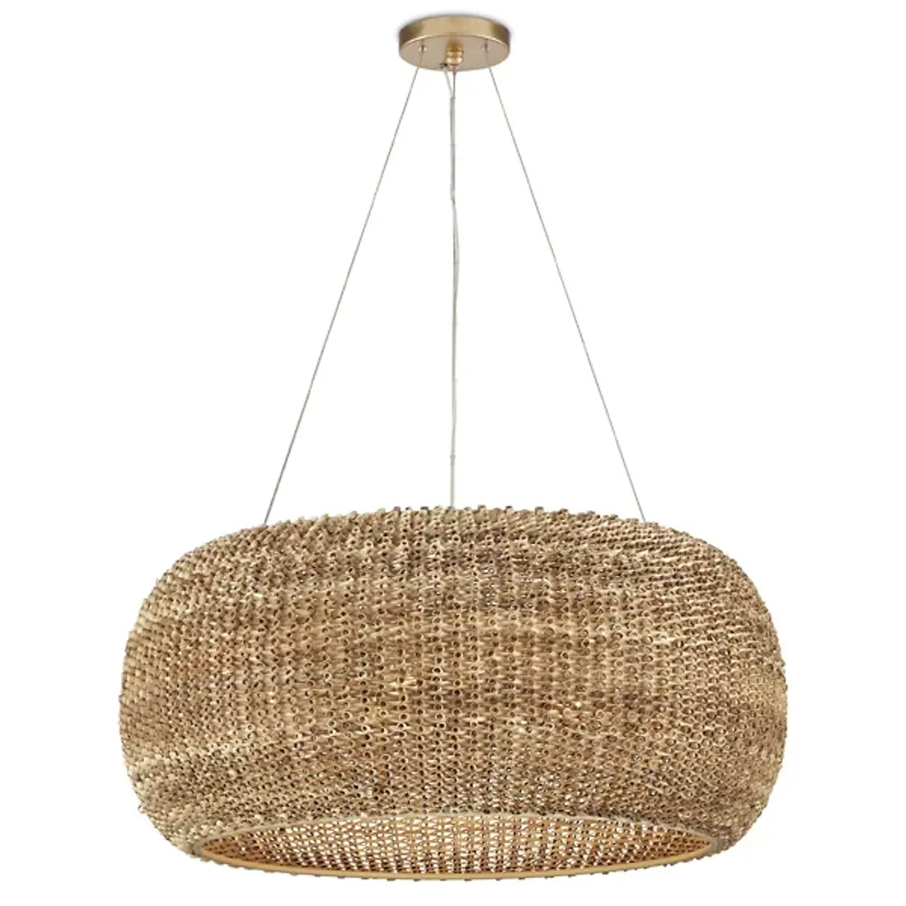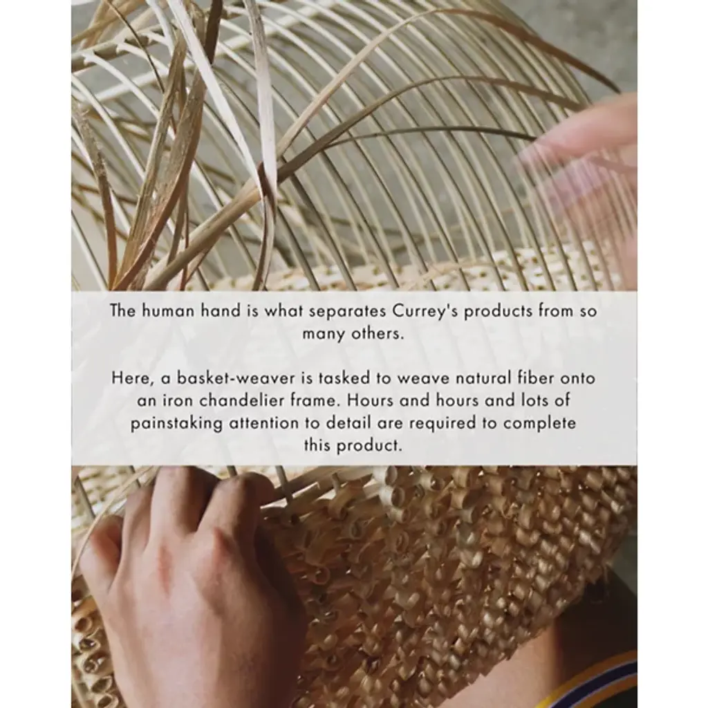The Boucle Chandelier from Currey & Company showcases extraordinary rattan craftsmanship using traditional quilling techniques. Artisans meticulously curl and weave natural rattan strands to create intricate patterns with dimensional edges. The shade's complex construction requires precise hand-working to maintain consistent curves throughout the design. Suspended from a wrought iron frame, the woven dome creates patterns of light and shadow. The pendant's adjustable chain system allows for customizable hanging heights, with additional lengths available.