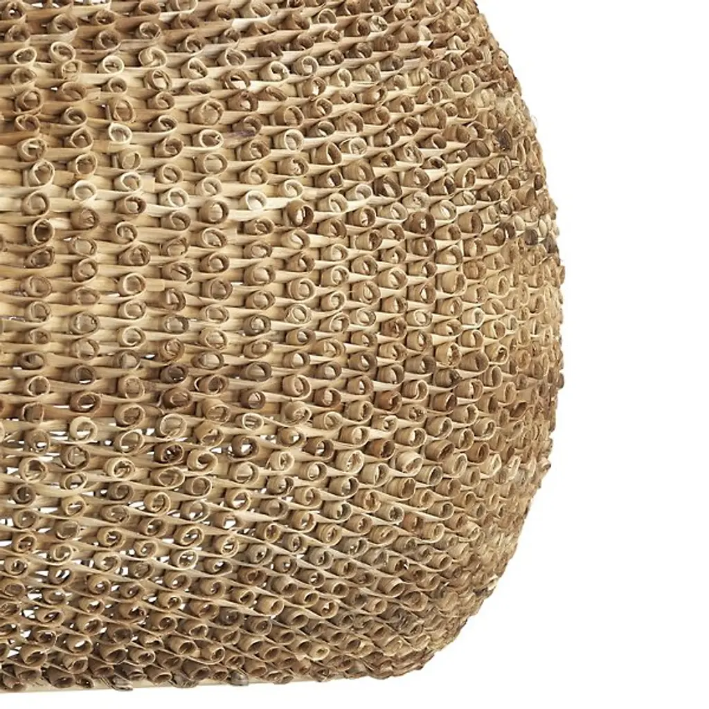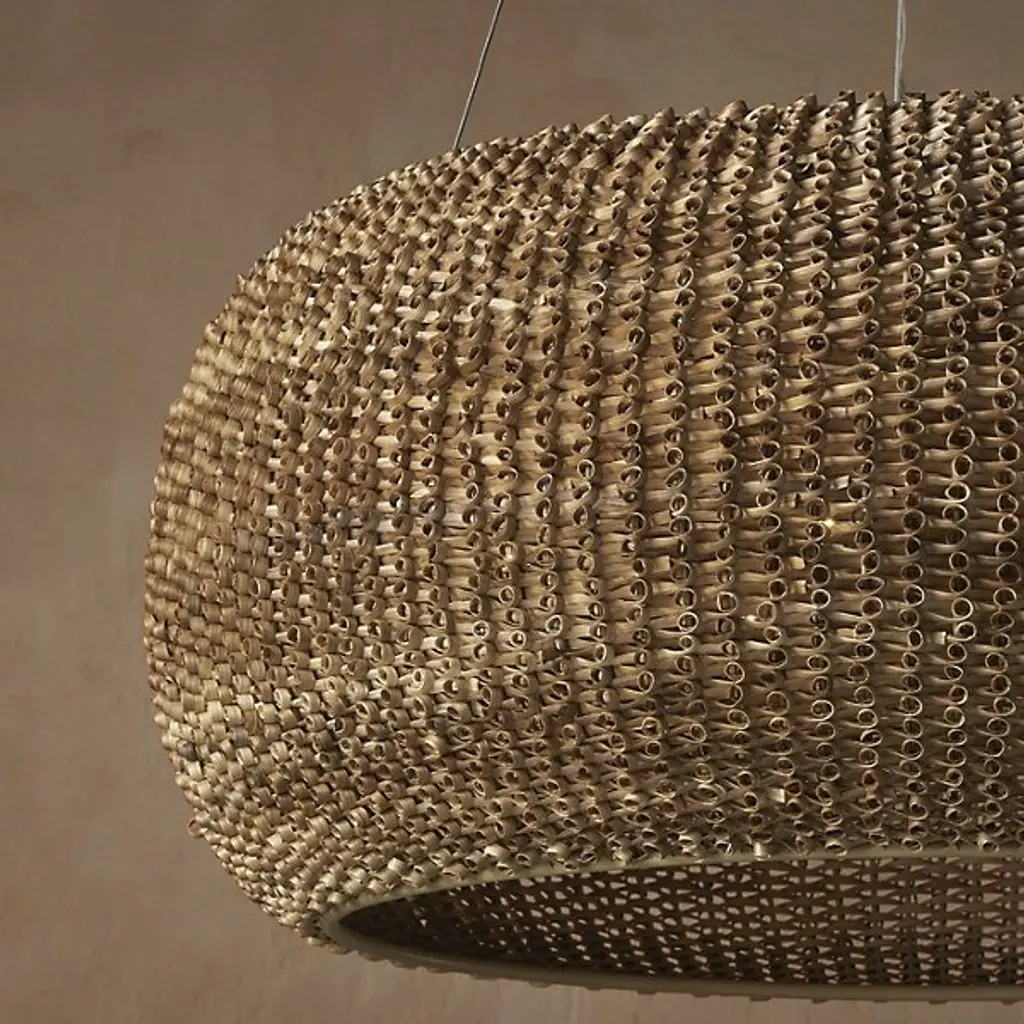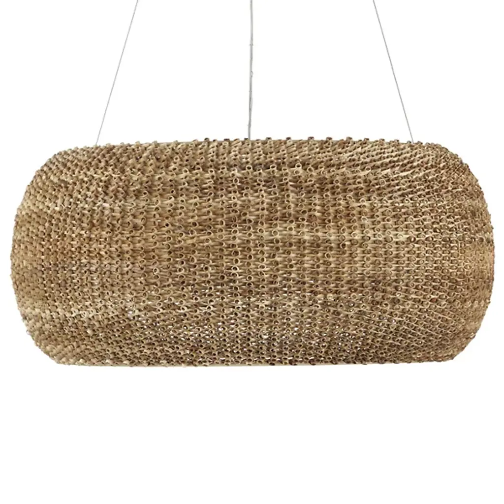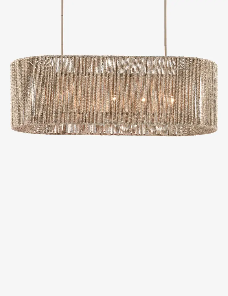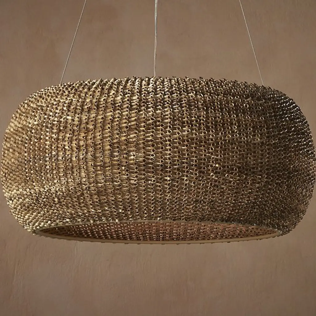 The Boucle Chandelier from Currey & Company showcases extraordinary rattan craftsmanship using traditional quilling techniques. Artisans meticulously curl and weave natural rattan strands to create intricate patterns with dimensional edges. The shade's complex construction requires precise hand-working to maintain consistent curves throughout the design. Suspended from a wrought iron frame, the woven dome creates patterns of light and shadow. The pendant's adjustable chain system allows for customizable hanging heights, with additional lengths available.