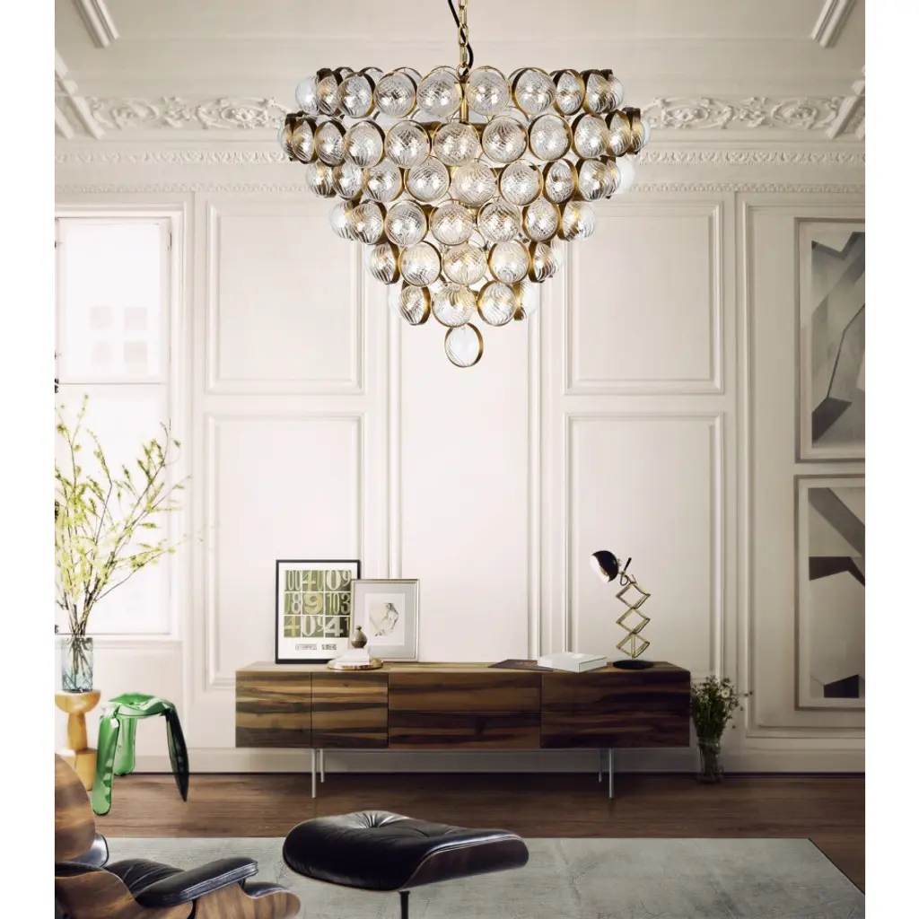 With a 31" diameter, the Bouquet chandelier displays multiple rows of Etched Glass balls graduating downwards for the overall impression of a bouquet bursting with fresh blooms. Accented in Aged Brass, this 8 light chandelier combines elegant and contemporary styles, perfecting the sophisticated look that will work in your dining room, kitchen or bathroom.