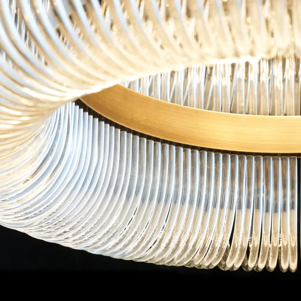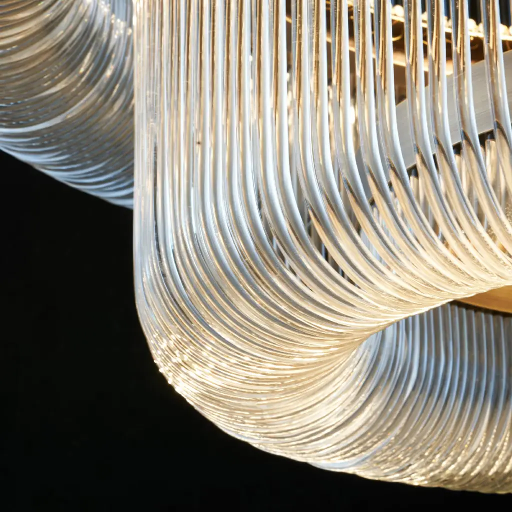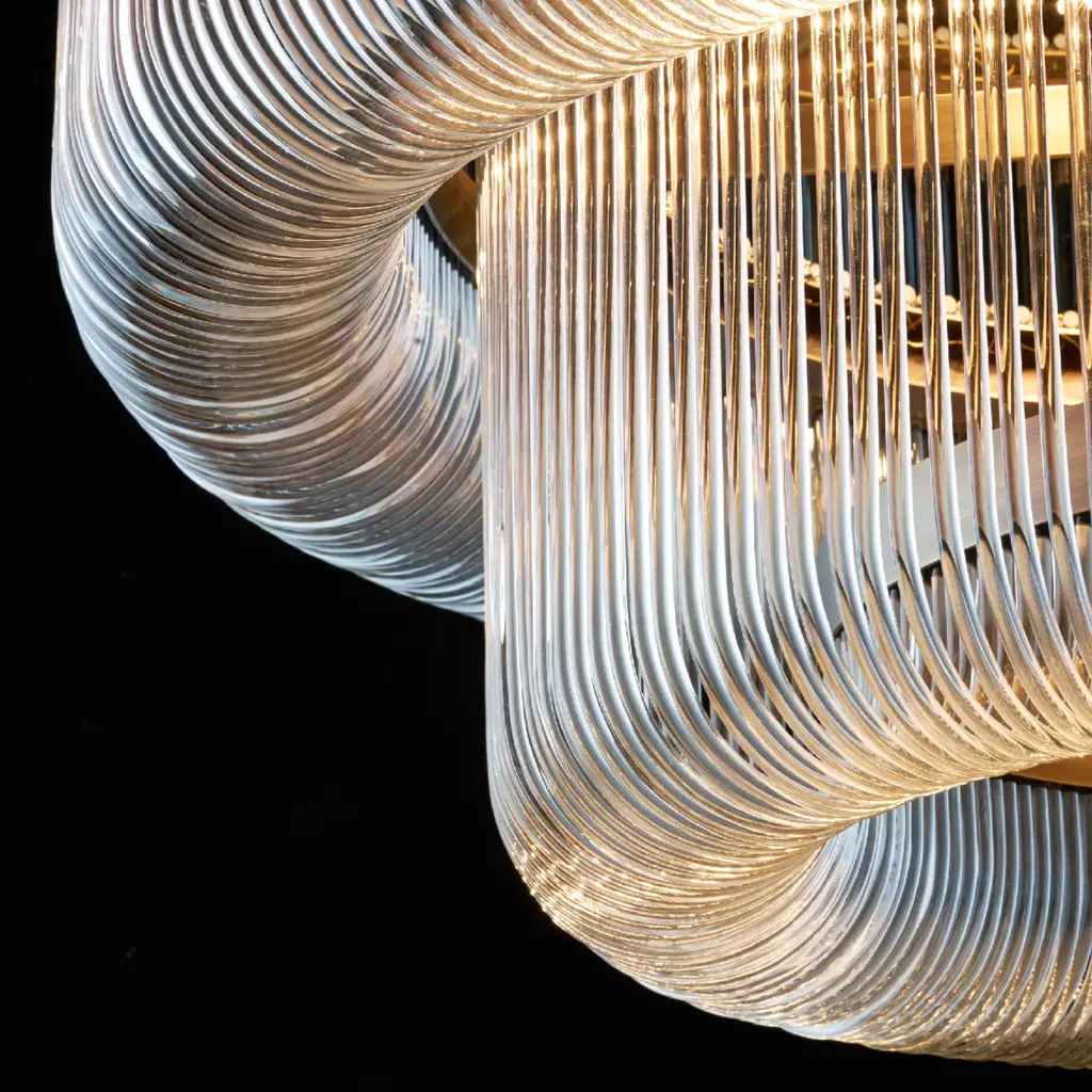 The modern Bovola chandelier is a handcrafted creation inspired by Art Deco. The chandelier is crafted in bronze and the lampshade consists of hand-made clear glass rods. The 24 light-bulbs are type: G9 max 33W. The type of light, light control, glass color, metal finishing and size are all customizable. Contract and commercial certifications available upon request.