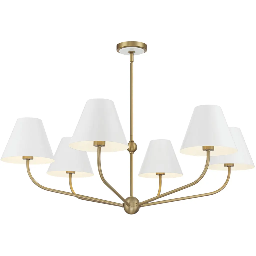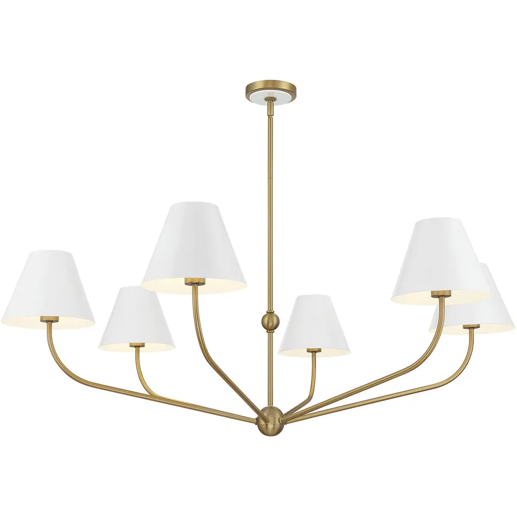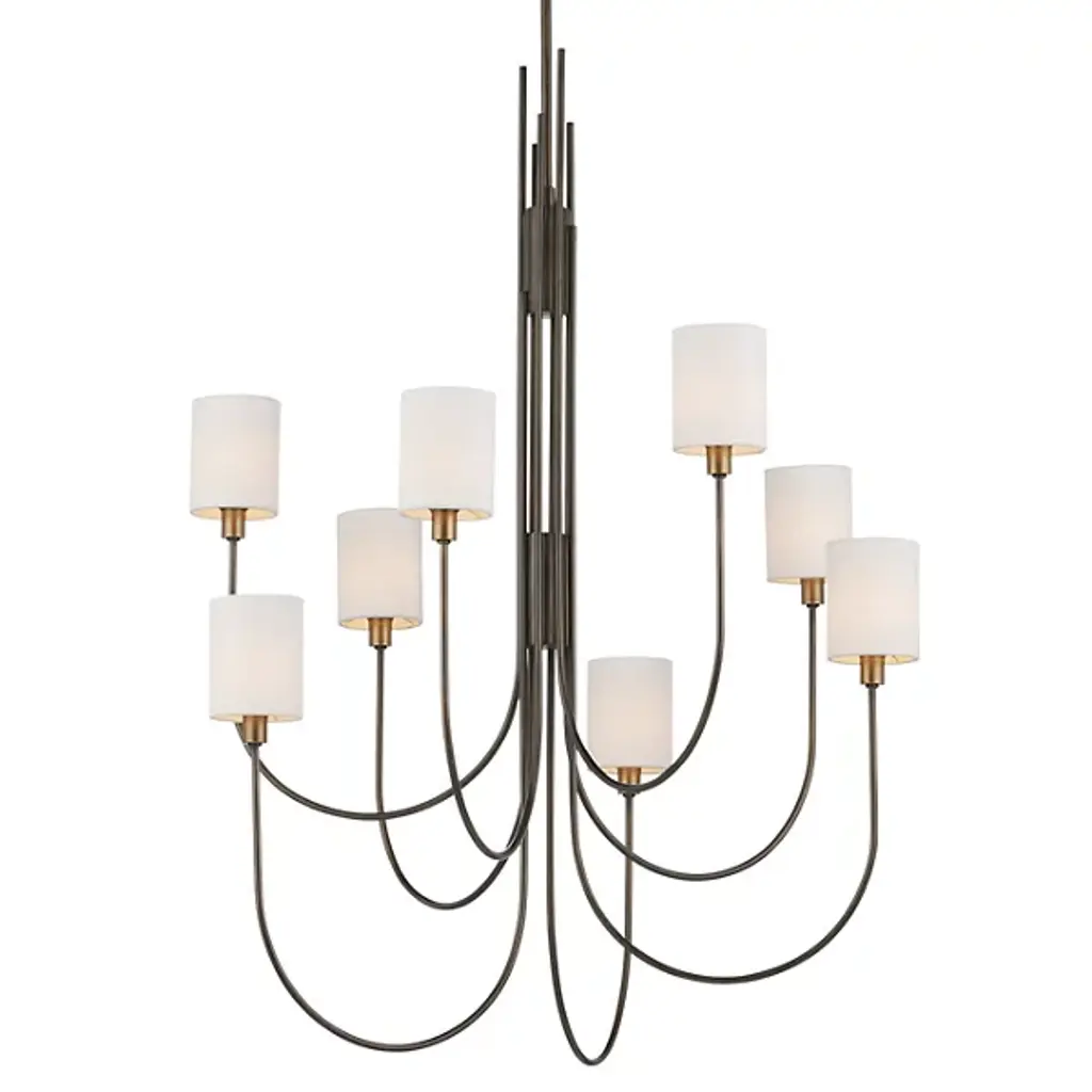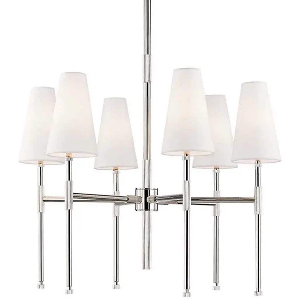 Exceptionally glamorous. Defined by its eye-catching silhouette, the Bowery 6-Light Chandelier by Hudson Valley Lighting features a narrow Metal fixture with 6 elongated stems set below Linen shades that are rolled at the edges. Banded, textural accents adorn the center of the stems, adding a touch of industrial appeal to its otherwise refined, transitional look. A stylish light source in the grand entryway, formal dining space or master bedroom, this chandelier casts a soft white light from incandescent bulbs.