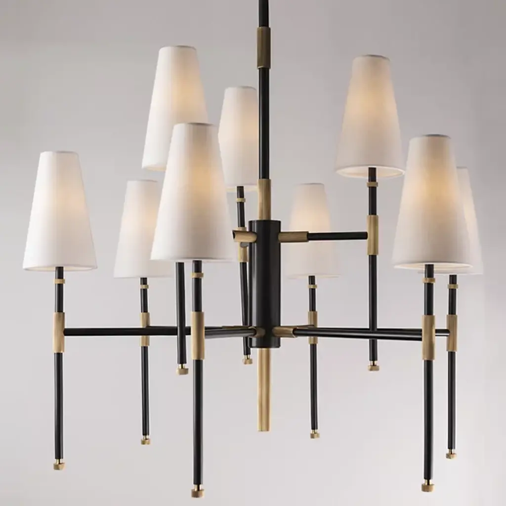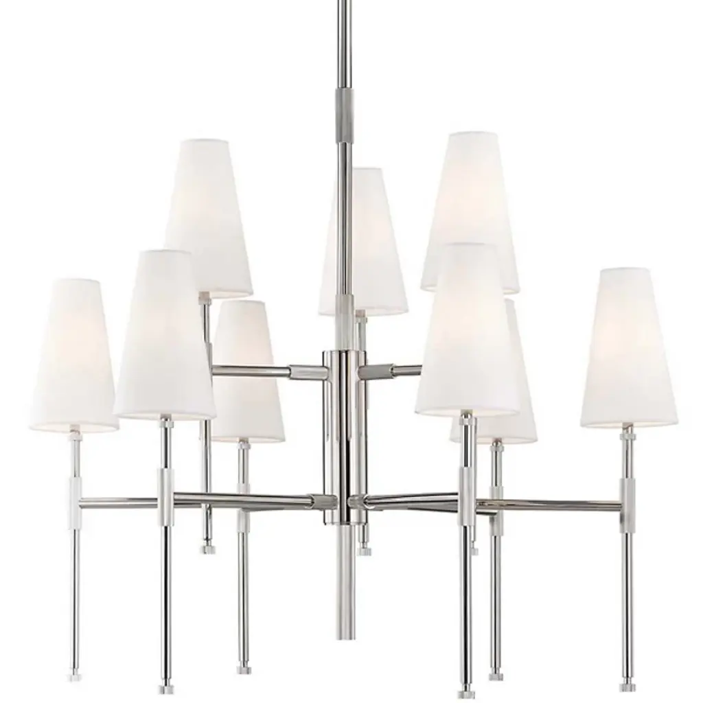 Where modern sensibility and high style meet. Impressively made of Metal, The Bowery 9-Light Chandelier by Hudson Valley Lighting flaunts a 2-tier frame with 9 elongated stems topped with Linen shades that are rolled on both edges. The center of each stem features textural, ribbed accents, adding a hint of industrialism to its otherwise refined, modern features. A perfect addition to the grand entryway, master bedroom or dining space, this design casts a soft white light from incandescent bulbs fixed to E12 candelabra bases.