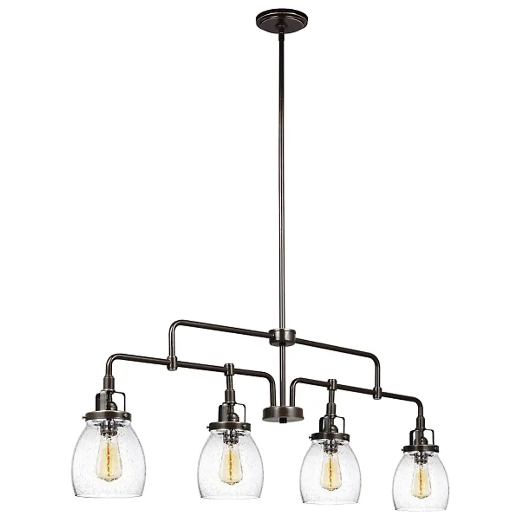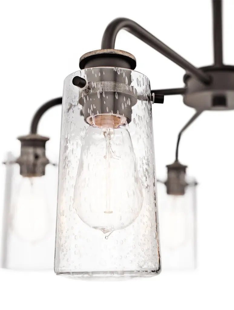 The Braelyn 11.25in. 5 light chandelier features an Olde Bronze finish and clear seeded glass shades. The Braelyn offers a vintage industrial design that works well with rustic, country and lodge decor.