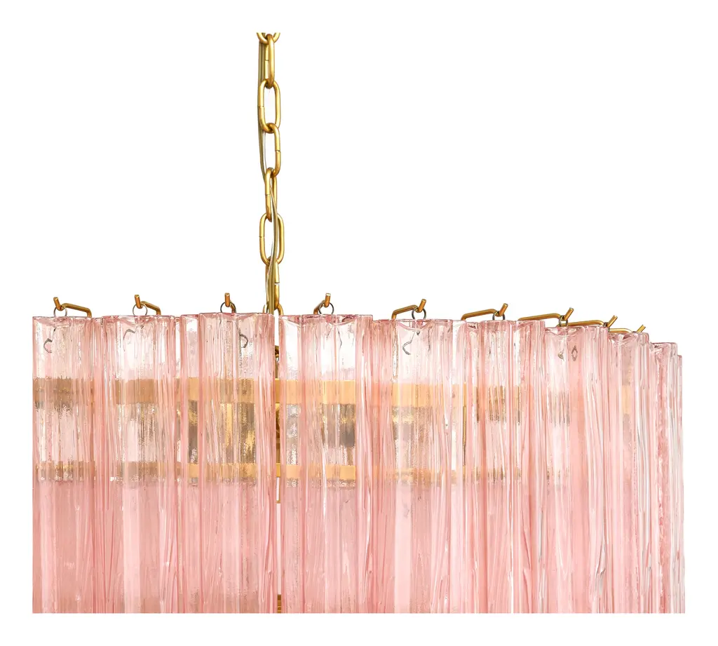 Give your space instant wow factor with our Brahms Chandelier. The picture of Hollywood Regency elegance, Brahms features three tiers of fluted glass tubes in a soft, rosy pink hue, which dangle from a stain brass-finished iron frame. All of this is suspended from a matching brass chain, which allows you to adjust its drop from the ceiling to suit your space. Sure to instantly up the style of any space, Brahms would be great in a chic foyer, adding a luxe pop of color over the dining table or as the perfect finishing touch in a moody, modern bedroom. •rose tinted glass•plated iron with satin brass finish•adjustable brass chain •requires 40W max/type E14 bulb x 10•hardwire Dimensions•28.5" diameter x 20.5"H•canopy: 4.75" diameter x 1.25"H •chain: 71" long