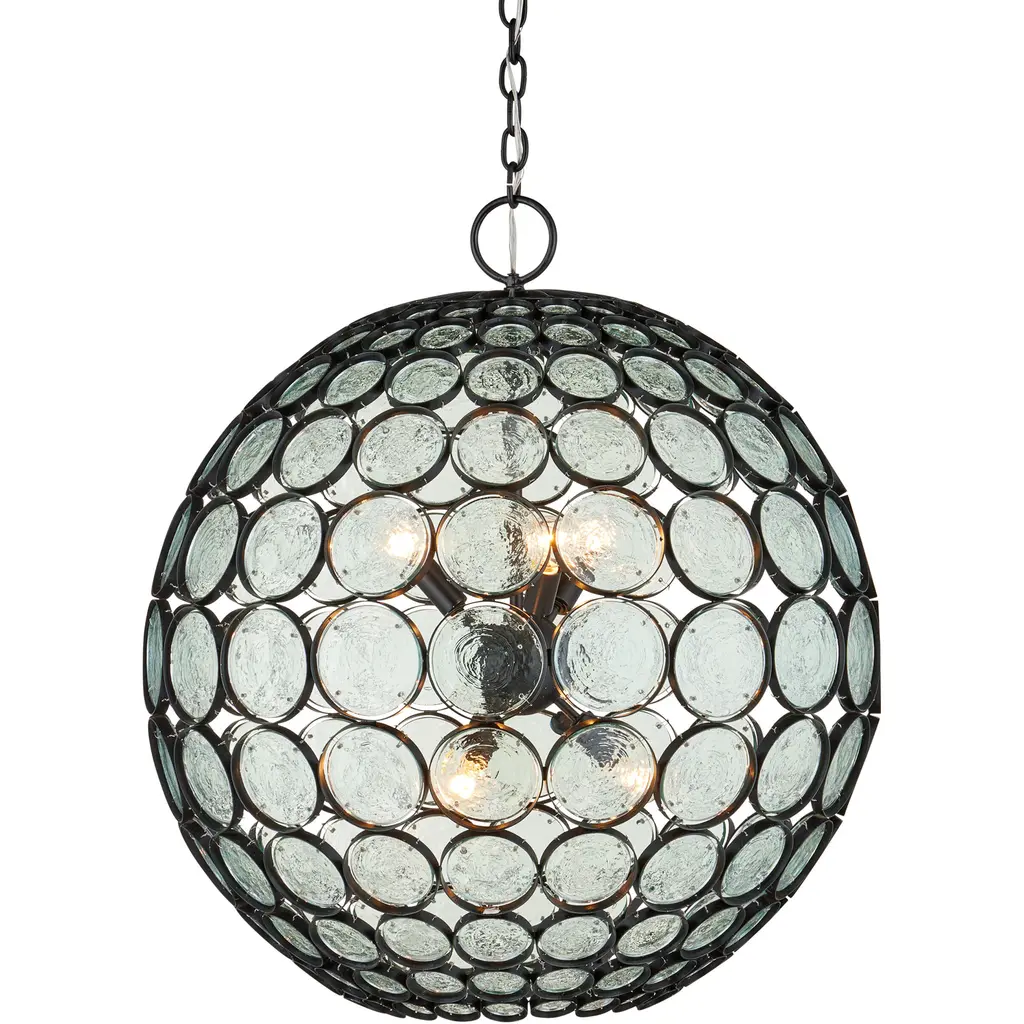 Recycled glass discs dangle from the wrought iron frame of the Braithwell Chandelier to form a textural shade that turns the light emanating through it into a mottled mosaic. The discs vary in size and overlap to form this ecofriendly artistic statement. The metal of the 14-light fixture has been treated to a painted silver Granello finish that adds to its gleaming artistry.