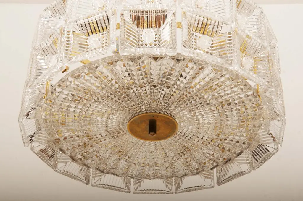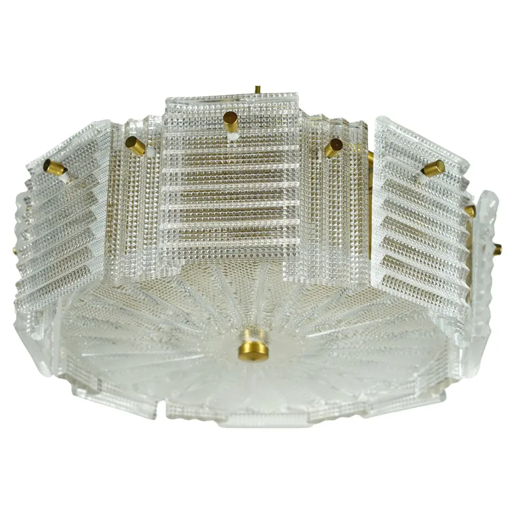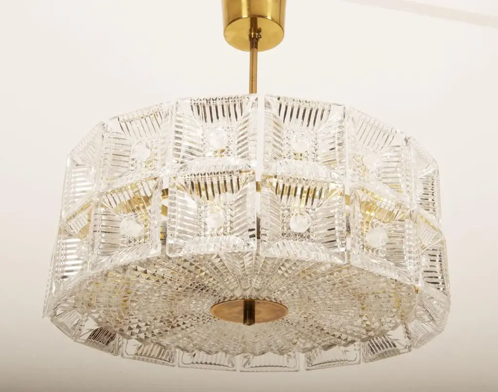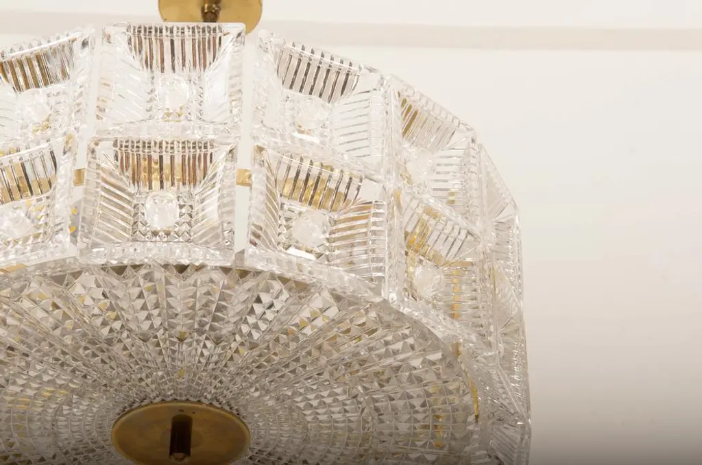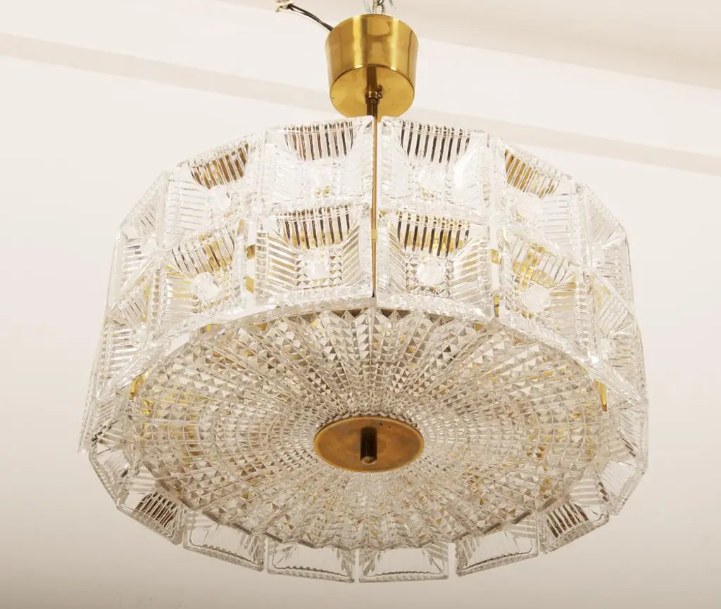 Brass construction with pressed glass, fitted with six e27 sockets, designed in the 1960s in sweden by carl fagerlund for orrefors glassworks. dimensions h 17.72 in. X dm 16.93 in h 45 cm x dm 43 cm diameter 16.93 in. (43 cm) this piece has an attribution mark, i am sure that it is completely authentic and take full responsibility for any authenticity issues arising from misattribution, european plug (up to 250v).the wiring of this item may be original and might need replacement, if not specified otherwise.