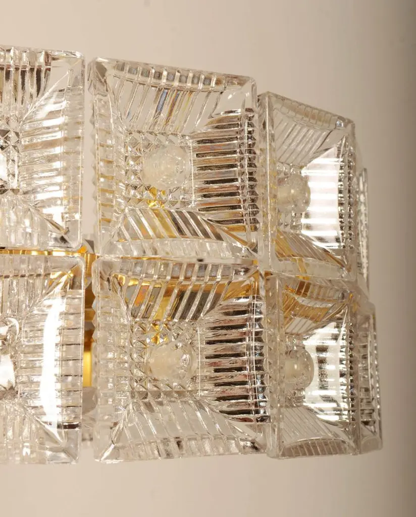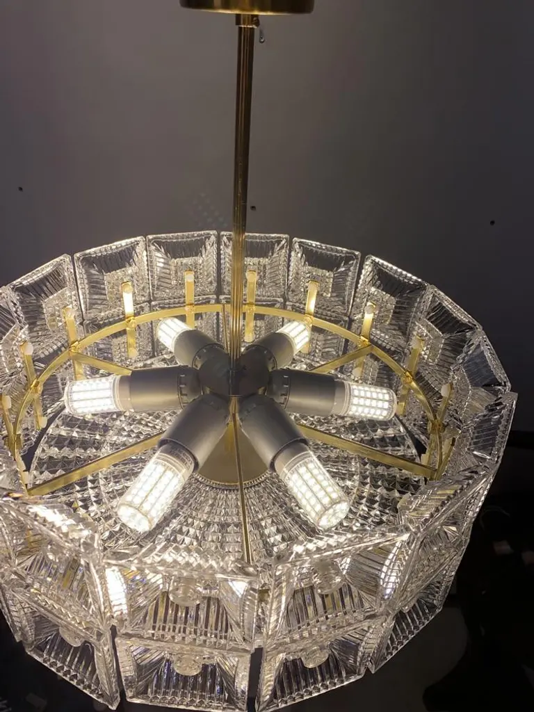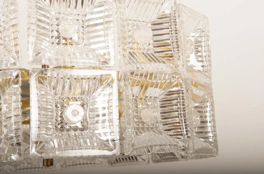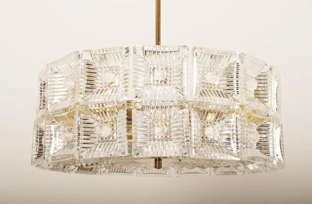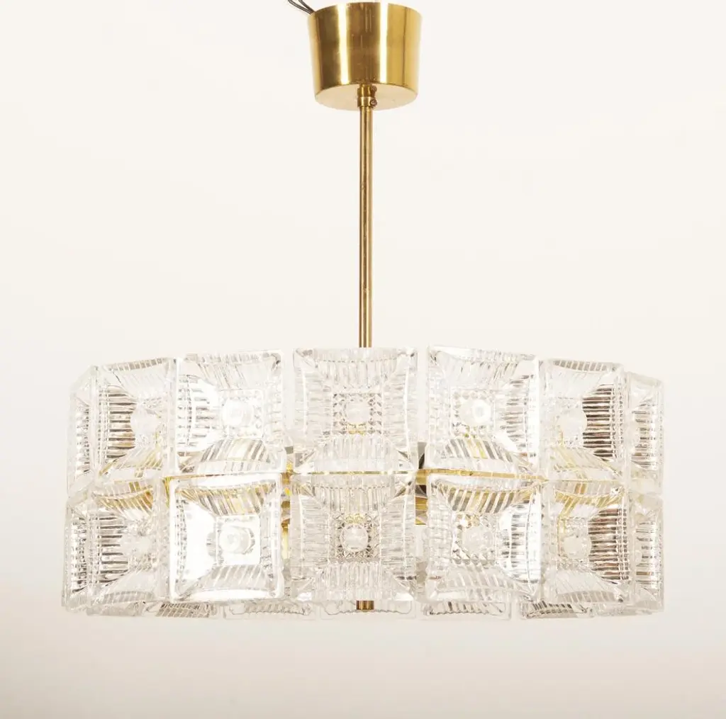 Brass construction with pressed glass, fitted with six e27 sockets, designed in the 1960s in sweden by carl fagerlund for orrefors glassworks. dimensions h 17.72 in. X dm 16.93 in h 45 cm x dm 43 cm diameter 16.93 in. (43 cm) this piece has an attribution mark, i am sure that it is completely authentic and take full responsibility for any authenticity issues arising from misattribution, european plug (up to 250v).the wiring of this item may be original and might need replacement, if not specified otherwise.