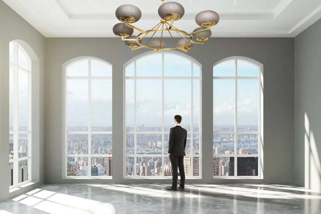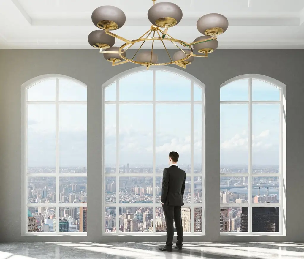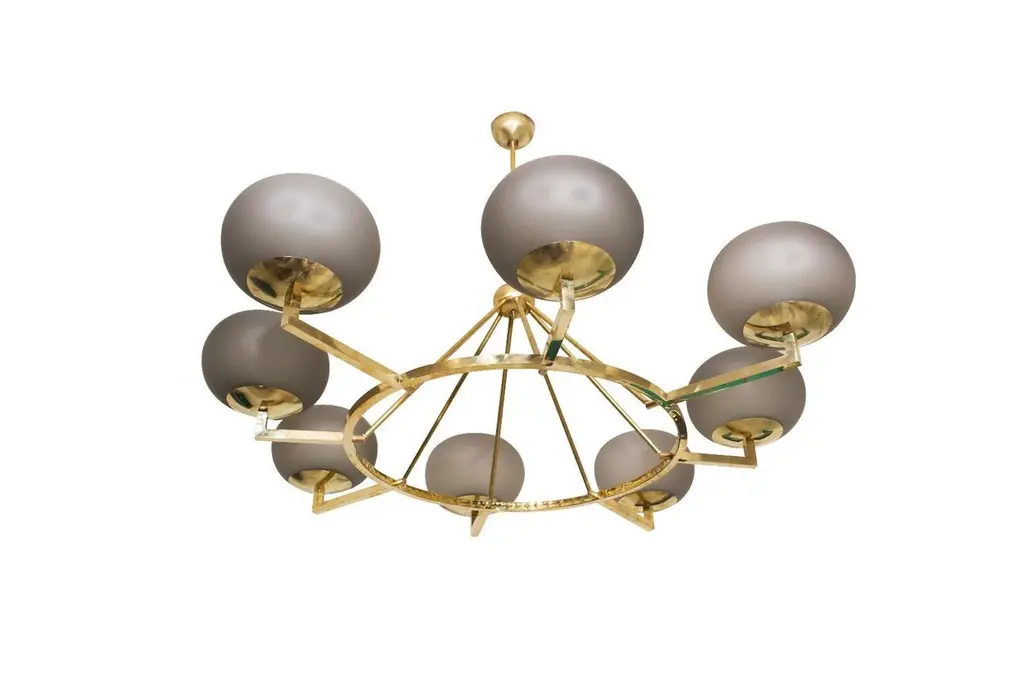 Extraordinary Italian brass and light grey opaline sphere Murano glass chandelier.Inspired by Stilnovo, the iconic midcentury manufacturer.Available also a pair. The brass height is customizable.8 E27 light bulbs.