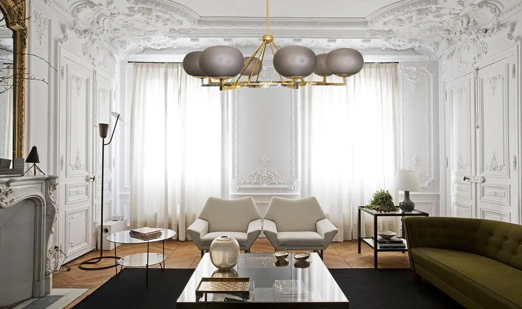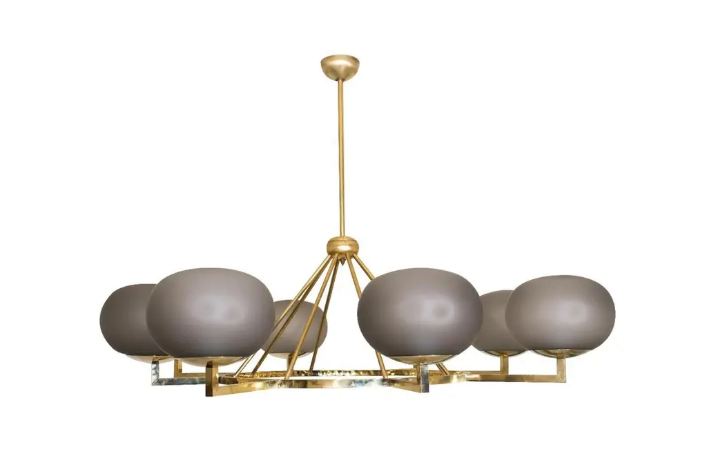 Brass And Grey Opaline Murano Glass Large Modern Chandelier Stilnovo Style
