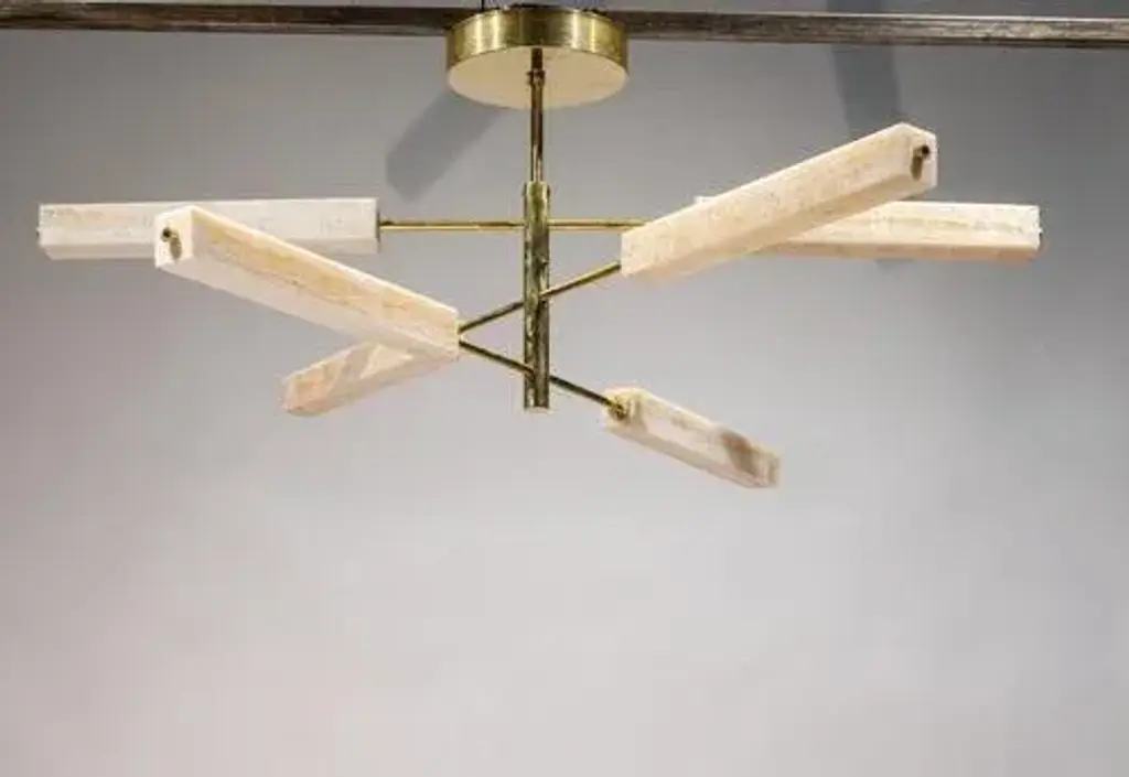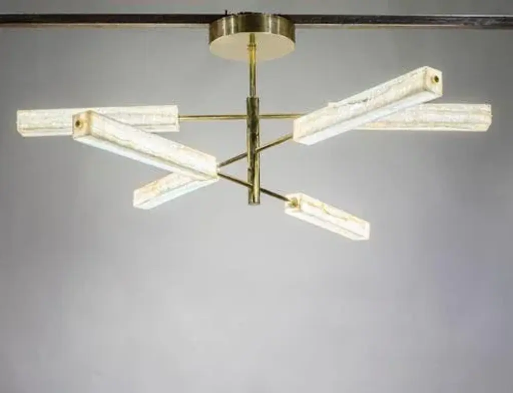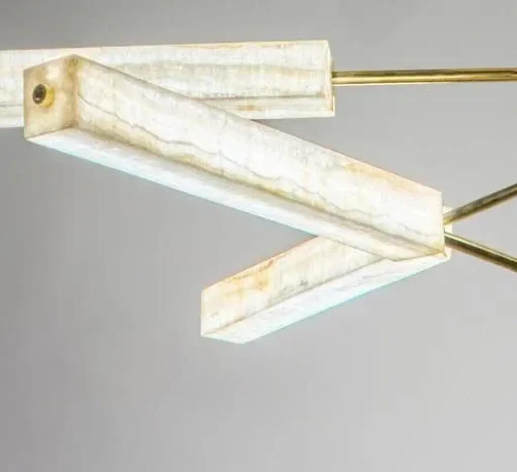 The Monolite is a unique brass and ivory-toned onyx chandelier designed by Silvio Piattelli. It combines classical materials with modern design to create a truly timeless piece. The onyx has been carefully chosen in quarries in the Middle East for its unique veining, high translucency, and enhancement of the warmth of light output. Crafted lovingly in Italy, the rectangular “monolithic” shades appear as one whole piece of stone, giving the fixture a very special, otherworldly feel. The onyx shades on the ends of the arms can rotate, allowing for endless possibilities when it comes to adjusting the geometry of the chandelier. You can create different groupings and clusters of arms, making it the perfect piece for any setting or occasion. The Monolite is also versatile enough to illuminate any space, and the standard version includes a state-of-the-art non-flickering dimmable driver that is hosted in the canopy, ensuring the perfect amount of light without any annoying flickering. Labeled by Maker, Up to 250V (Europe/UK Standard).