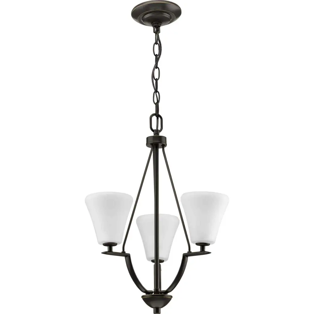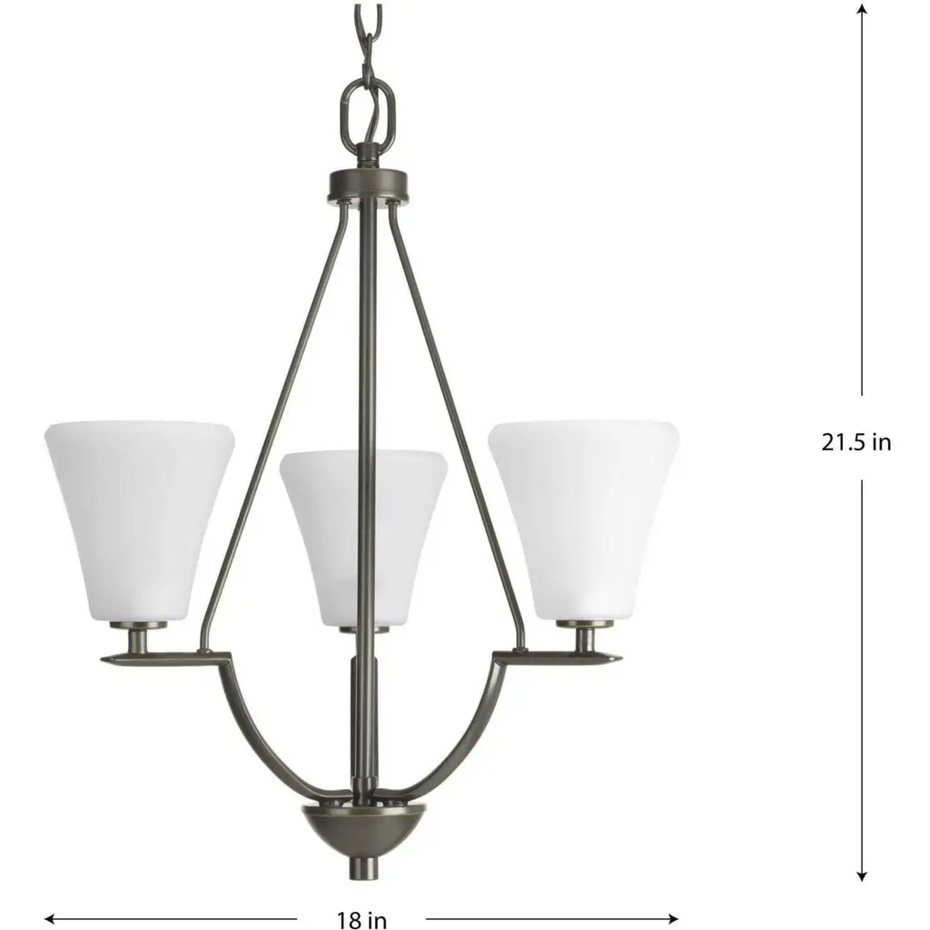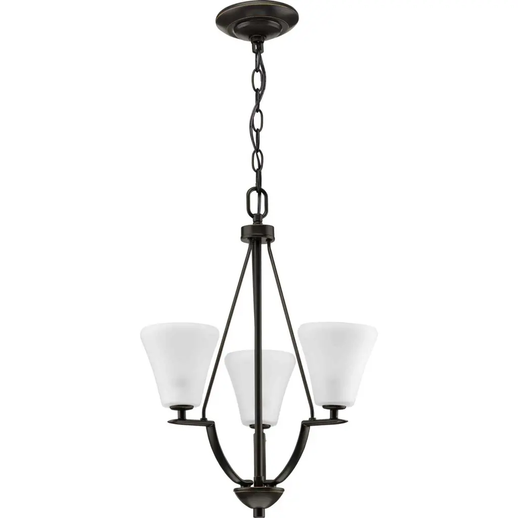 Three-light chandelier/foyer with white etched glass from the Bravo collection. Linear elements stream throughout the fixture to compose a relaxed but exotic ambiance. Generously scaled glass shades add distinction against the Antique Bronze finish and provide pleasing illumination to your room. Bravo possesses a smart simplicity to complement today's home entirely with confidence and style.