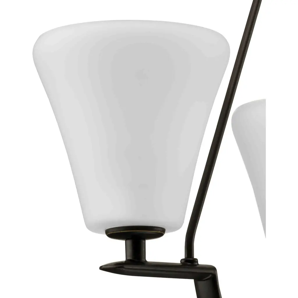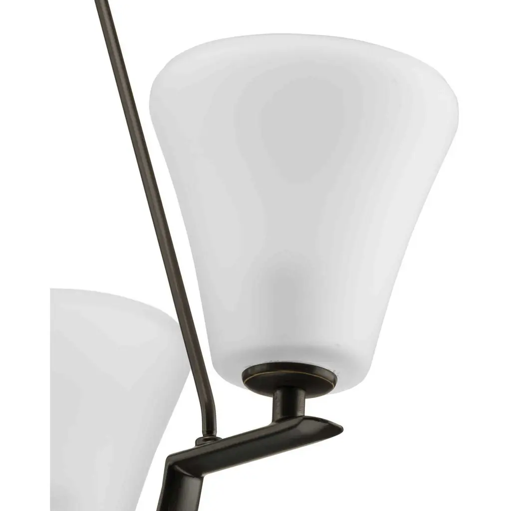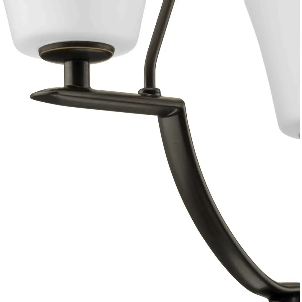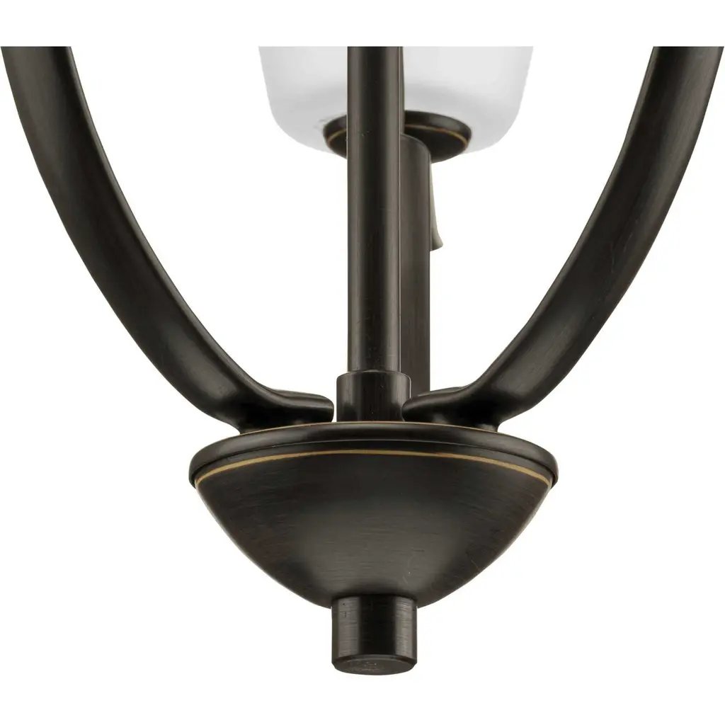 Three-light chandelier/foyer with white etched glass from the Bravo collection. Linear elements stream throughout the fixture to compose a relaxed but exotic ambiance. Generously scaled glass shades add distinction against the Antique Bronze finish and provide pleasing illumination to your room. Bravo possesses a smart simplicity to complement today's home entirely with confidence and style.