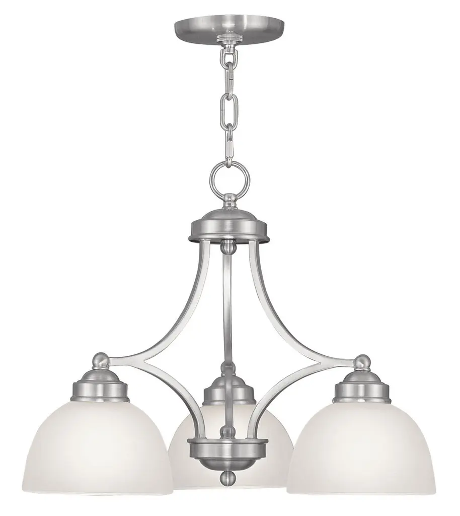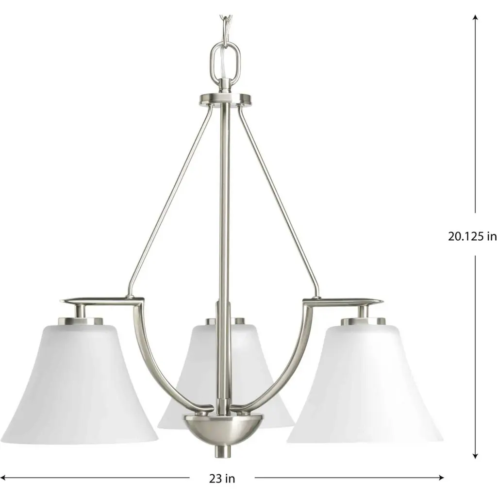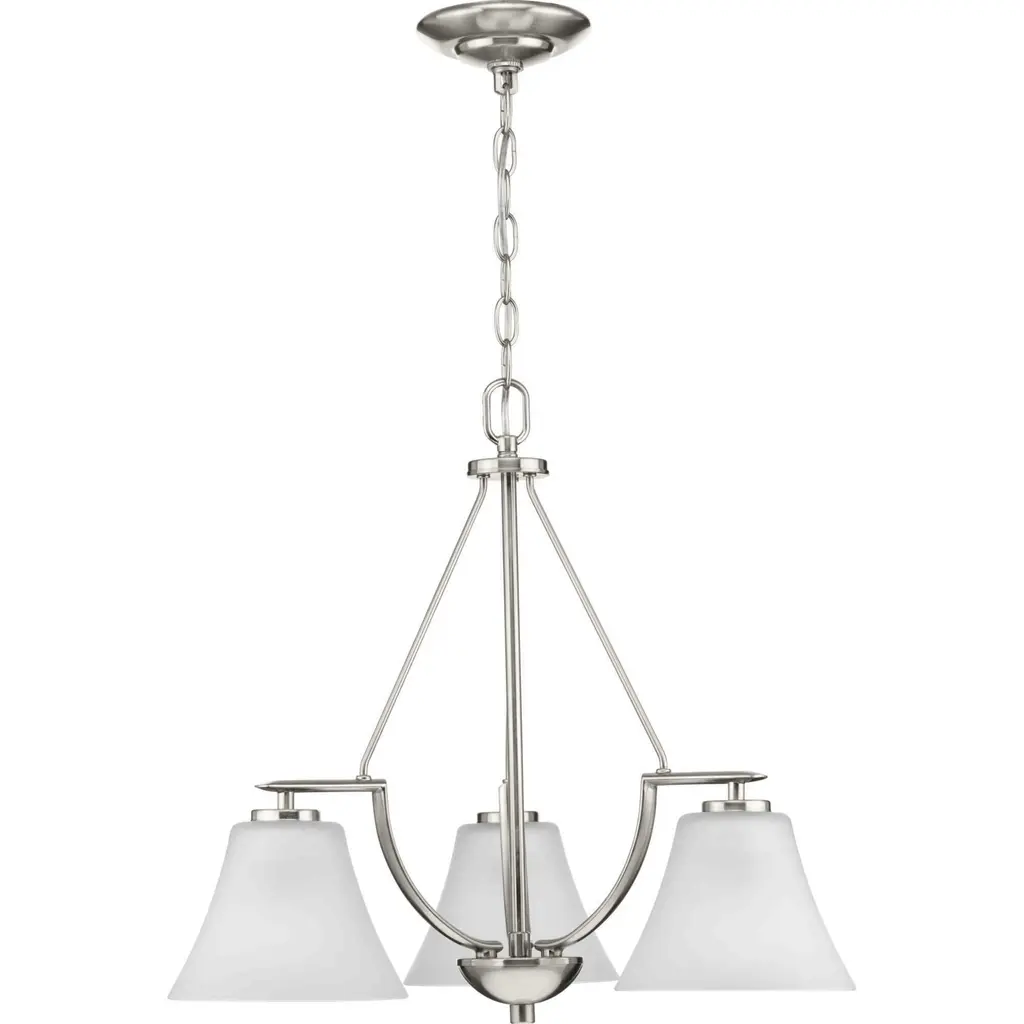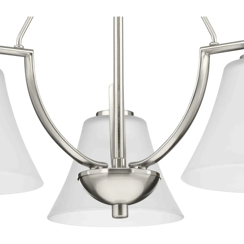 Three-light down chandelier with white etched glass from the Bravo collection. Linear elements stream throughout the fixture to compose a relaxed but exotic ambiance. Generously scaled glass shades add distinction against the Brushed Nickel finish and provide pleasing illumination to your room. Six feet of 9 gauge chain is supplied for ceiling chain mount. Bravo possesses a smart simplicity to complement today's home entirely with confidence and style.