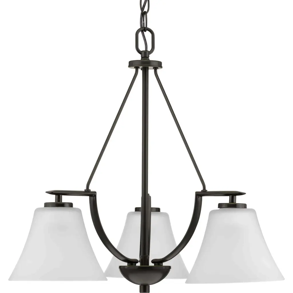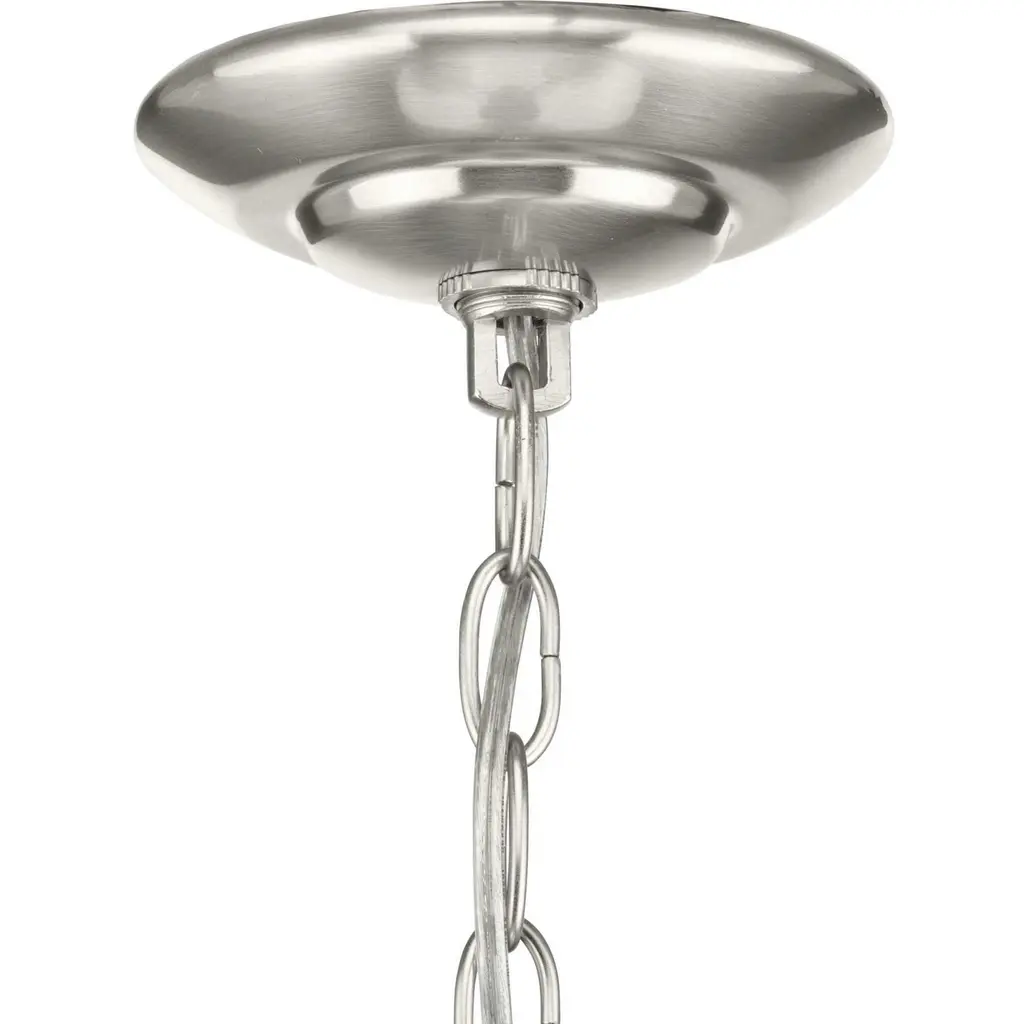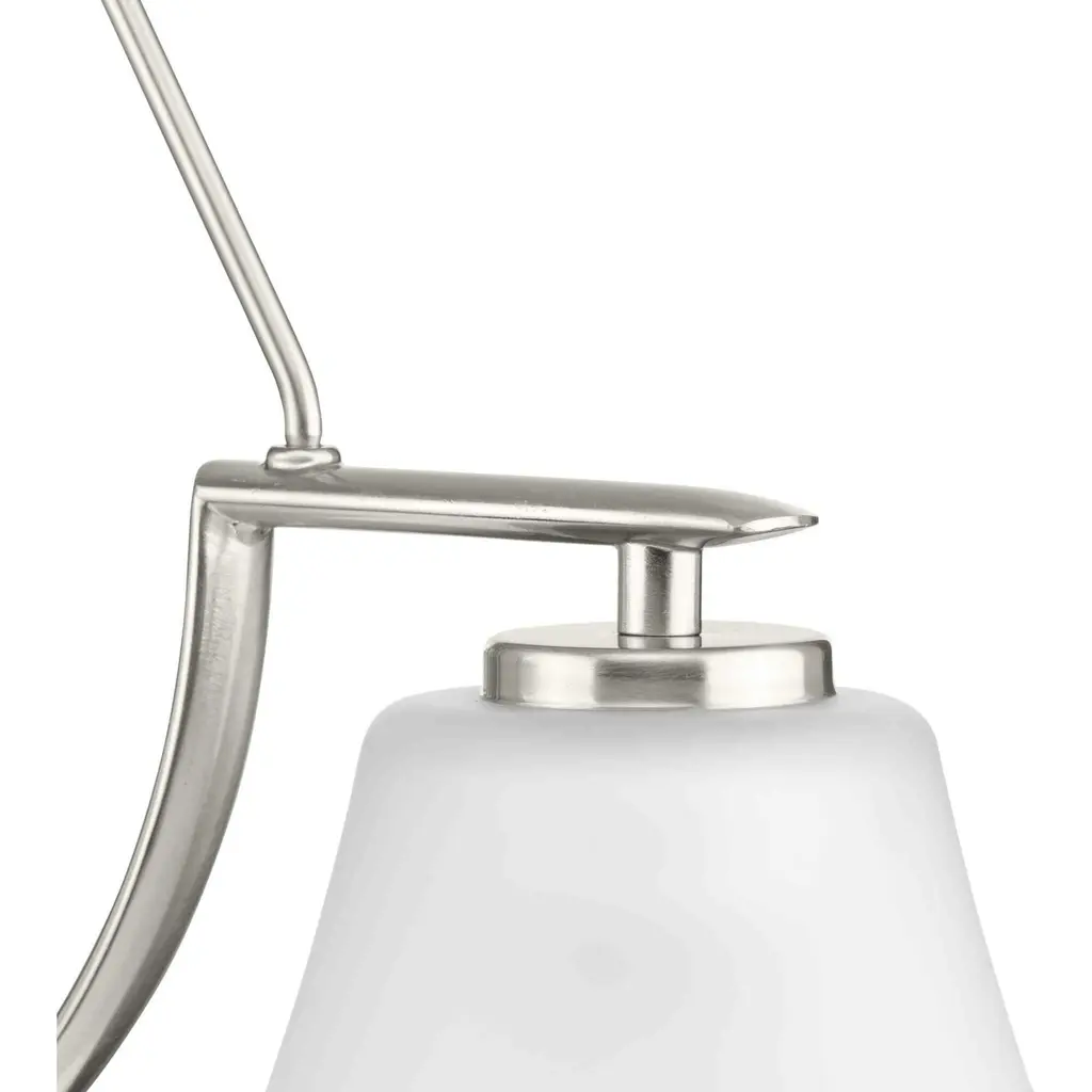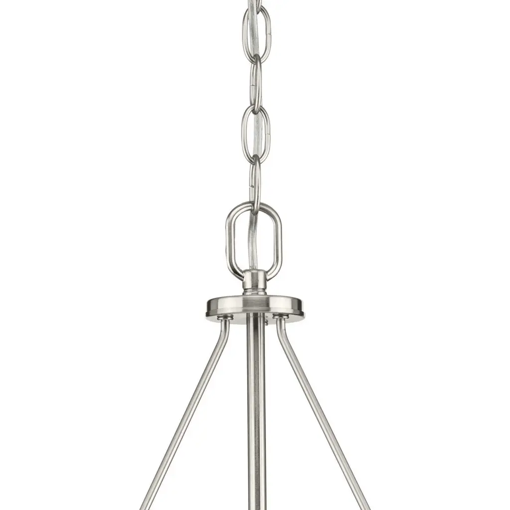 Three-light down chandelier with white etched glass from the Bravo collection. Linear elements stream throughout the fixture to compose a relaxed but exotic ambiance. Generously scaled glass shades add distinction against the Brushed Nickel finish and provide pleasing illumination to your room. Six feet of 9 gauge chain is supplied for ceiling chain mount. Bravo possesses a smart simplicity to complement today's home entirely with confidence and style.