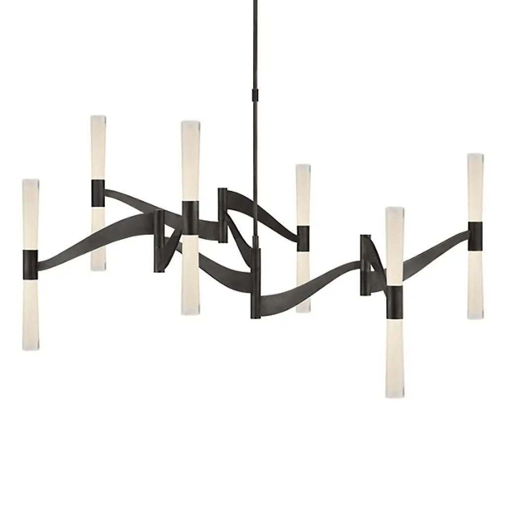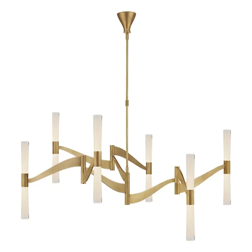 Bring a touch of the avant-garde to your home with the Brenta Grande Chandelier by Visual Comfort Signature, formerly known as Visual Comfort, From a ceiling canopy juts a downrod that secures to a collection of beautiful cylindrical lights. Brass is worked into an angular, swooping design. The metal undulates and intersects at various anchoring points to ensure that the light cylinders are held in an upright position. These cylinders emit bright light from LED bulbs, allowing your contemporary layout to be fully illuminated.