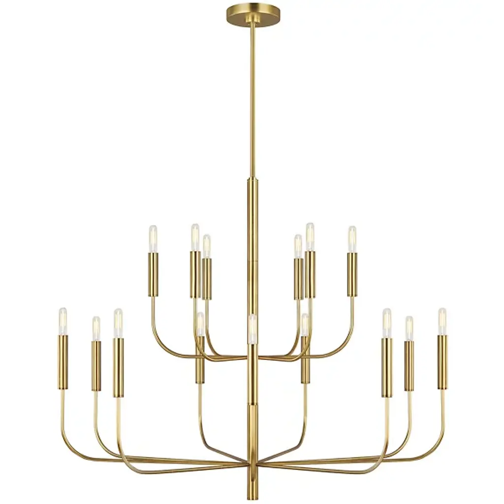 Modern, classical, with a sleek functional form. The Brianna 2-Tier Chandelier from Visual Comfort Studio, formerly known as ED Ellen DeGeneres, evolves from its medieval origin to a spectacular contemporary centerpiece. With a sleek metallic finish, the long elegant arms of the chandelier lift gently upwards, presenting its light towards the sky. These lights work in tandem to create a warm, ambient illumination ideal for entryways, dining rooms, and open living spaces. Comes with matching support rod and canopy.