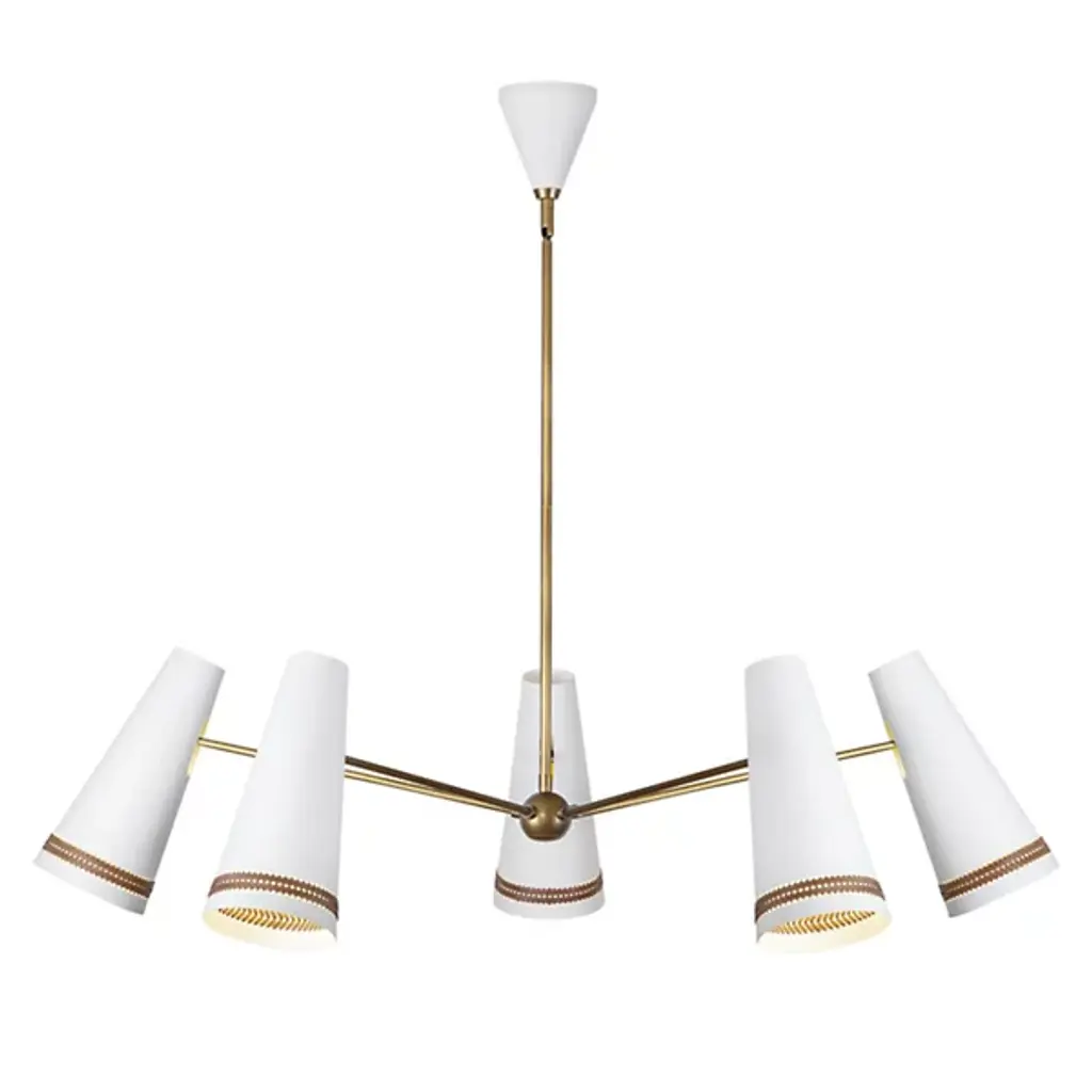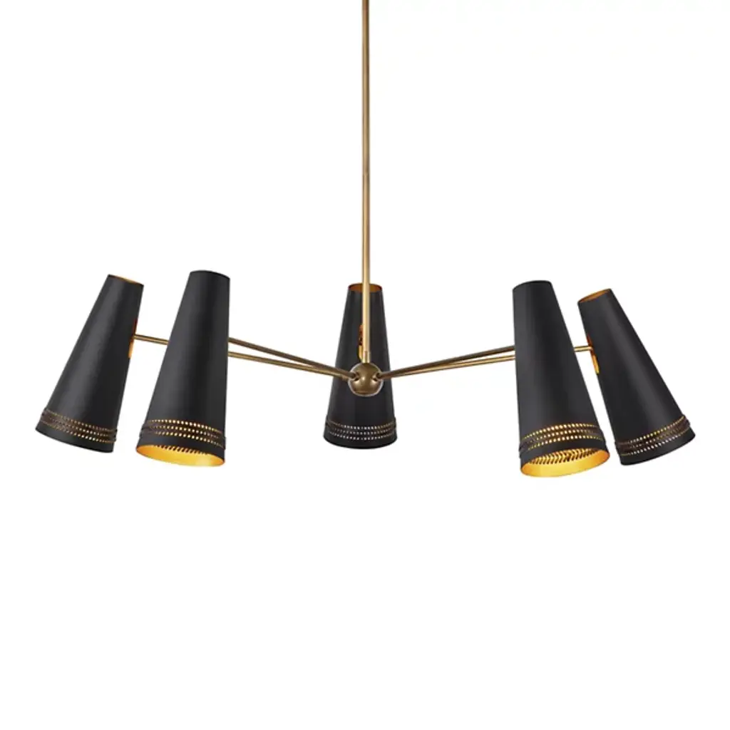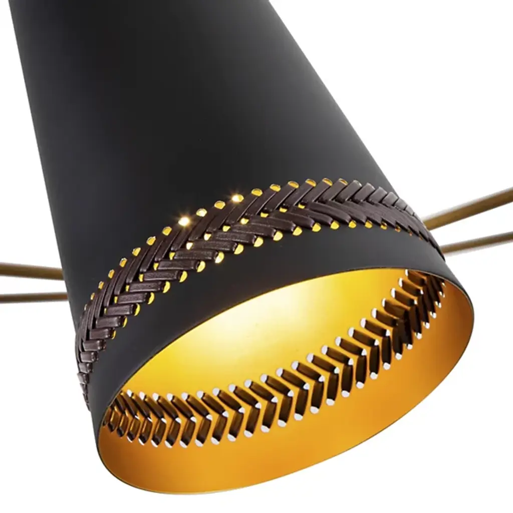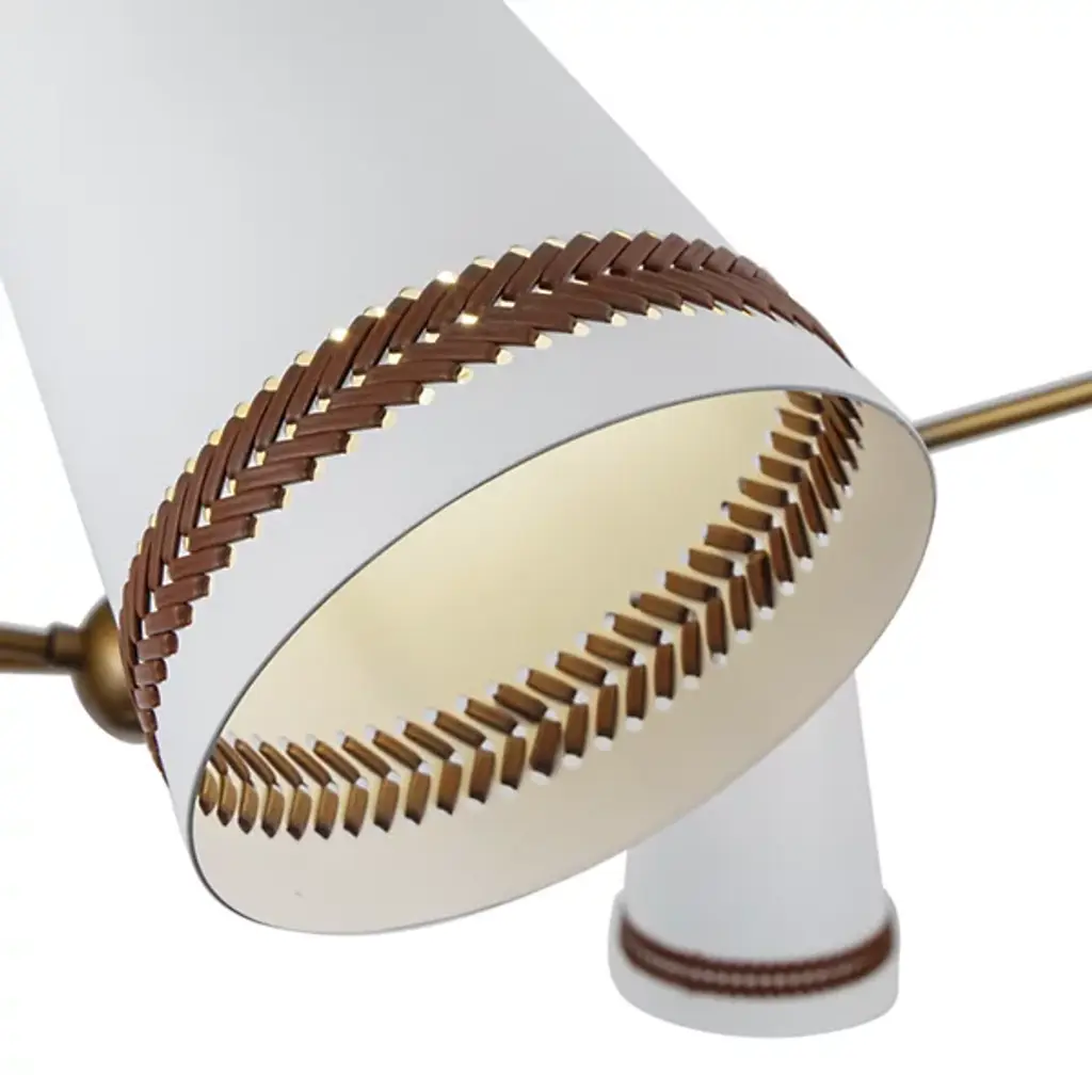 Interior elegance meets cleverly-wrought fashion within the Brickell Chandelier by Alora Lighting. Designed by Alan Pepin, it incorporates a lacing of hazelnut leather chevrons that texture midcentury silhouettes with artisanal allure. Strong spun steel cone shades are enriched with the leather’s warmth, innovatively melding rich materials. With leather lending its luxurious touch, Brickell’s angular lighting sculpts a mix of reflected radiance and focused downlight. This chandelier fashions modern sophistication through contrasting textures in a harmonious array.