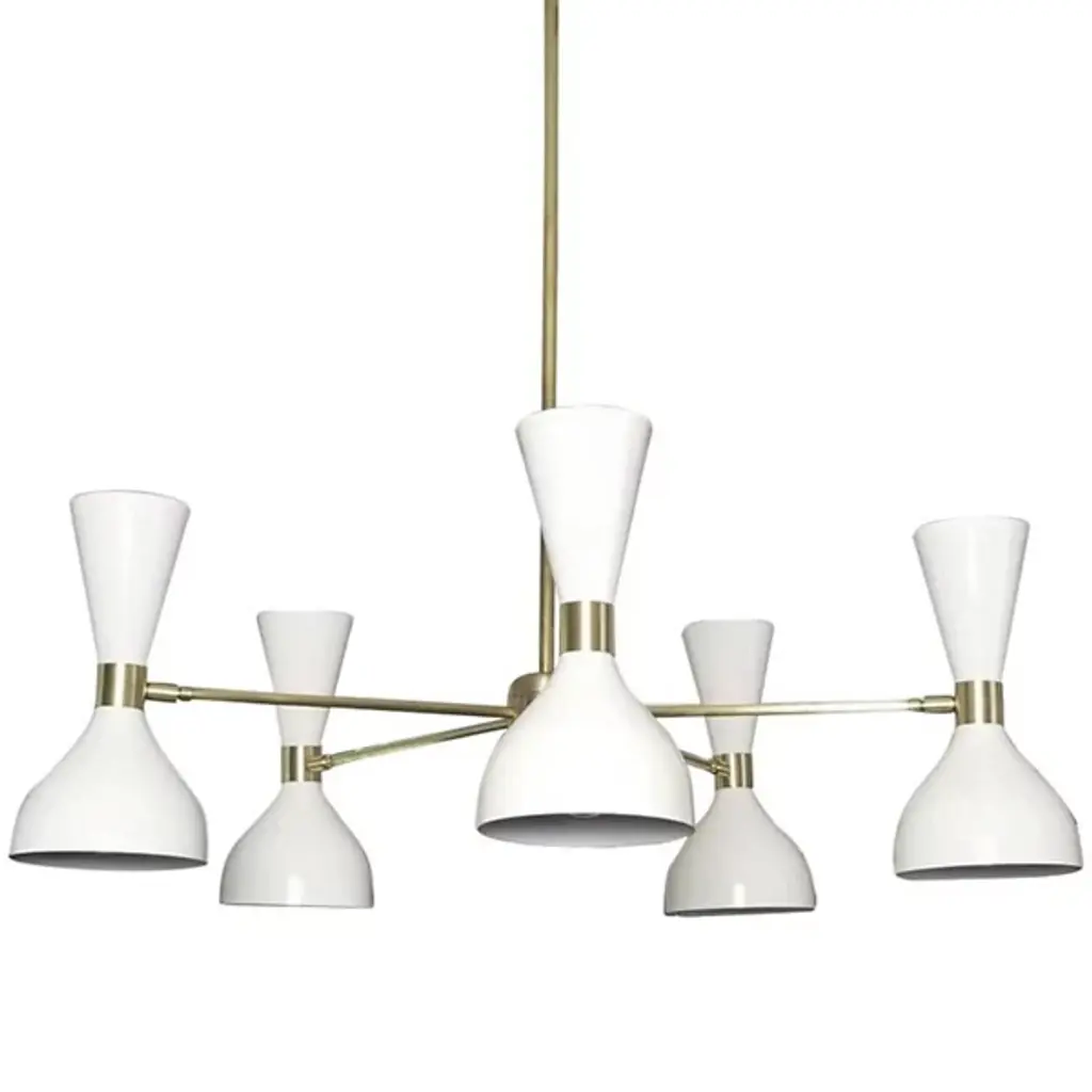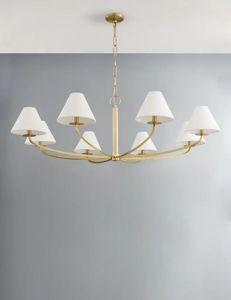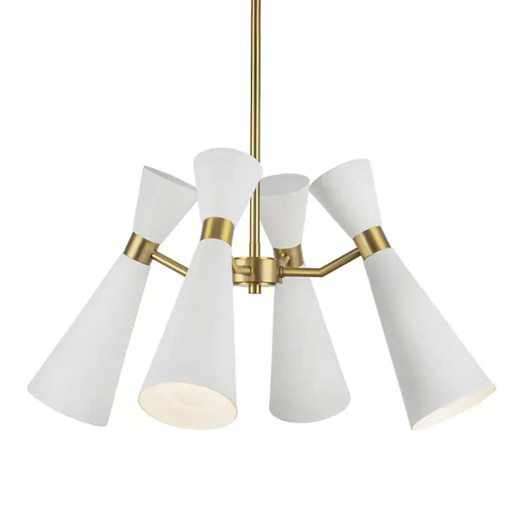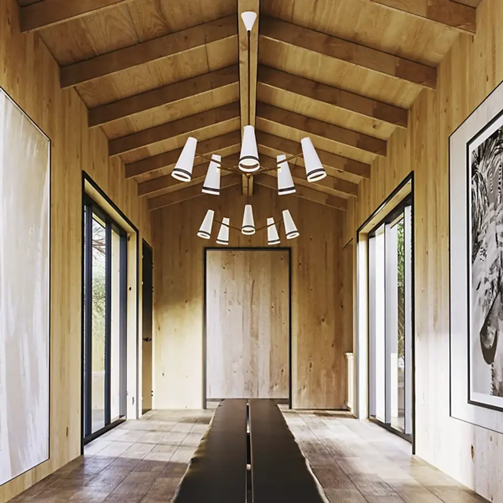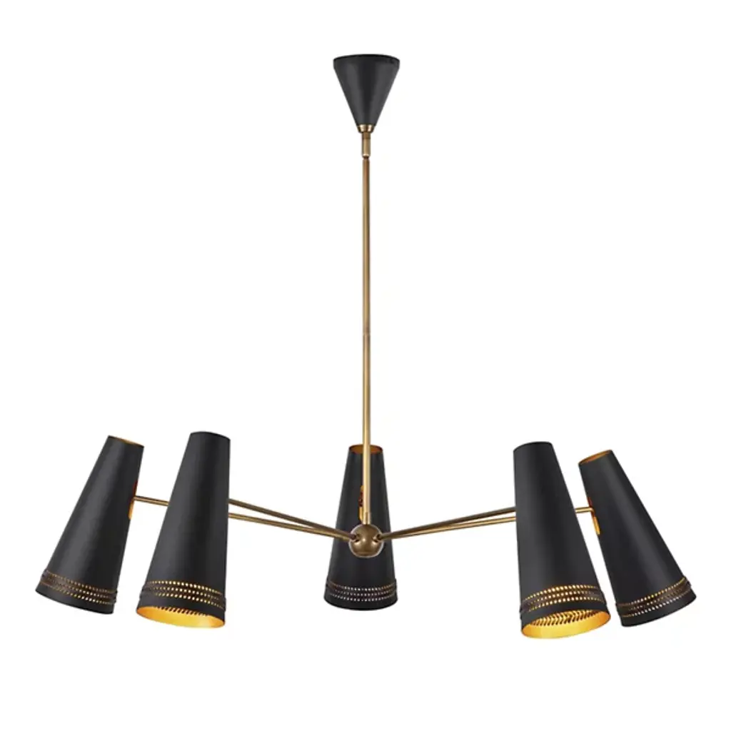 Interior elegance meets cleverly-wrought fashion within the Brickell Chandelier by Alora Lighting. Designed by Alan Pepin, it incorporates a lacing of hazelnut leather chevrons that texture midcentury silhouettes with artisanal allure. Strong spun steel cone shades are enriched with the leather’s warmth, innovatively melding rich materials. With leather lending its luxurious touch, Brickell’s angular lighting sculpts a mix of reflected radiance and focused downlight. This chandelier fashions modern sophistication through contrasting textures in a harmonious array.