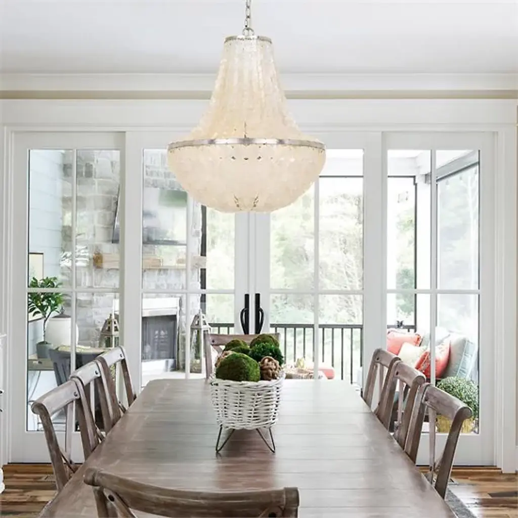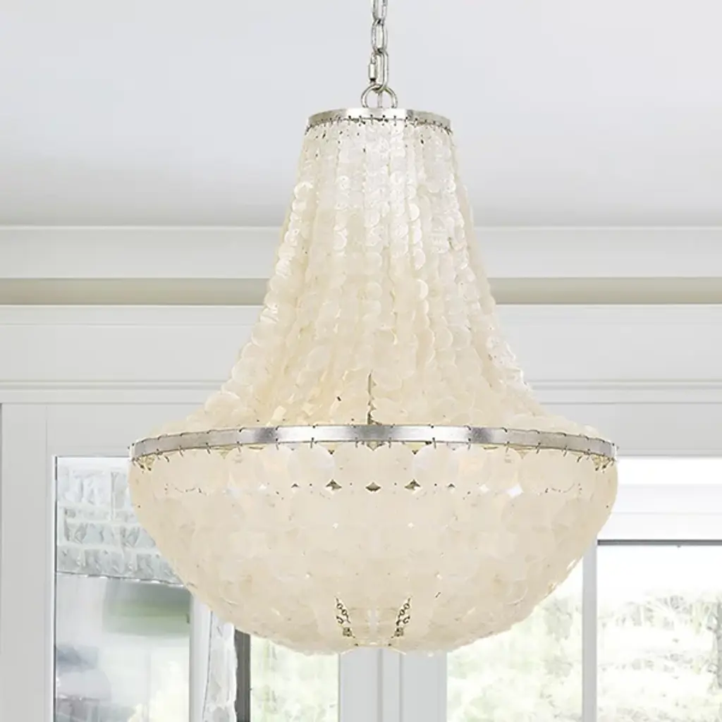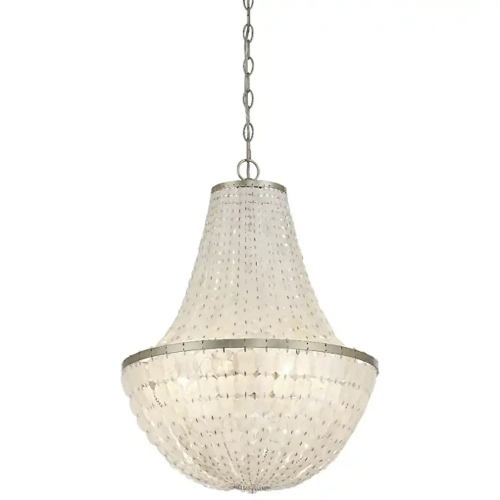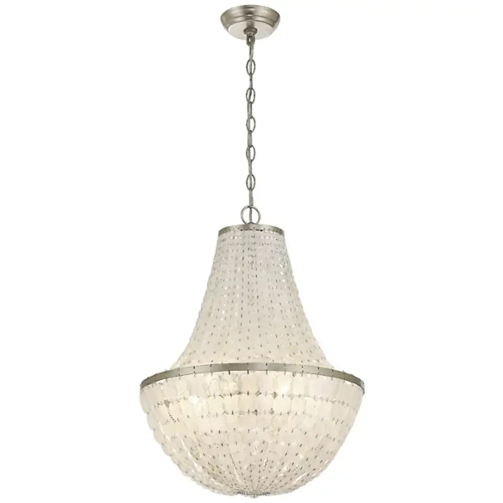 Embodies true elegance. Style a space to be grandly gorgeous with the addition of a Brielle BRI-3006 Chandelier by Crystorama. Visually striking with its cascading shell accents and iron ring frames, this chandelier is designed to make a statement and will deliver diffused illumination to elevate the ambiance of your home. It deserves to be the main attraction in a formal dining area or open concept living room where its shapely silhouette will truly shine.