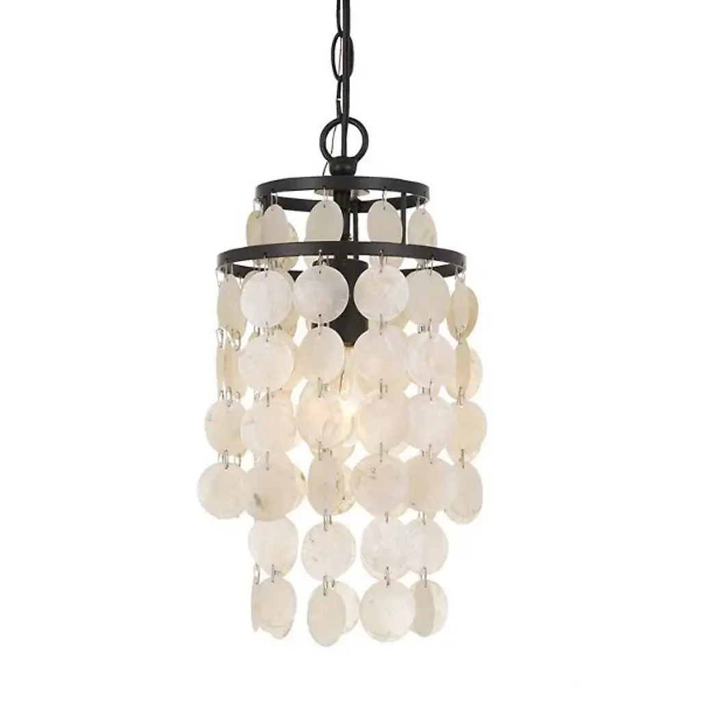 Designed to delight and dazzle. The Brielle Mini Chandelier by Crystorama is a beauty to behold. Circular shell accents in a layered composition cascade down from iron rings and act as elegant diffusers for the single socket hosted inside. Whether mounted in a foyer or above a dining room table, this mini chandelier ensures your space shines with style.