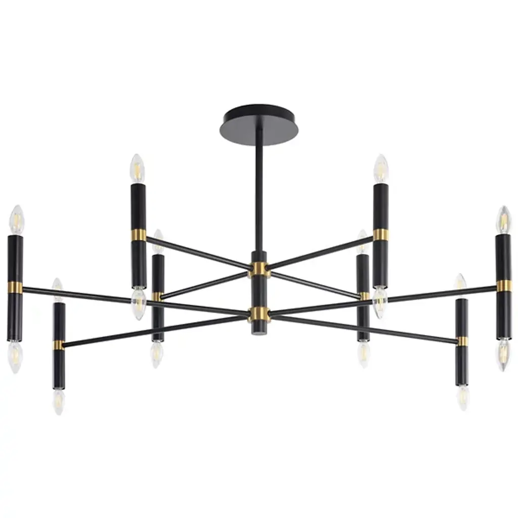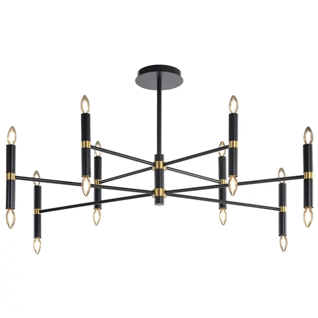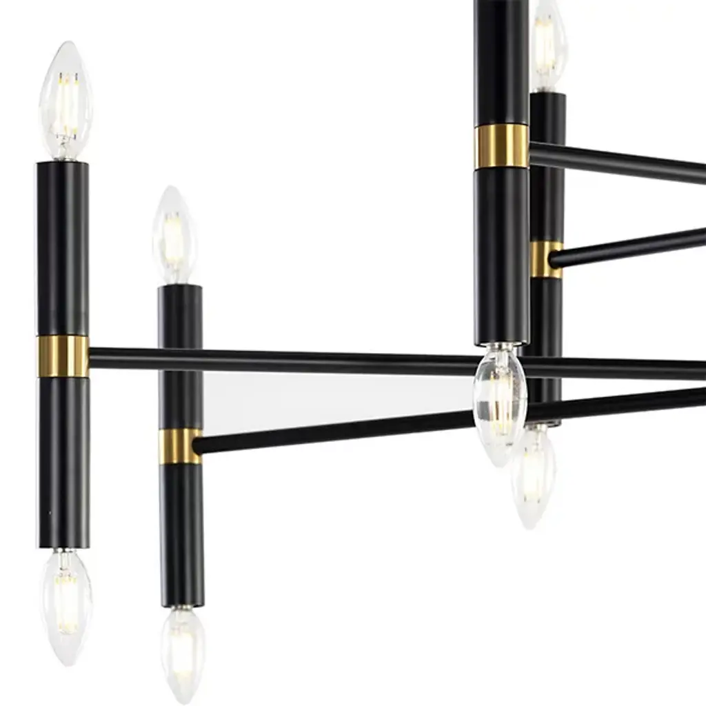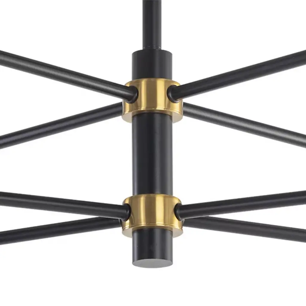 The Briggs Chandelier from Sunpan makes a geometric statement with its intersecting iron arms that create multiple tiers of illumination. The minimalist framework pairs brass accents with iron construction, bringing definition to dining rooms and living spaces. This mid-century-inspired design uses precise angular placement of each arm to maximize light distribution across the space. The chandelier's clean lines and purposeful arrangement of light sources create vibrant overhead lighting. Each candelabra-style light extends from carefully positioned arms, offering practical brightness while maintaining the fixture's structured aesthetic appeal.