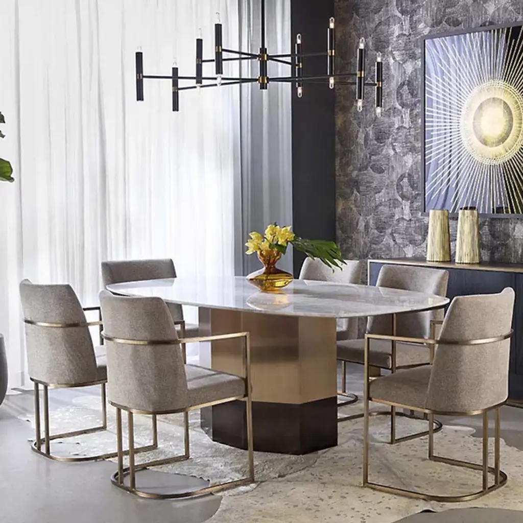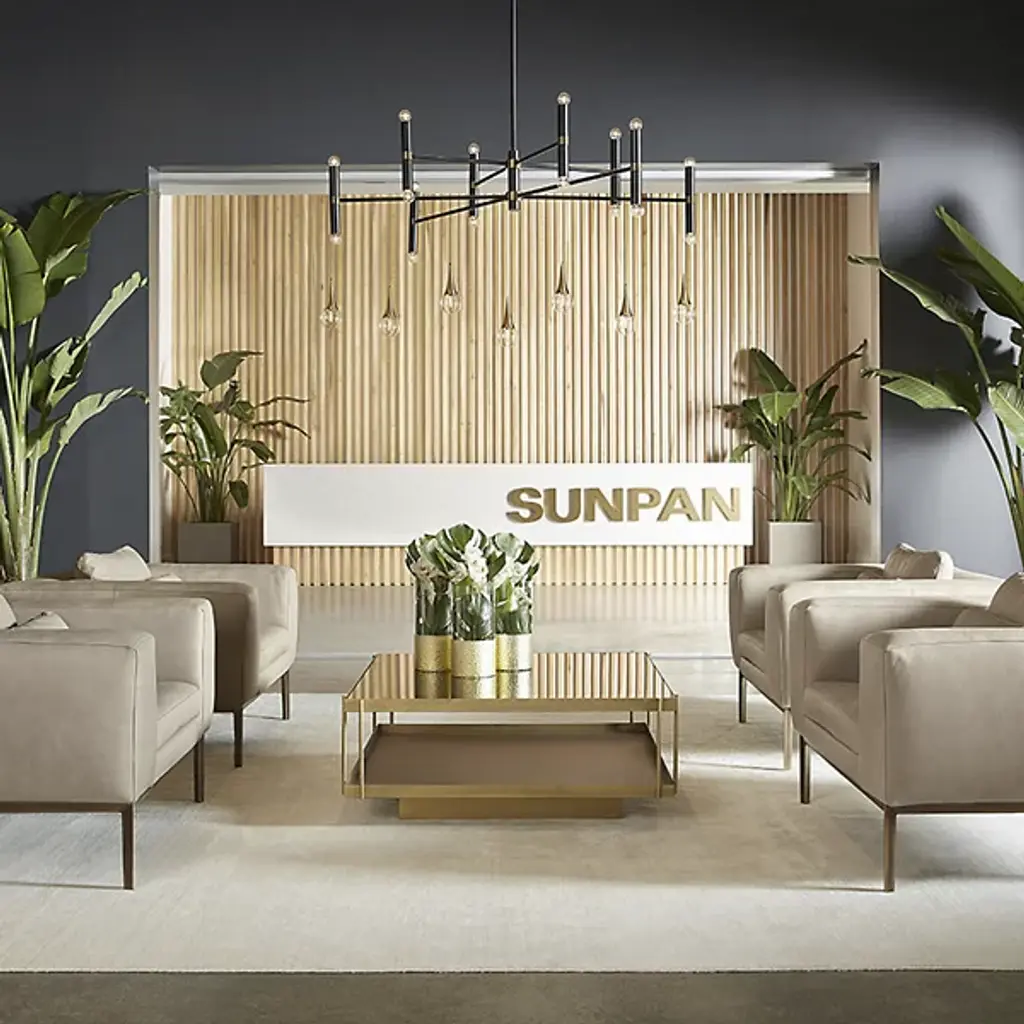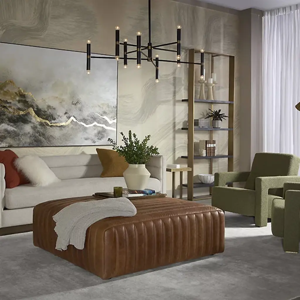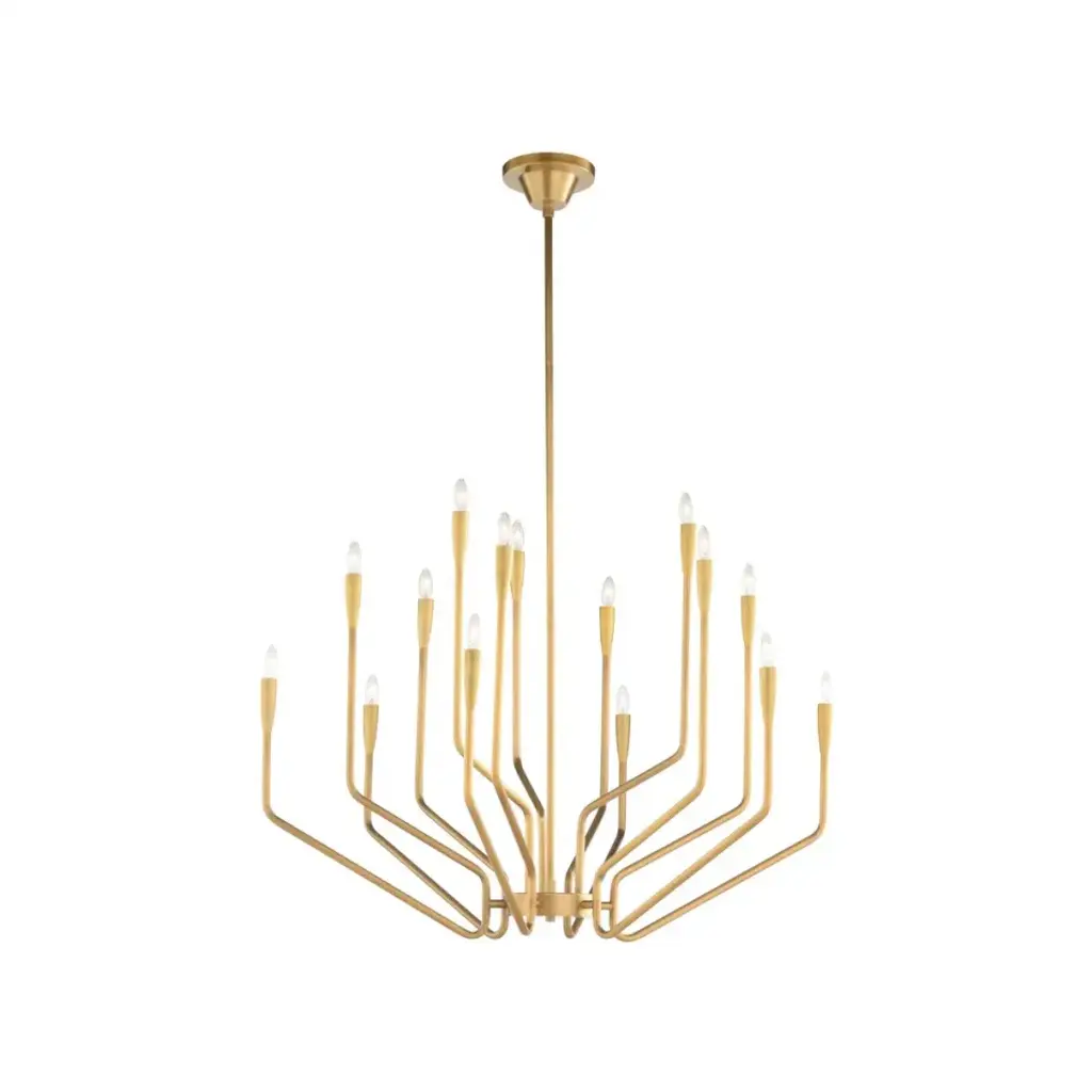 The Briggs Chandelier from Sunpan makes a geometric statement with its intersecting iron arms that create multiple tiers of illumination. The minimalist framework pairs brass accents with iron construction, bringing definition to dining rooms and living spaces. This mid-century-inspired design uses precise angular placement of each arm to maximize light distribution across the space. The chandelier's clean lines and purposeful arrangement of light sources create vibrant overhead lighting. Each candelabra-style light extends from carefully positioned arms, offering practical brightness while maintaining the fixture's structured aesthetic appeal.