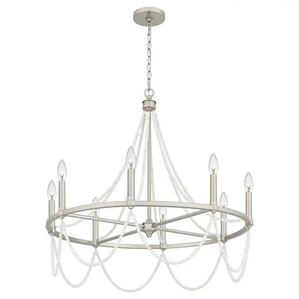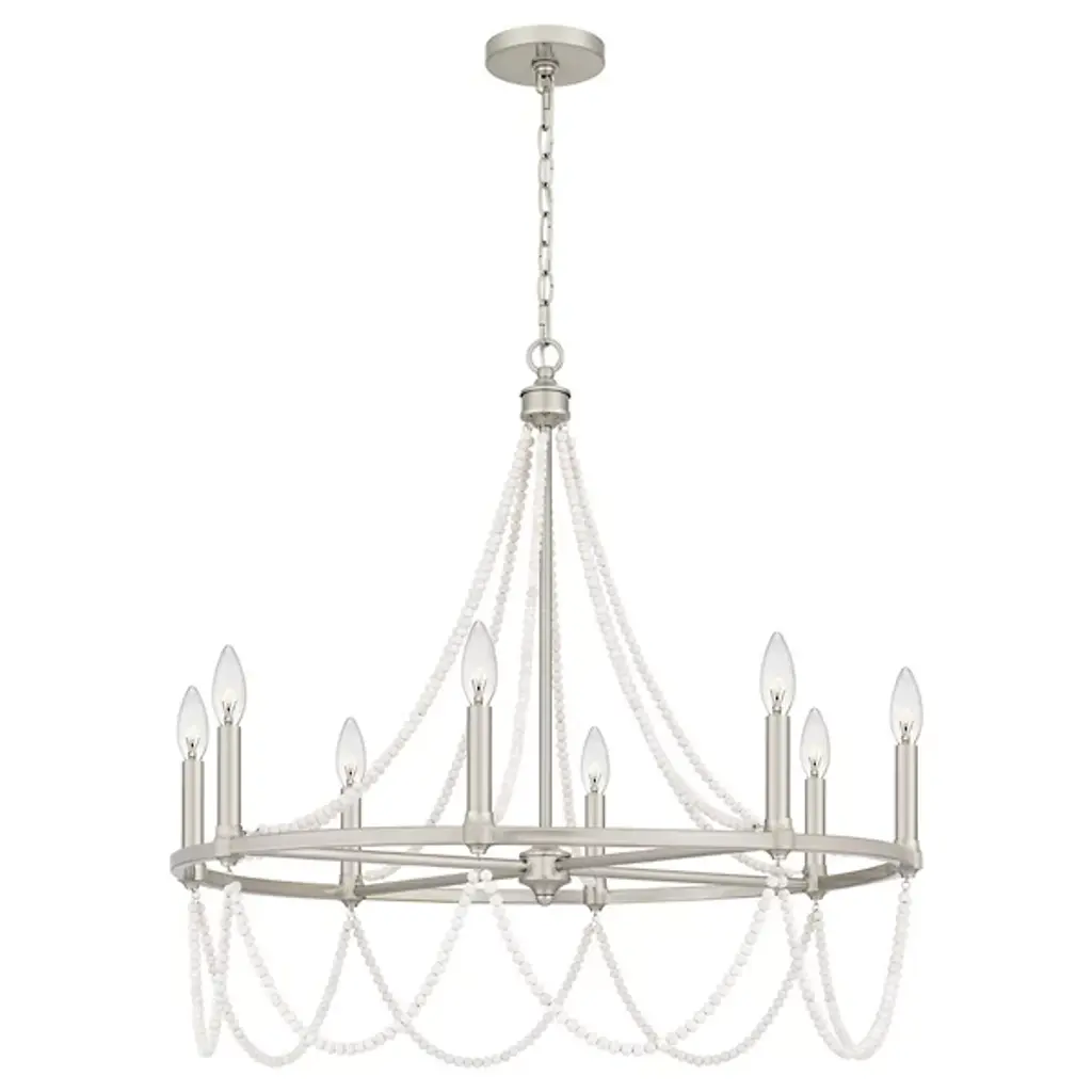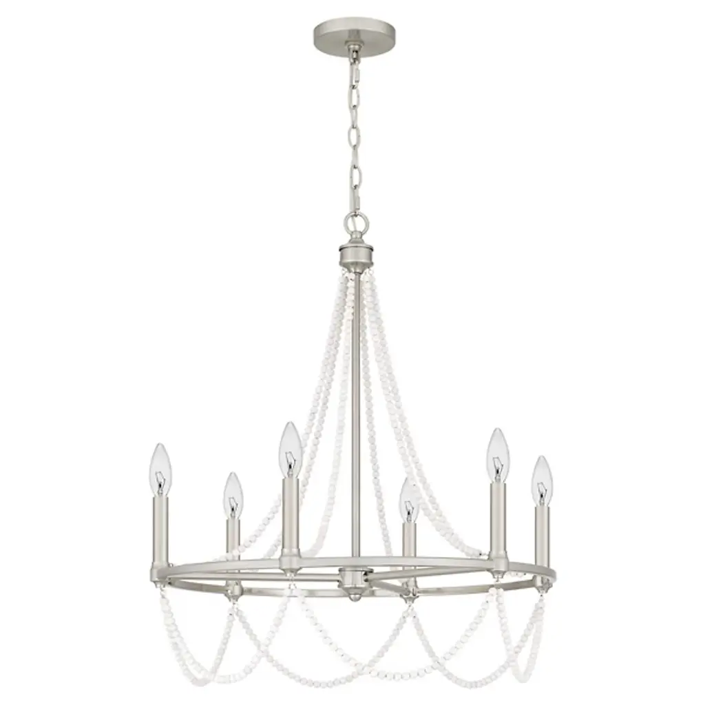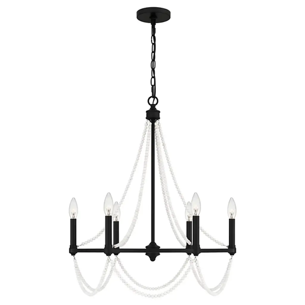Part of the Quoizel Naturals series, the Brigitta Chandelier by Quoizel exemplifies modern bohemian style with draped wooden beadwork throughout. The fine metal framework is constructed in the shape of a ring which makes the candelabra lights stand out alongside your home decor. Two sizes allow for a tailor-made fit ideal for a romantic dining space or kitchen.