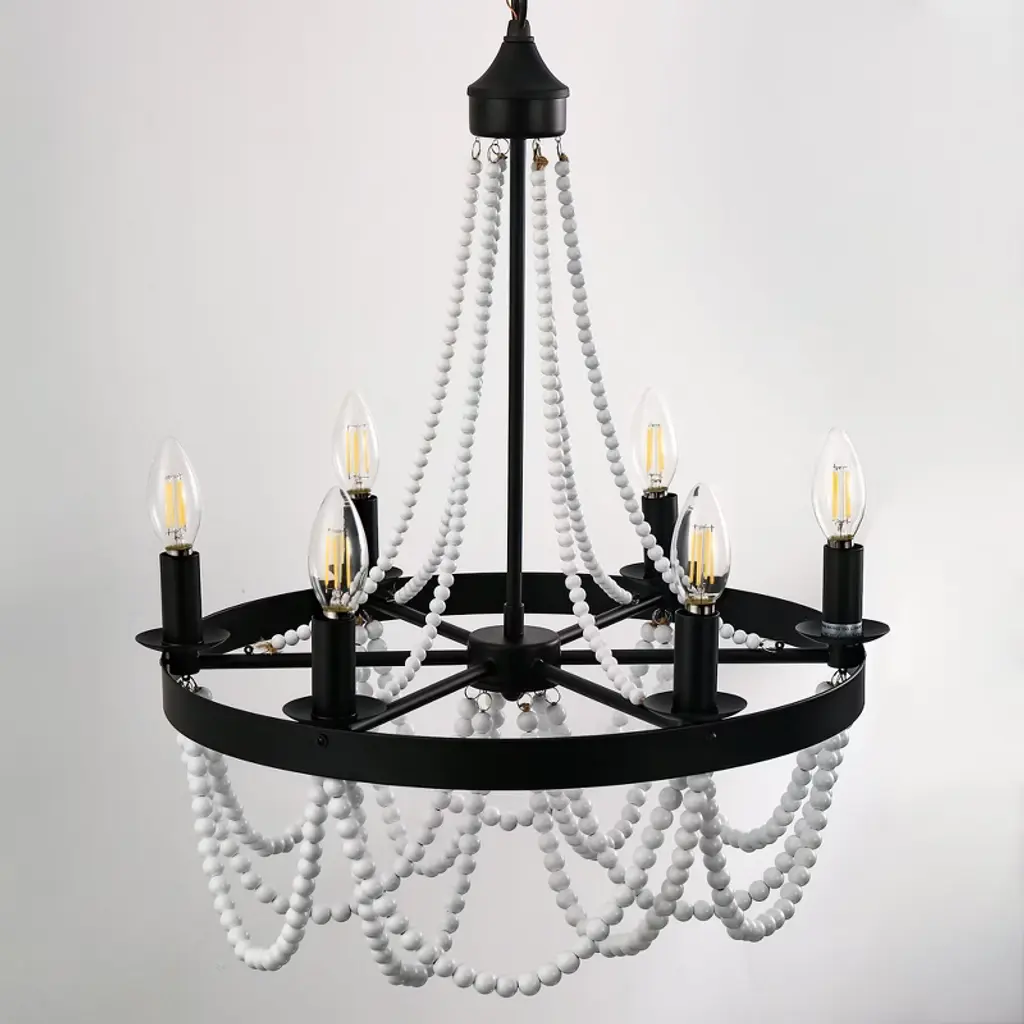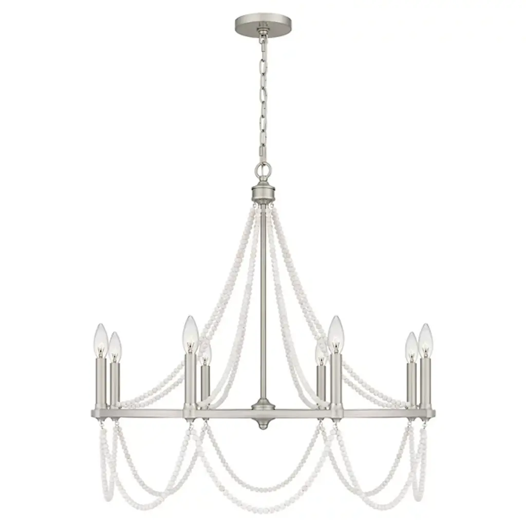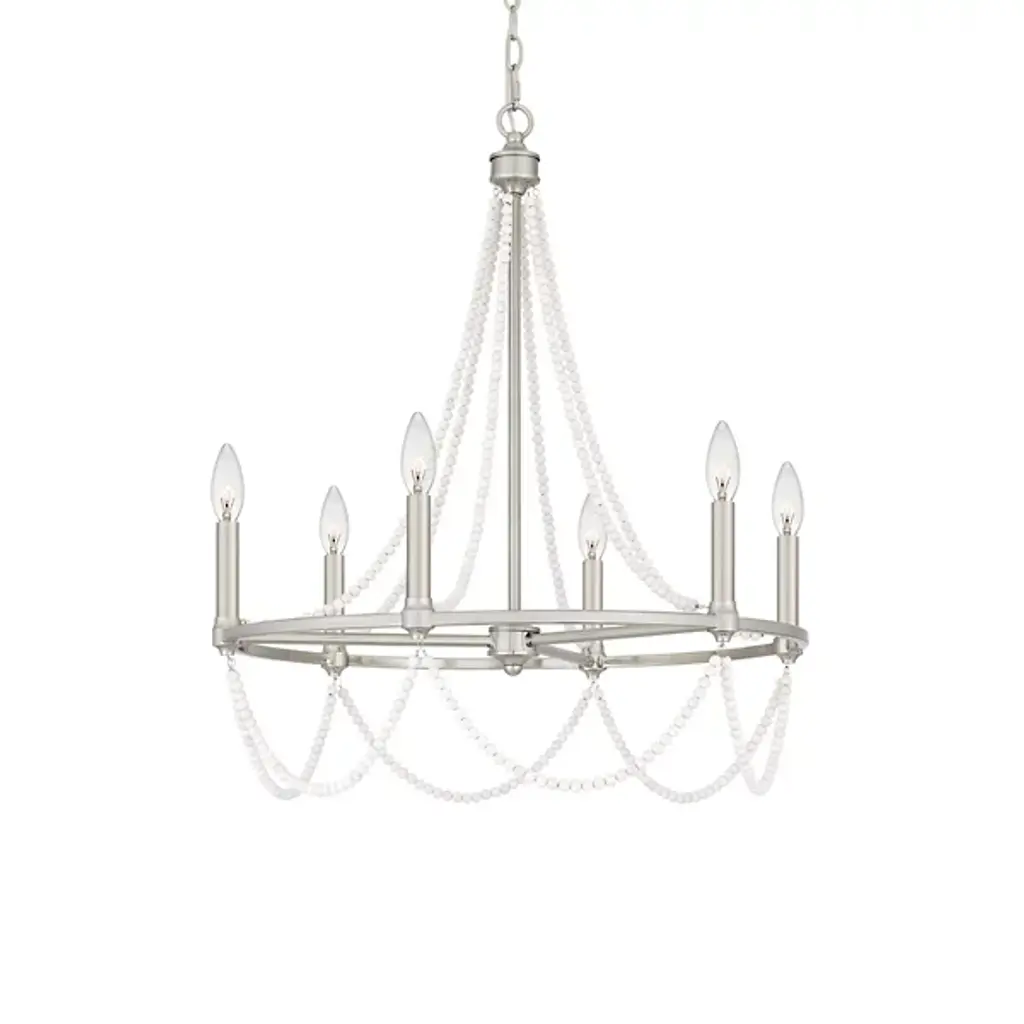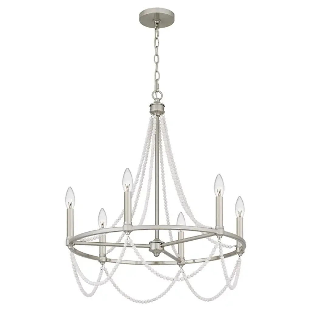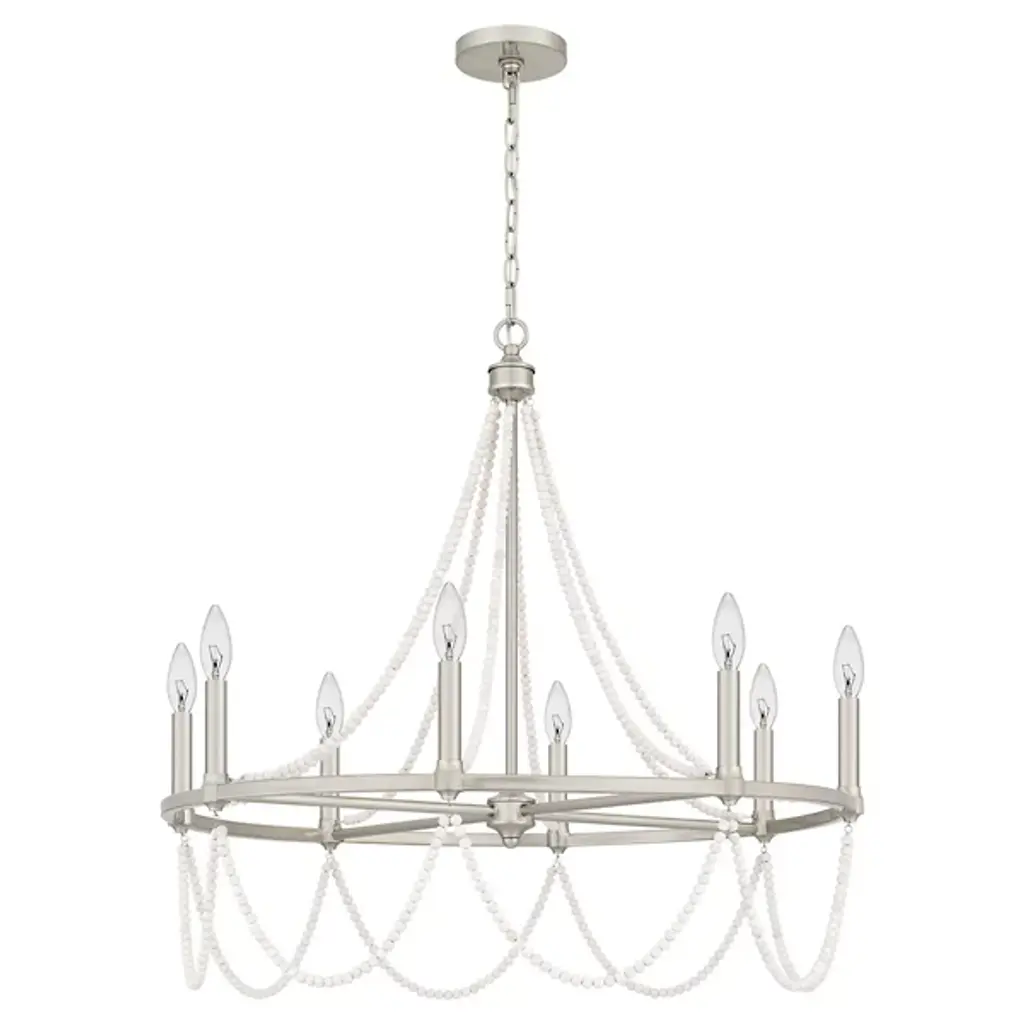 Part of the Quoizel Naturals series, the Brigitta Chandelier by Quoizel exemplifies modern bohemian style with draped wooden beadwork throughout. The fine metal framework is constructed in the shape of a ring which makes the candelabra lights stand out alongside your home decor. Two sizes allow for a tailor-made fit ideal for a romantic dining space or kitchen.