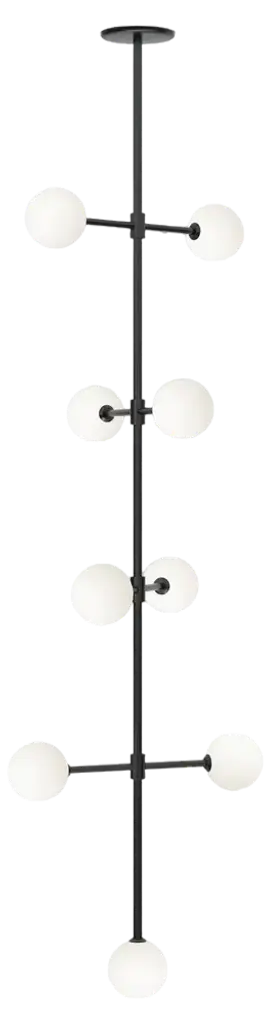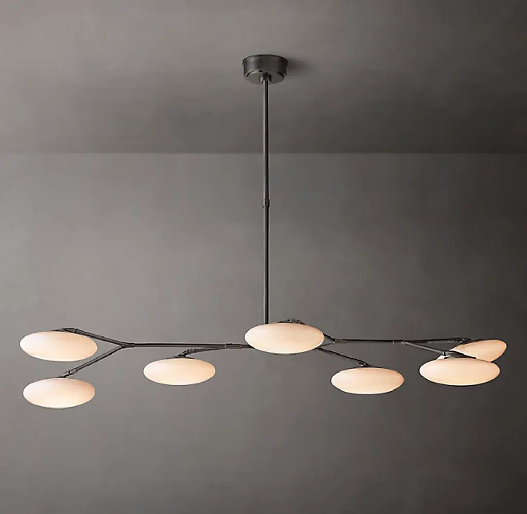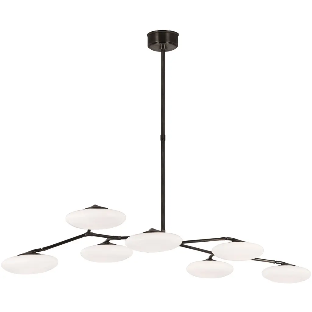 The Brindille XL Articulating Linear Chandelier from Visual Comfort Signature is a harmonious blend of organic beauty and technical innovation. The slender arms of the suspended frame, designed by Champalimaud, resemble a branch adorned with delicate petals. These petal-like white glass shades are ingeniously designed with a spoon-shaped brass fitting, allowing them to rotate 360 degrees for versatile and adjustable lighting. This chandelier becomes a poetic focal point above any dining room table, captivating with its artistic allure and functional charm.