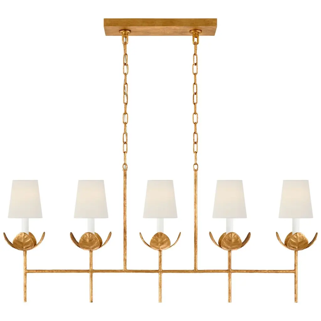 Individual wrought iron leaves deliver a stunning, unique, and functional light. The tailored elegance of the shimmering metallic florals is perfect for a transitional home though versatile enough to be incorporated into any modern design. While ideal for a bedroom, living area, or kitchen, it can be used anywhere you want to add a bit of glam. This fixture exudes timeless elegance with its candelabra-style frame and white linen shades. Whether in a dining room, or over a kitchen island, this chandelier adds a touch of refined glamour to any space, making it perfect for transitional and modern designs.