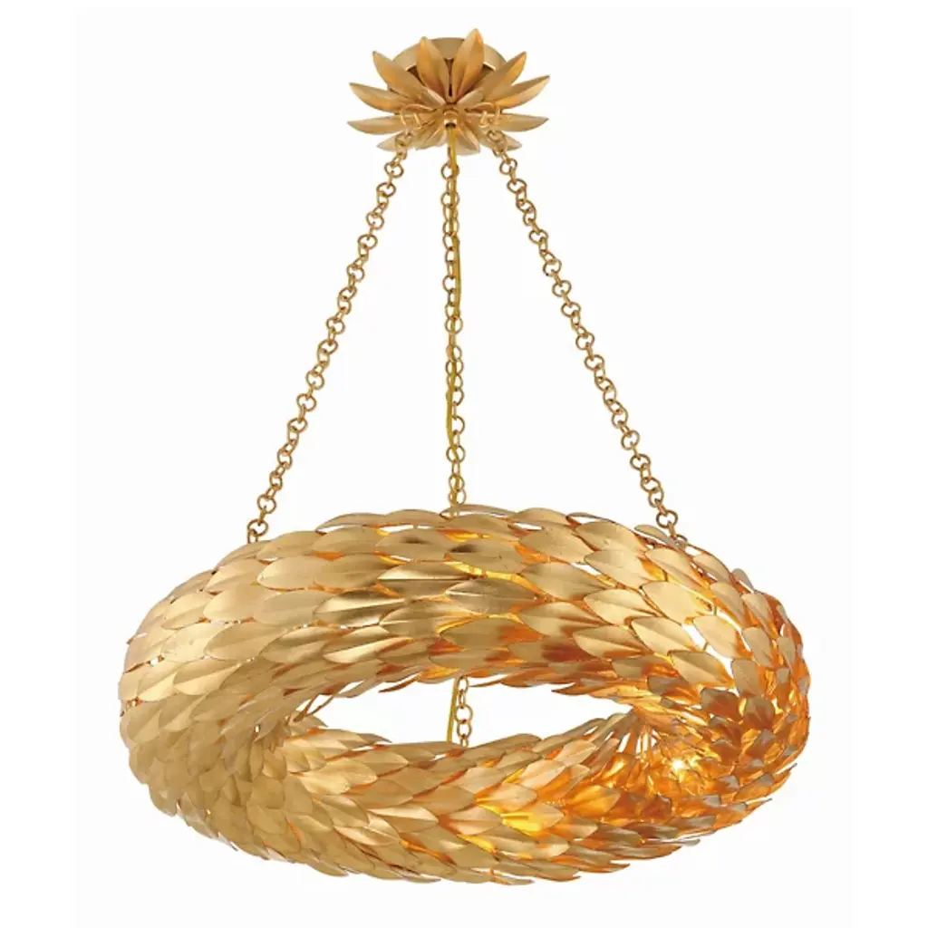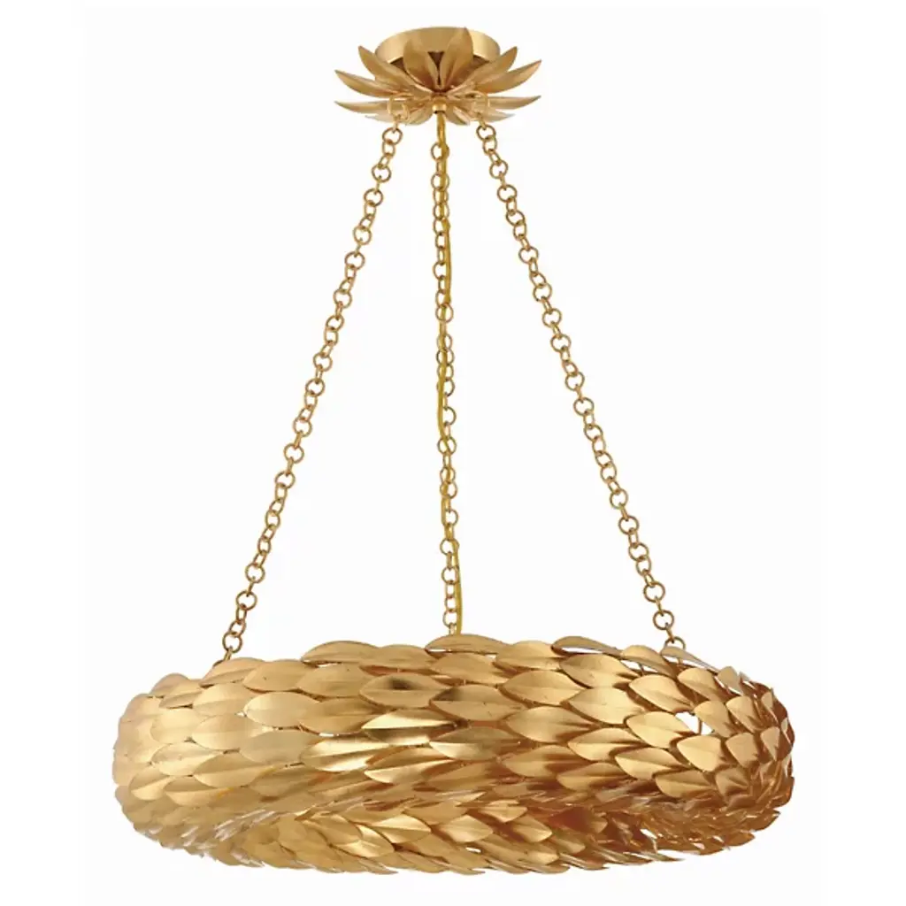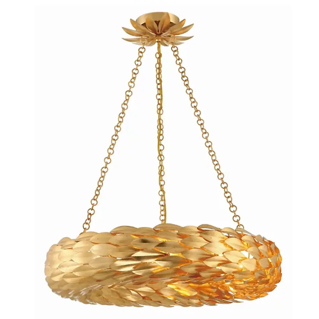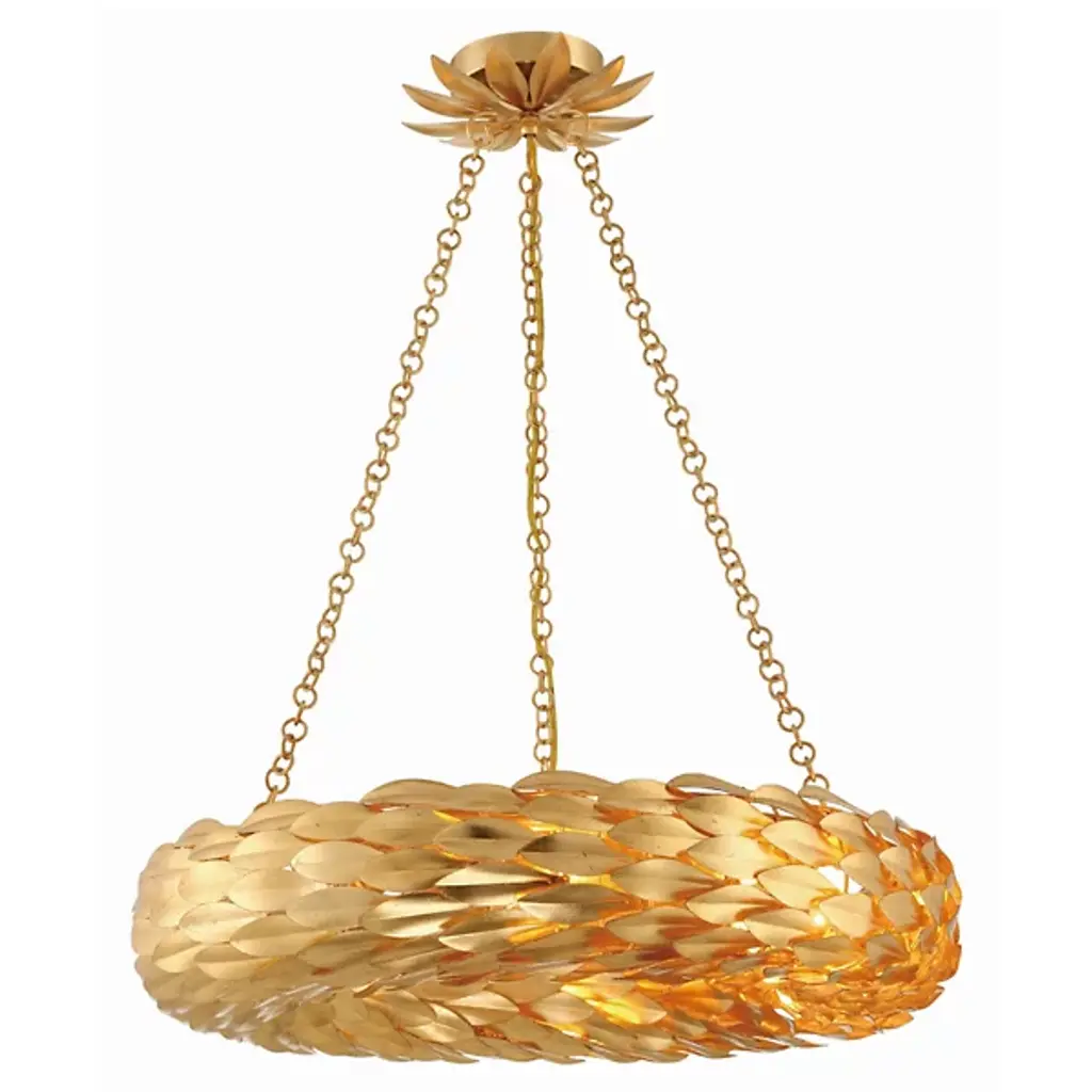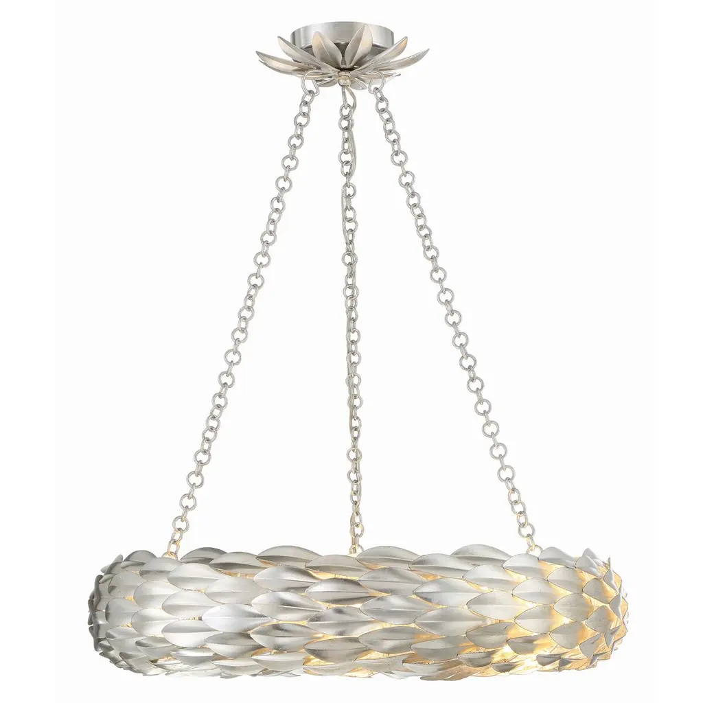 The Broche Chandelier from Crystorama layers individual wrought iron leaves around a cylindrical drum to create a textured surface that catches and reflects light. Each metallic leaf overlaps the next in an organic pattern that suggests natural growth while maintaining a structured geometry. The steel elements are hand-finished to achieve a shimmering quality that shifts as you move around the piece. This approach to chandelier design uses metallic foliage to filter light through the gaps between leaves, creating dappled patterns on surrounding surfaces.