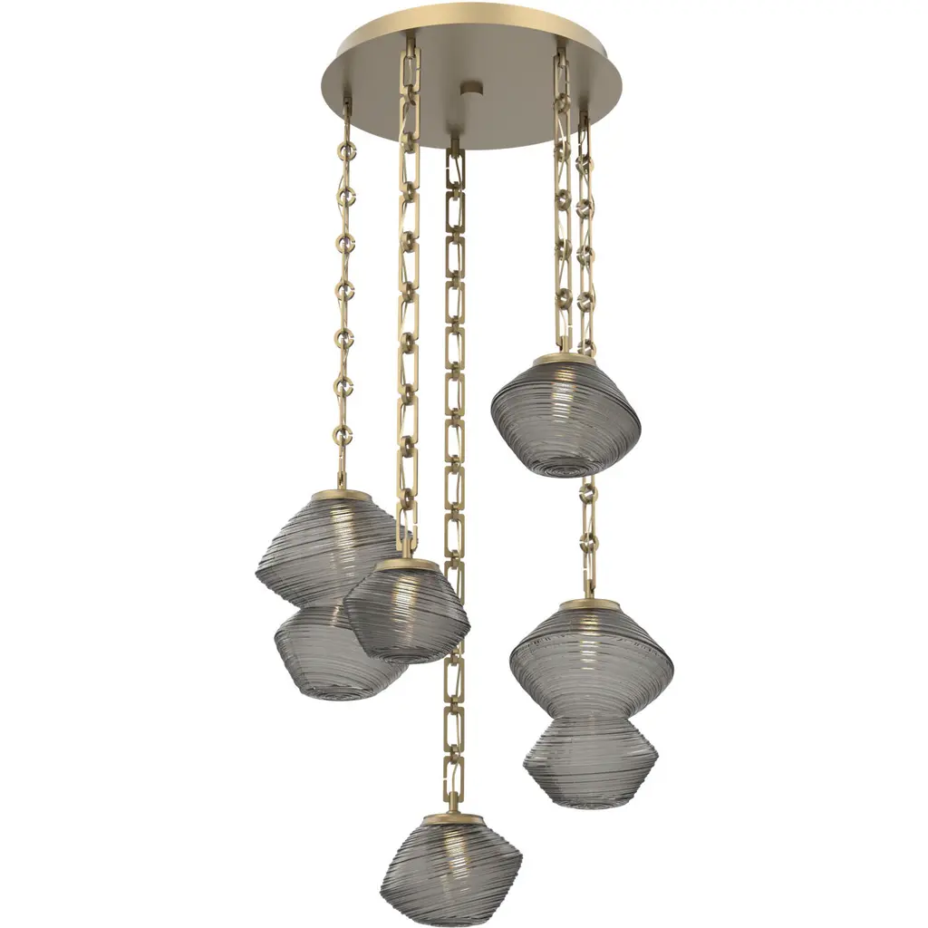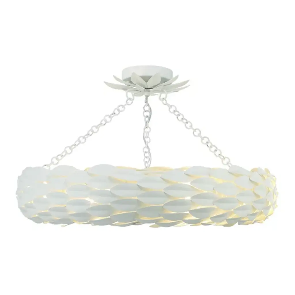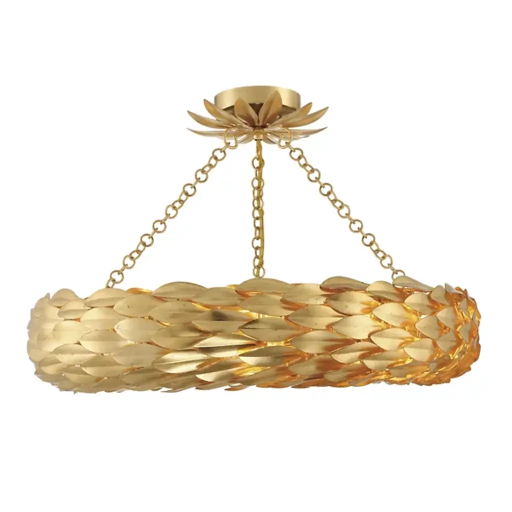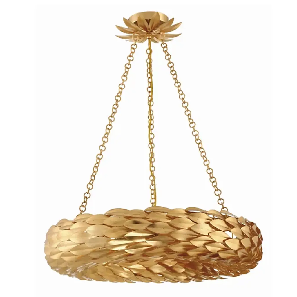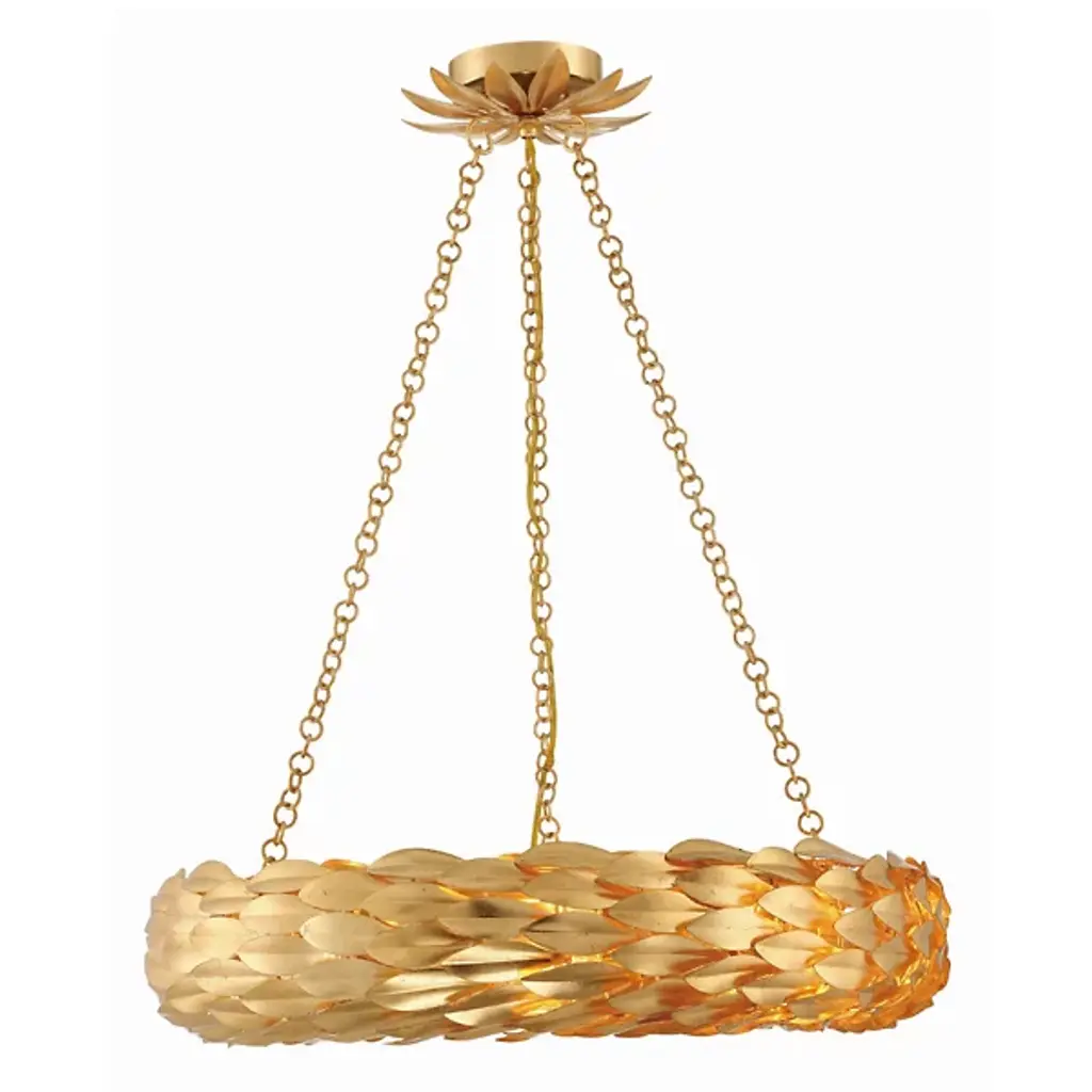 The Broche Chandelier from Crystorama layers individual wrought iron leaves around a cylindrical drum to create a textured surface that catches and reflects light. Each metallic leaf overlaps the next in an organic pattern that suggests natural growth while maintaining a structured geometry. The steel elements are hand-finished to achieve a shimmering quality that shifts as you move around the piece. This approach to chandelier design uses metallic foliage to filter light through the gaps between leaves, creating dappled patterns on surrounding surfaces.