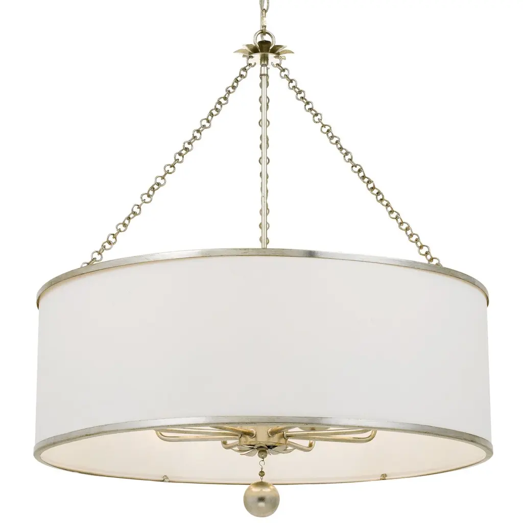 A wonderful way to add distinctive style to your decor, this versatile chandelier is crafted of wrought iron in an antiqued finish with shapely petal detailing and a white linen shade. Hardwired.