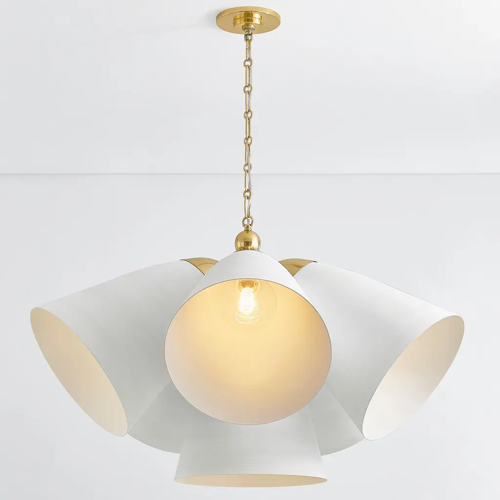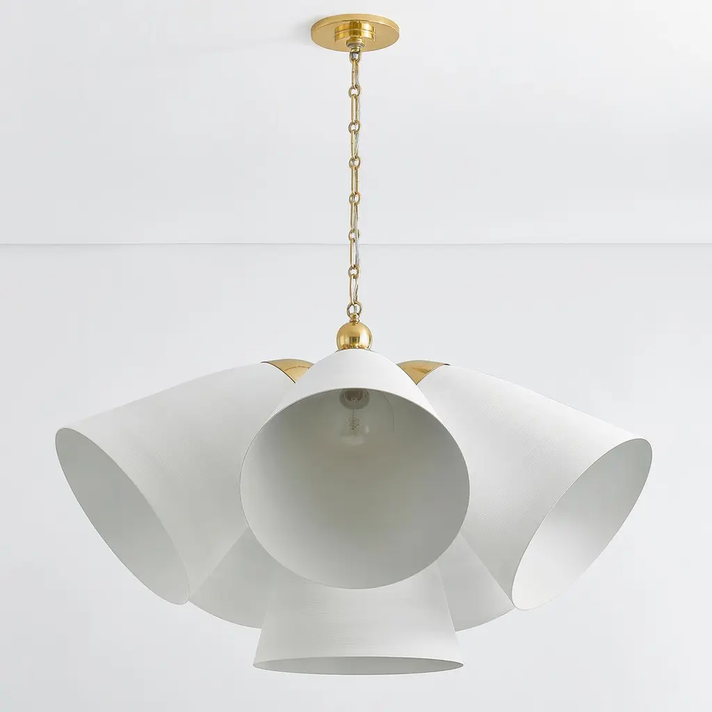 A refined bell-shaped fixture with a modern edge, Bronson features a sleek, tapered silhouette crafted from clean White Plaster. The opaque materiality and funnel shape creates a powerful downlight to fill a large area. Accented by the inviting warmth and reflective nature of Aged Brass, including a large cap and finial, it evokes an organic feel. Available as a chandelier or pendant in two sizes.
