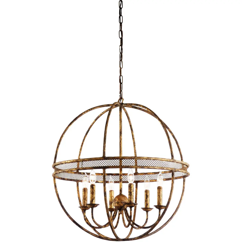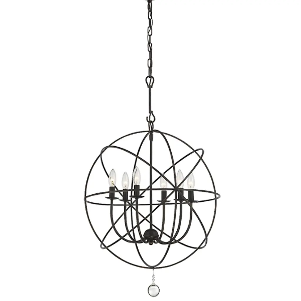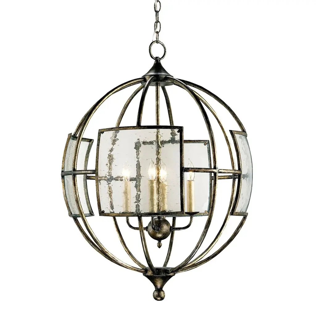 The Broxton Bronze Orb Chandelier has a Pyrite bronze finish on its spherical cage. This heightens the time-honored countenance of this bronze chandelier in the Lillian August Collection. The seeded glass panels enhance the fixture's glow. There are several other chandeliers in the Broxton family.