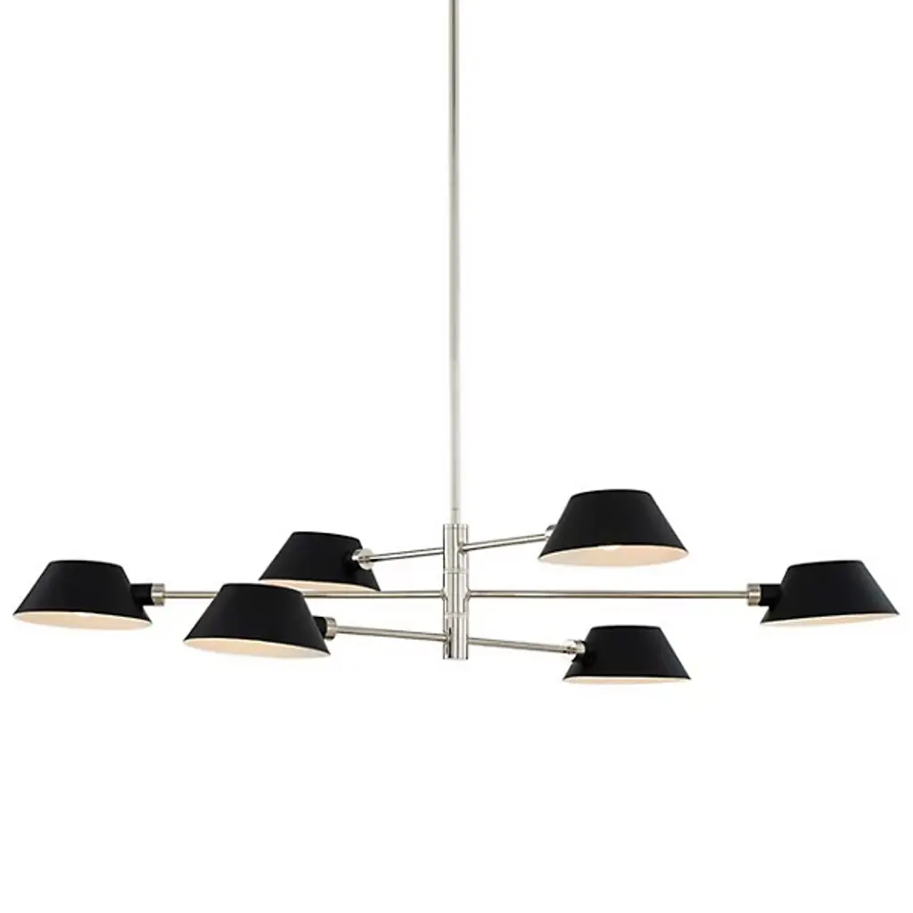 A stylish way to light your home, the Bruno 3-Tier Chandelier from Kalco brings a comforting presence and an even glow to a range of rooms. Descending from the ceiling with a long and thin body, this piece contains a cylindrical central piece that mounts a set of three thin, matching arms. Each arm is subtly angled, with each end leading to a wide, tapered shade. A single bulb rests within each shade, creating a warm and welcoming glow.