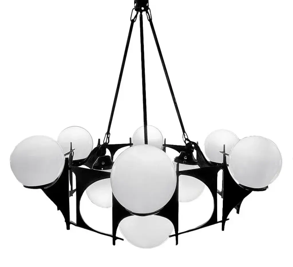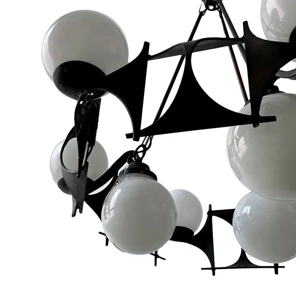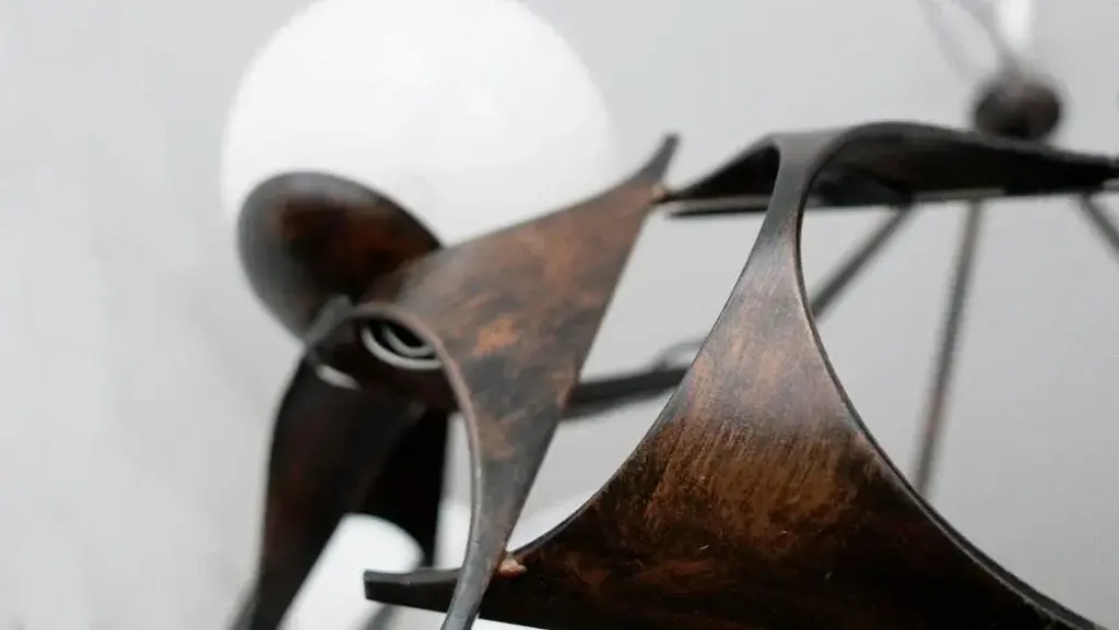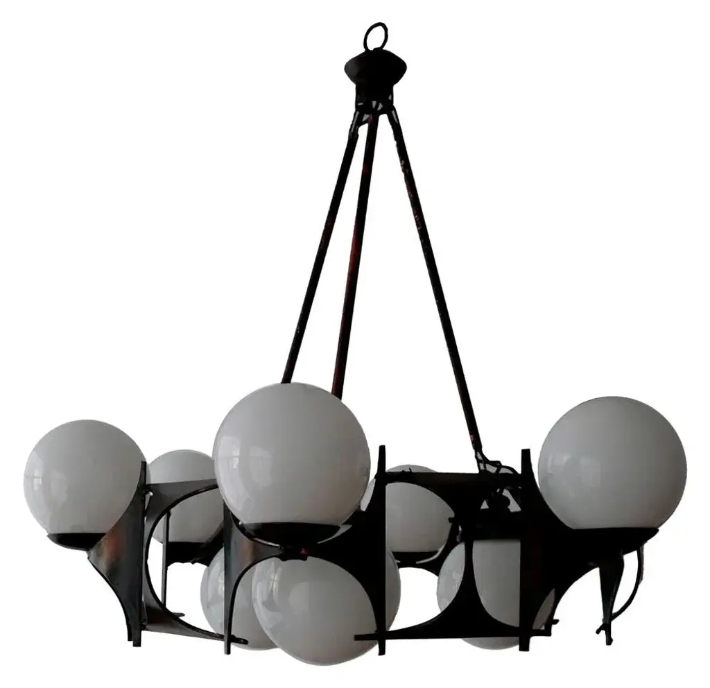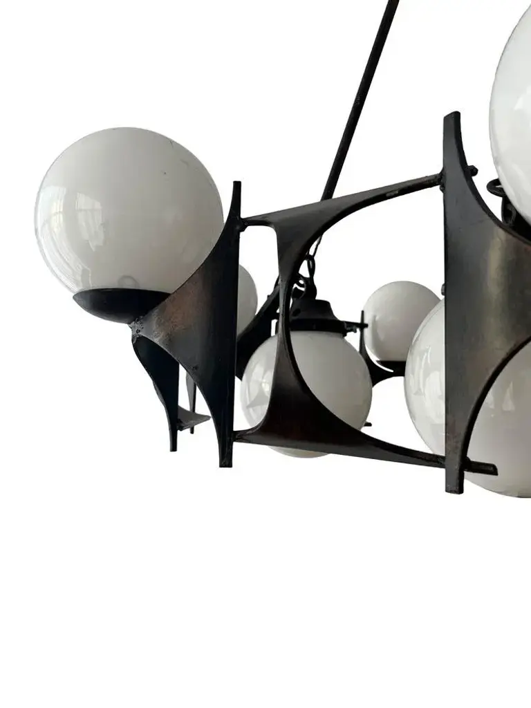 Embrace the enchantment of our brutalist-style chandelier lamp from the 1950s and uncover its enduring magnificence. with a circular design boasting an 80 cm diameter, it stands as an authentic showpiece. This lamp surpasses its role as a mere lighting fixture; it's a true work of art. Its uniqueness sets it apart, as there are no comparable items available in the market. Adorned with a total of 15 strategically placed bulbs, it bathes any space in a warm and enveloping radiance. What's even more captivating is the individual power control for the two rows of bulbs, thanks to the integrated switches. This exclusive feature empowers you to fine-tune the light's intensity, enabling you to craft various atmospheres tailored to your preferences and needs. Envision the versatility and allure you can introduce to your space with this distinctive functionality. Crafted from iron and meticulously designed to capture the essence of 1950s brutalist style, this lamp seamlessly blends strength and elegance. Its carefully aged finish imparts an authentic vintage ambiance, making it a piece that exudes the character and charm of that era. Whether your aim is to infuse a touch of retro into a modern living room or add a hint of sophistication to a contemporary setting, this 1950s brutalist-style lamp proves to be the ideal choice. Its remarkable design and captivating illumination are certain to captivate all who encounter it. European Plug (up to 250V).The wiring of this item may be original and might need replacement, if not specified otherwise.