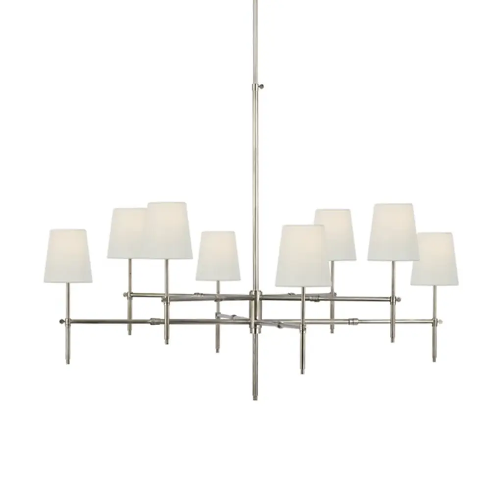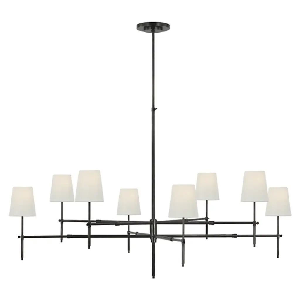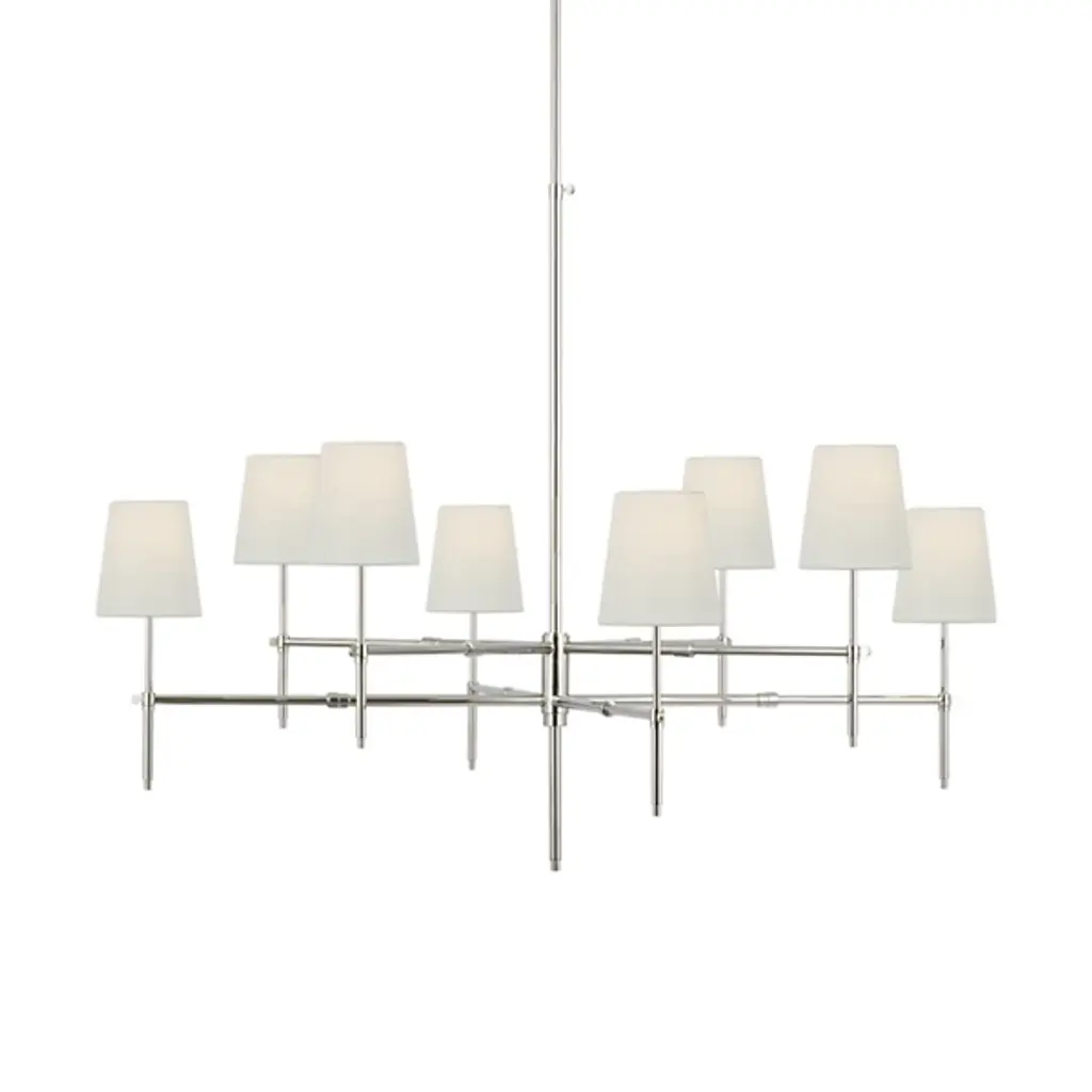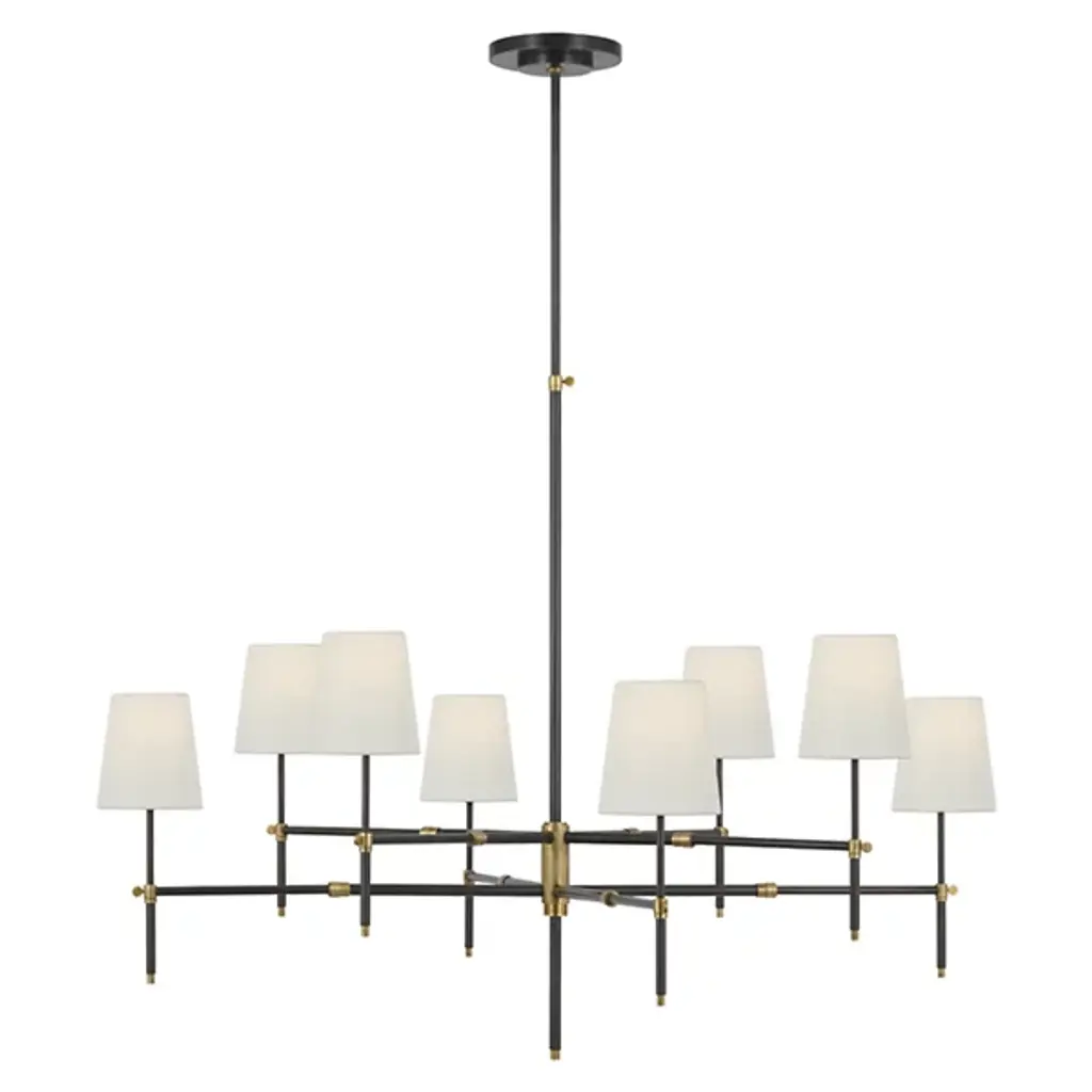 Bring a tasteful enhancement to large inside ceilings with the Bryant Chandelier from Visual Comfort Signature. Designed by Thomas O’Brien, a height-adjustable slender stem descends from a stepped circular canopy, threading a cylindrical body around the stem’s lower section. Slender crossbars extend from the cylinder, supporting two tiers of lamping, individual sockets ascending beneath translucent shades of flaring linen that add a welcome touch of depth to the proceedings and transmit a gentle, mellow light to the sides