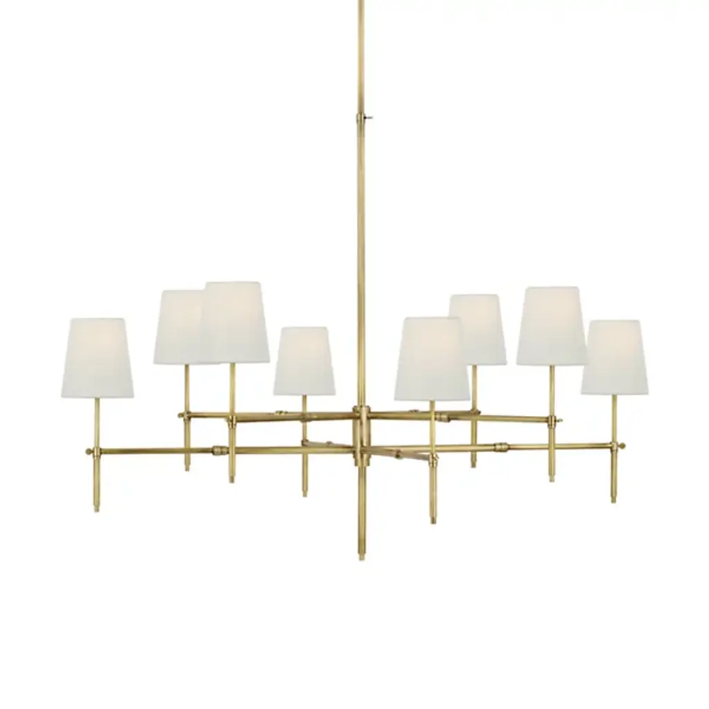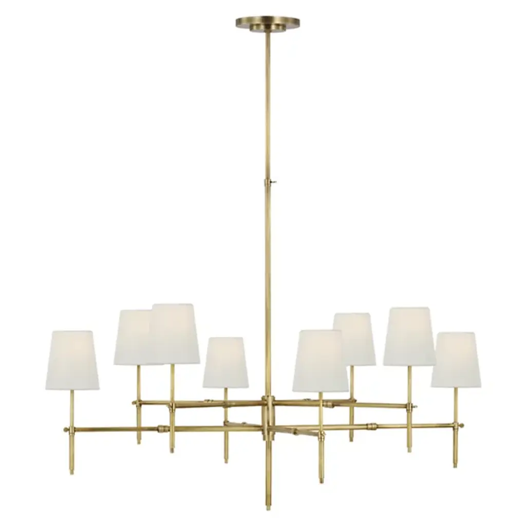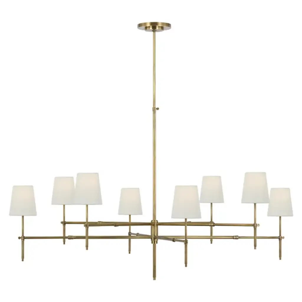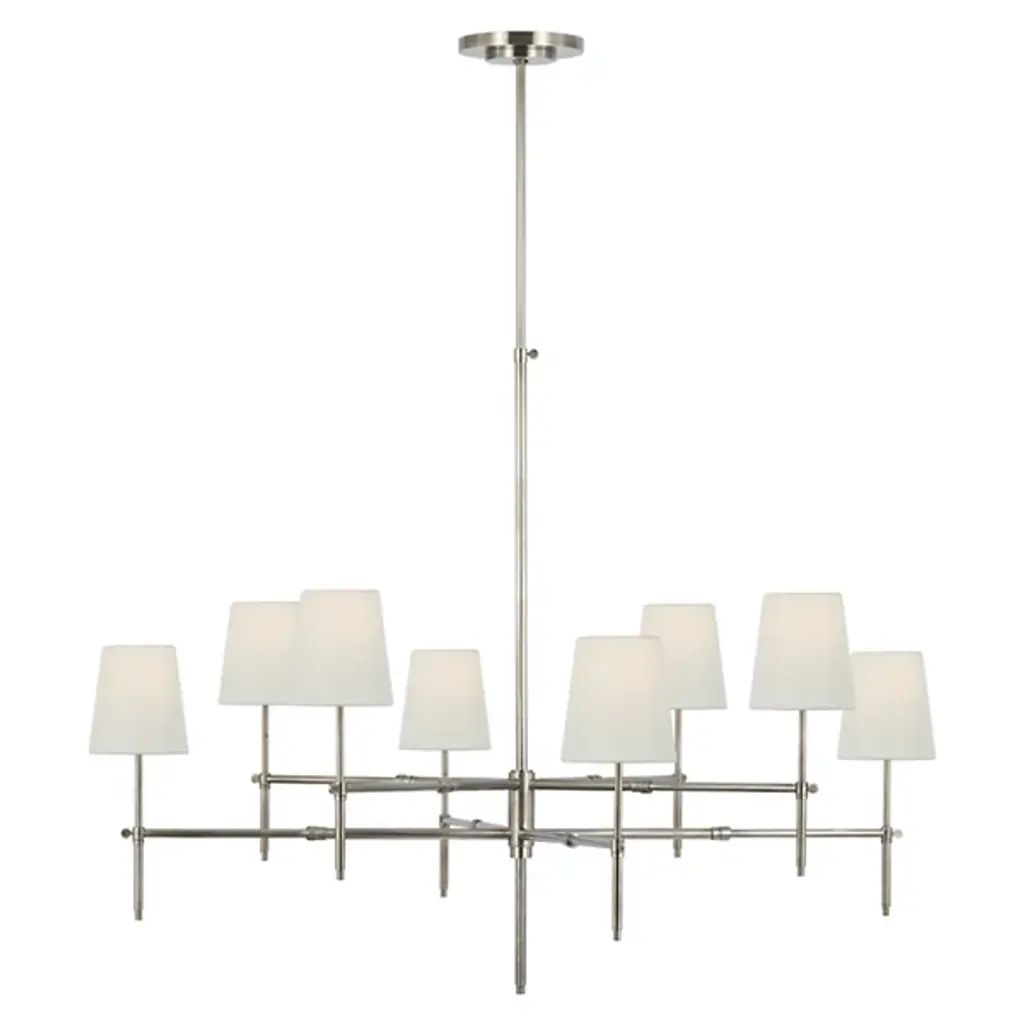 Bring a tasteful enhancement to large inside ceilings with the Bryant Chandelier from Visual Comfort Signature. Designed by Thomas O’Brien, a height-adjustable slender stem descends from a stepped circular canopy, threading a cylindrical body around the stem’s lower section. Slender crossbars extend from the cylinder, supporting two tiers of lamping, individual sockets ascending beneath translucent shades of flaring linen that add a welcome touch of depth to the proceedings and transmit a gentle, mellow light to the sides