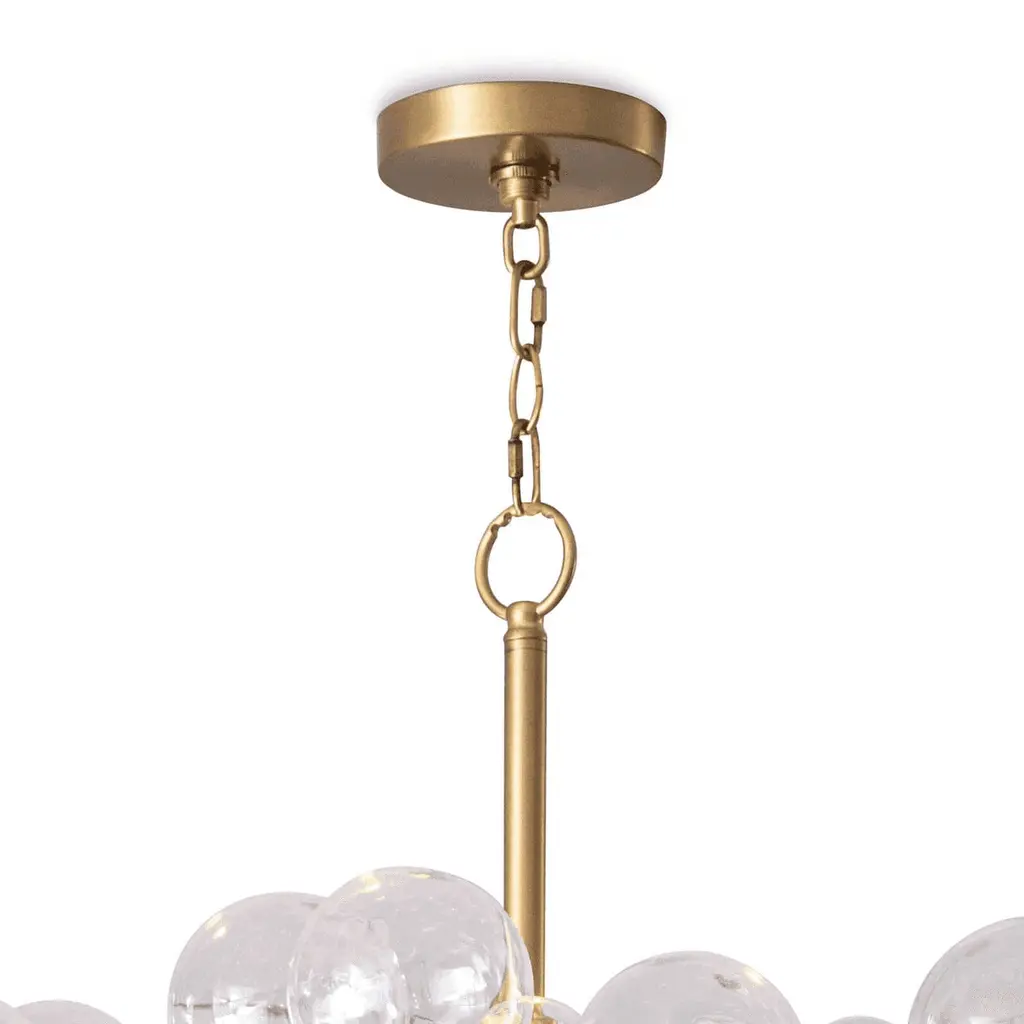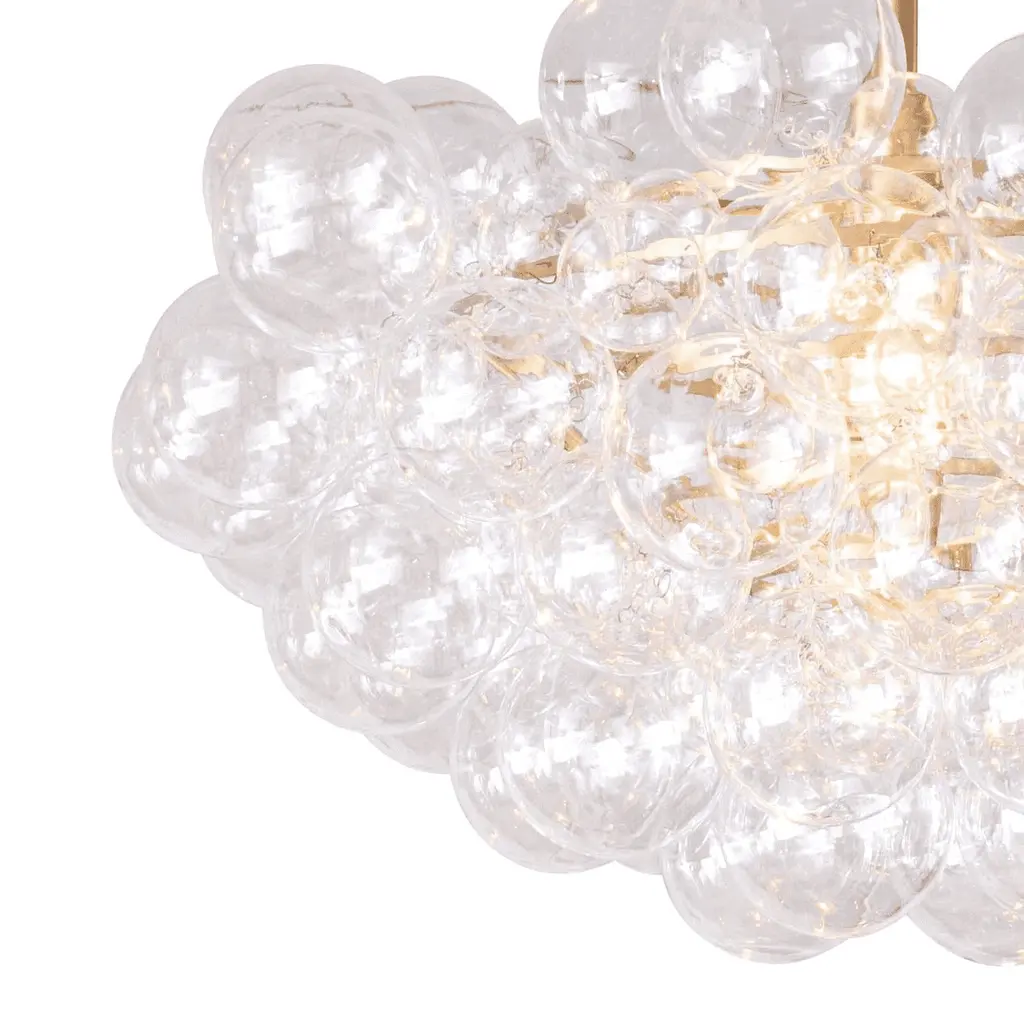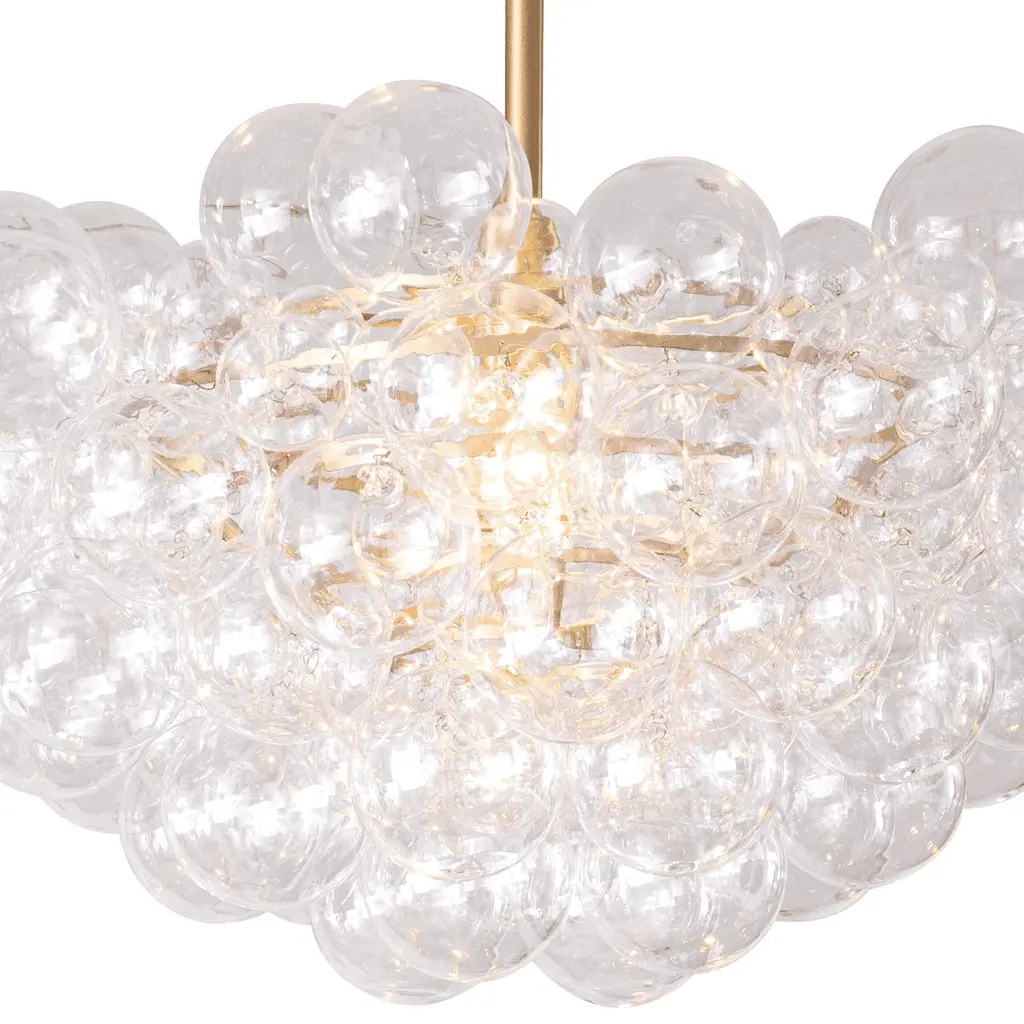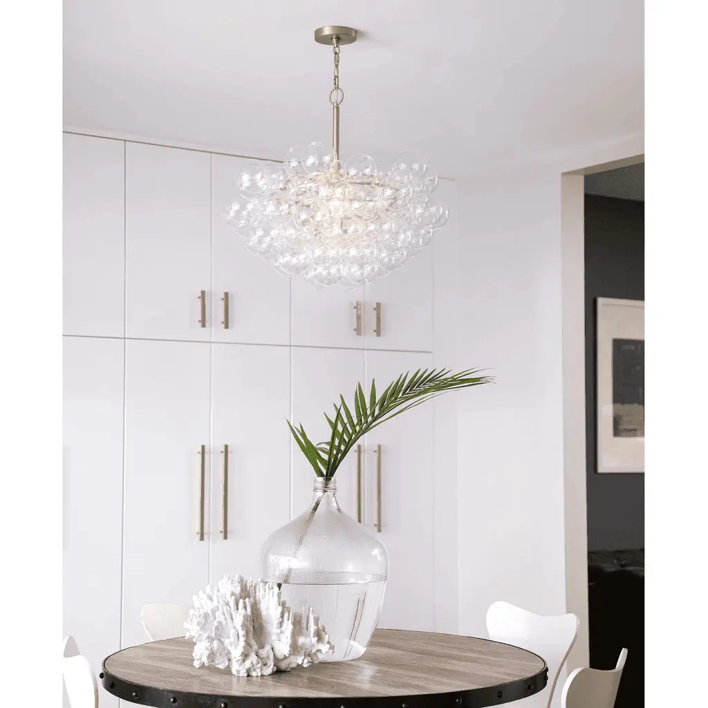 Light and airy, the Bubbles chandelier radiates light through a cluster of hand blown glass globes. The tiered metal frame lends a whimsical modern touch to a kitchen, entryway or foyer.