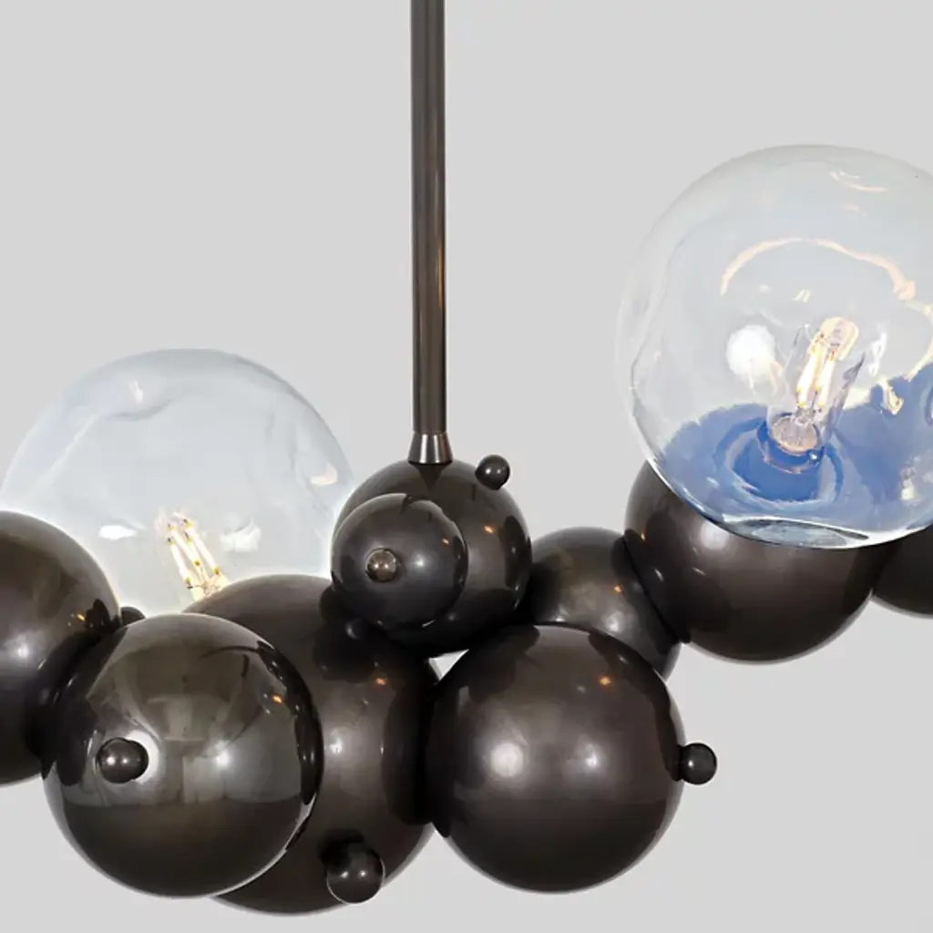 The Bubbly 04 Chandelier from Rosie Li Studio raises the spirits of the room with a weightless silhouette referencing the airy bubble and the slow-building shapes of the botryoidal hematite mineral. Creator Rosie Li Studio ditches traditional design motives for an approach built on science, math, nature, and pared-down forms. Here, the globe serves as the building block. Artisans craft these familiar globes in brass at varying scales to get the eyes moving all around. The brass globes stretch far, making the piece ideal for the communal setting. Handblown glass shades add radiant focal points while on. The light gives the brass display a pleasant golden hue.