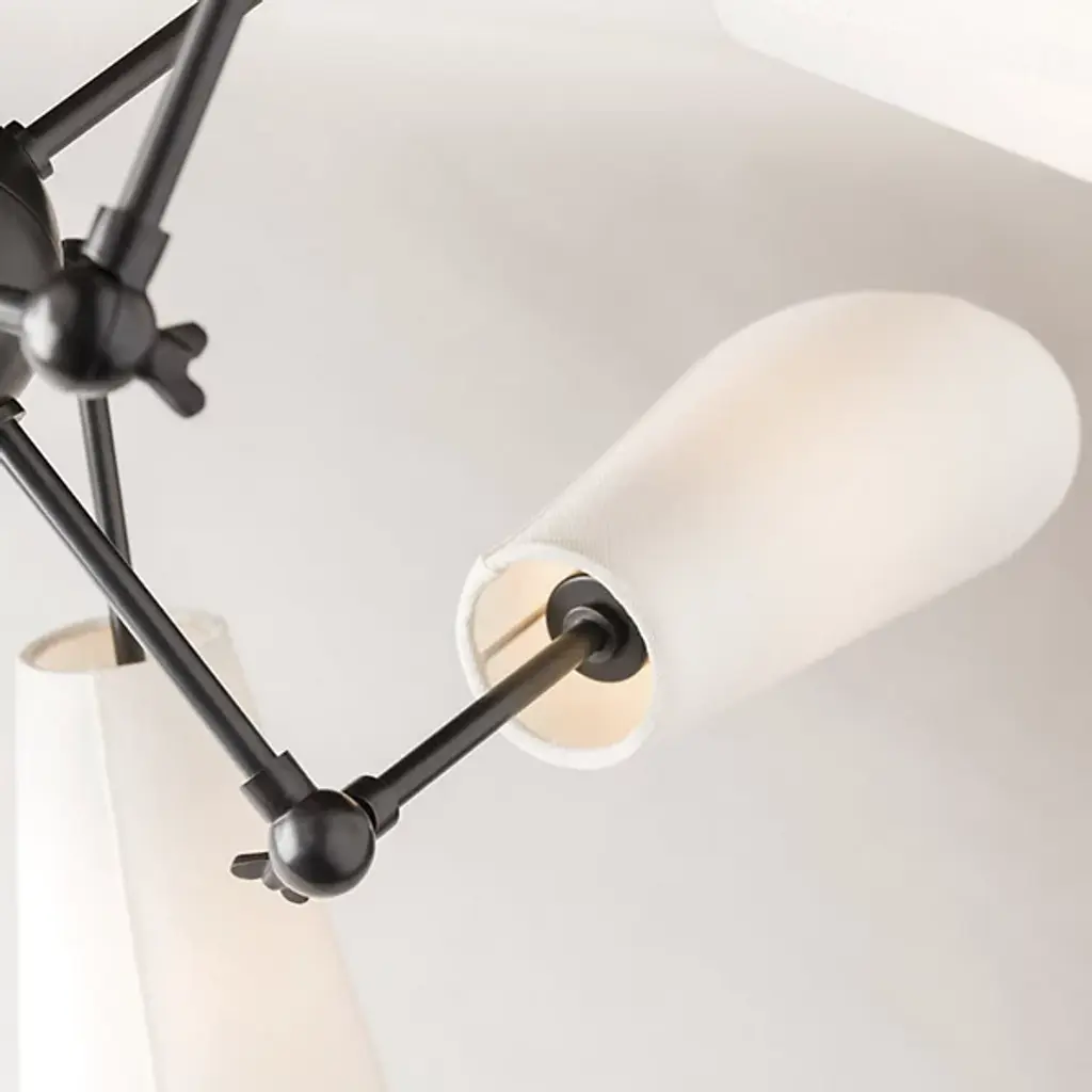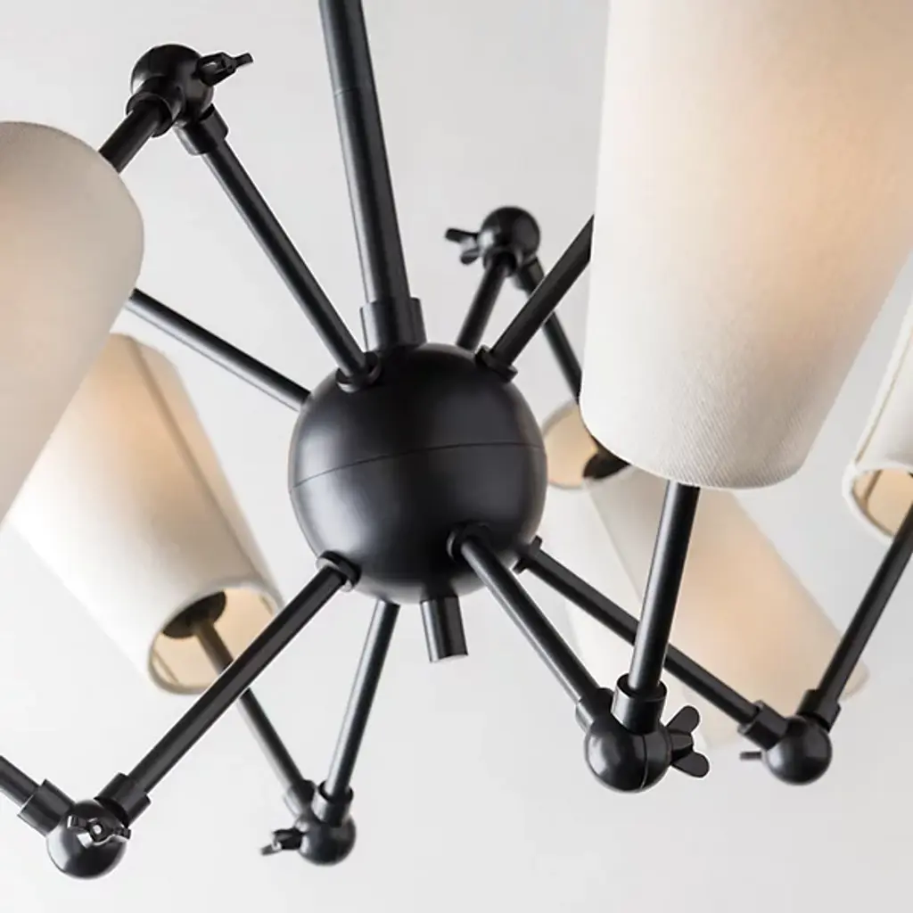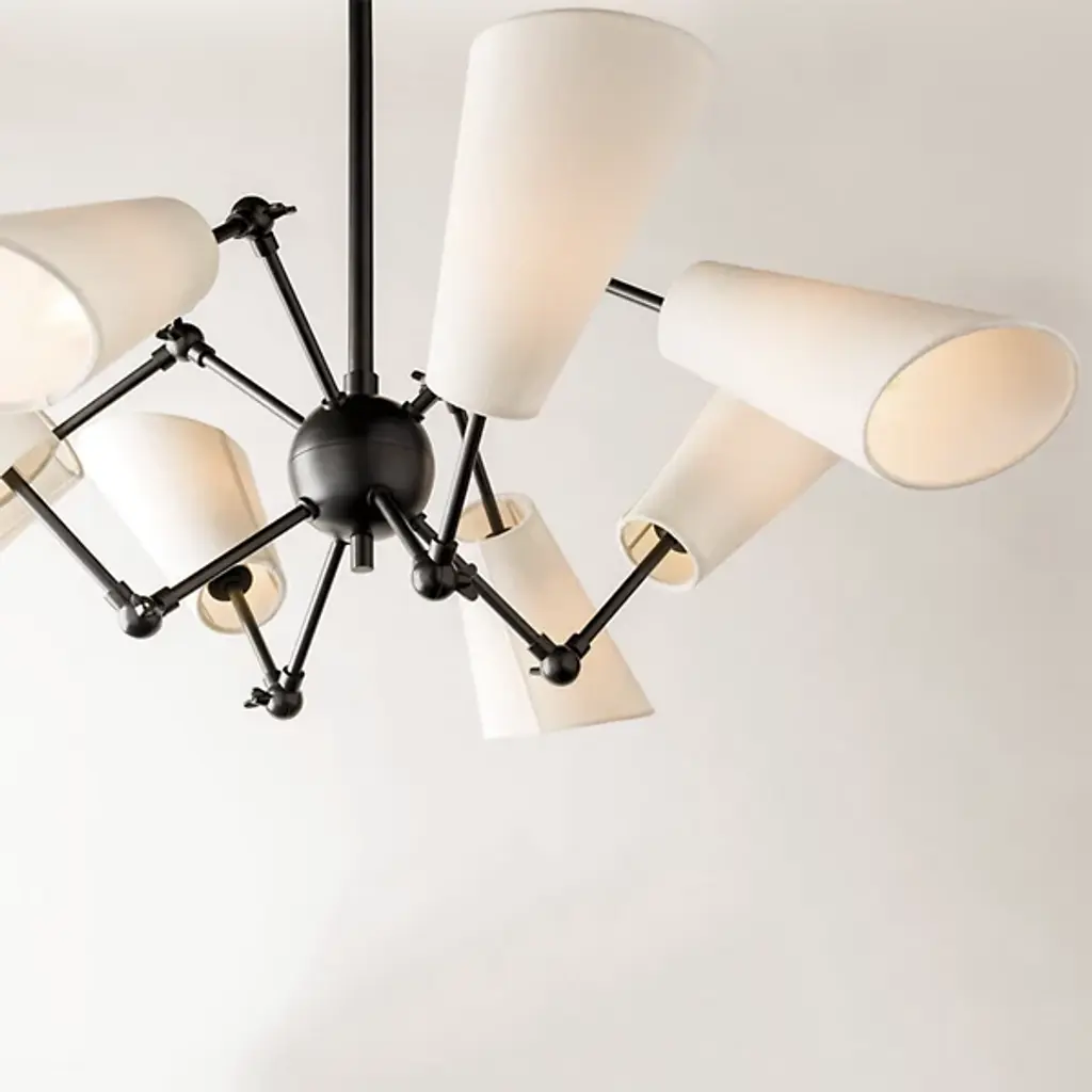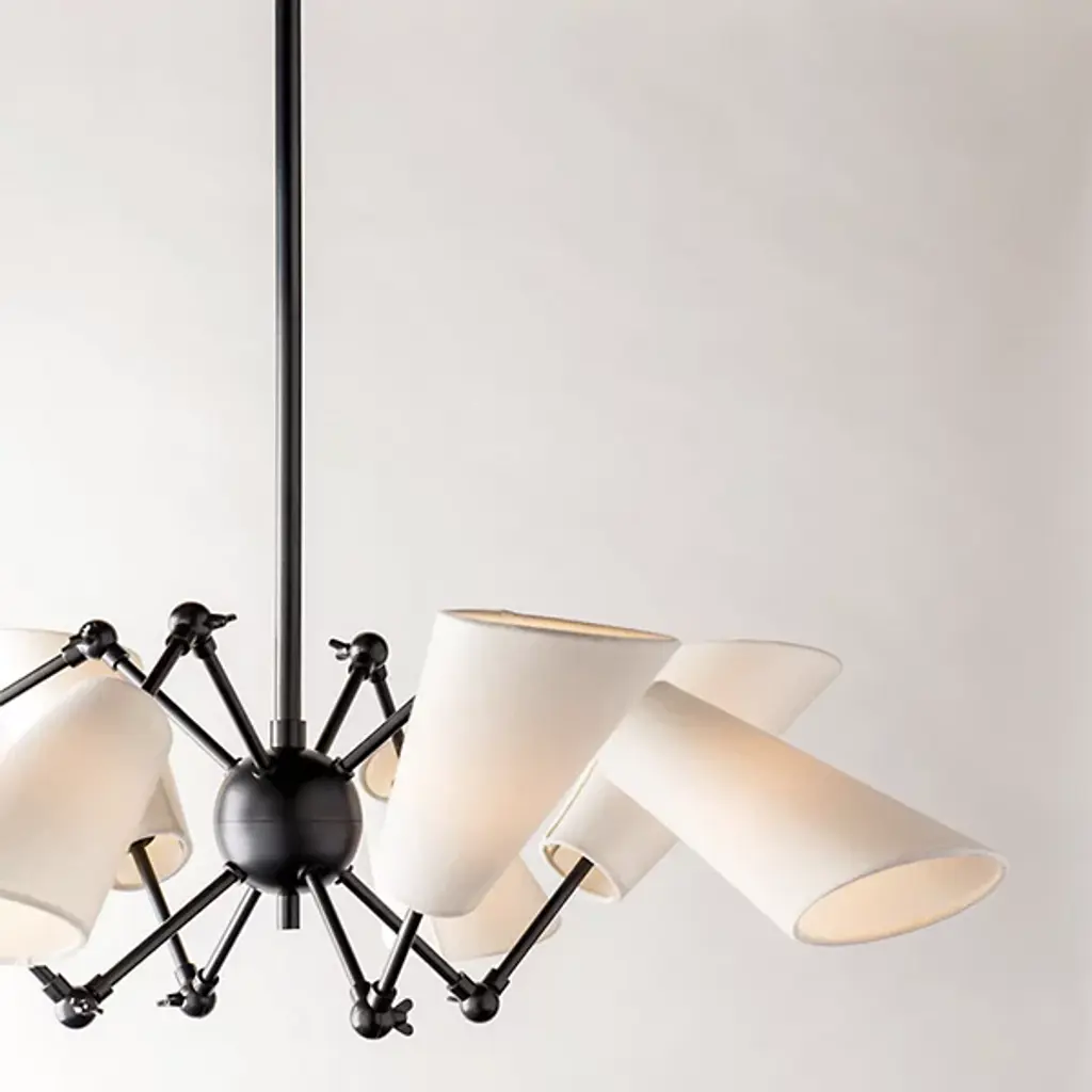 Like a large, friendly spider the Buckingham Chandelier by Hudson Valley Lighting suspends overhead, offering versatile decorative lighting for large, open spaces. Its spindly metal legs extend out from a central spherical hub, showcasing swivel-detailed joints from which each arm is adjustable. Quasi-conical Off-White Linen shades cap the arms, diffusing and funneling light for a more focused ambient effect that is both beautiful and incredibly useful.
