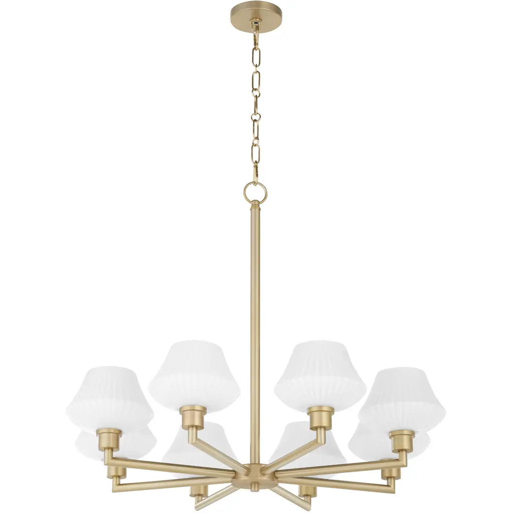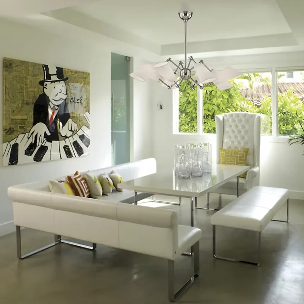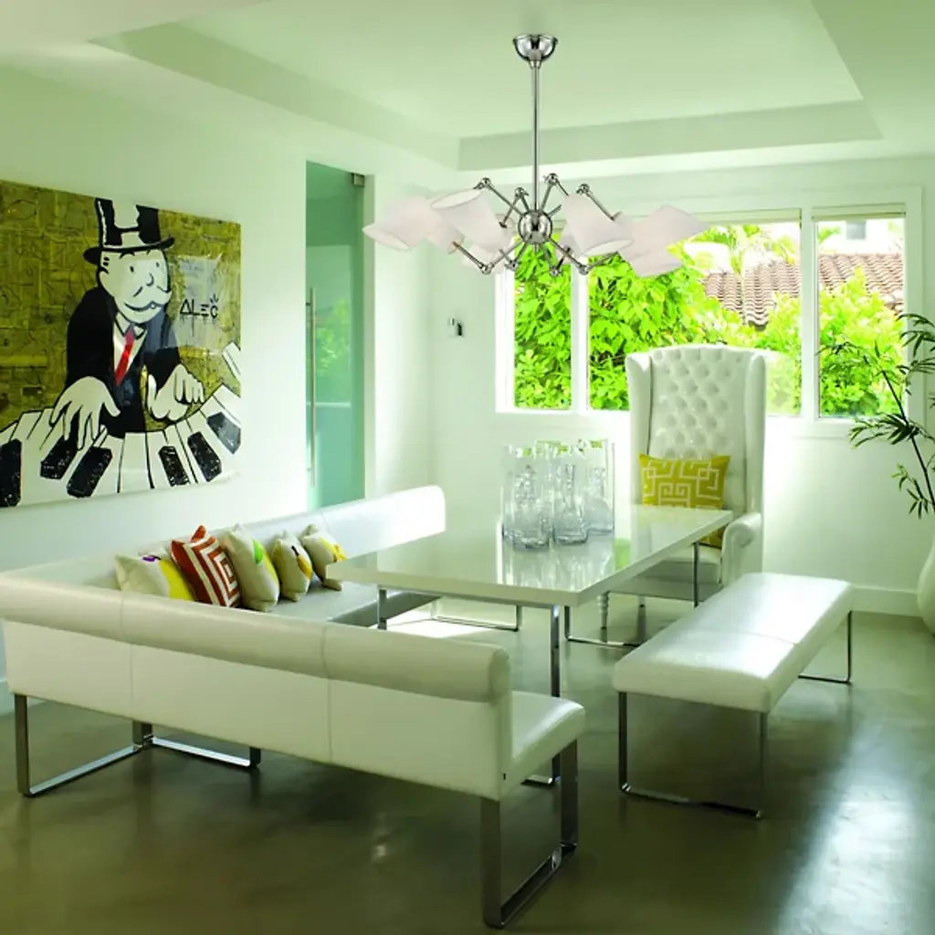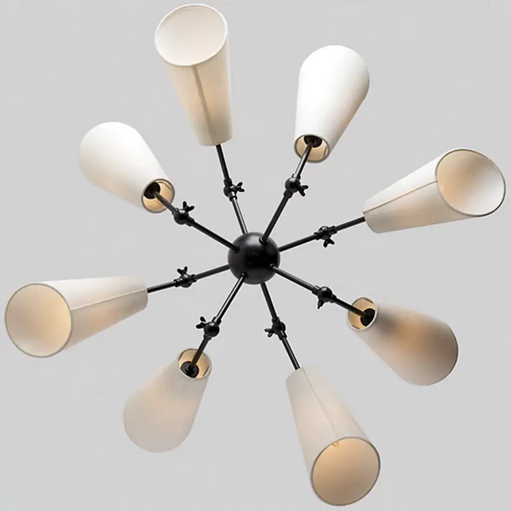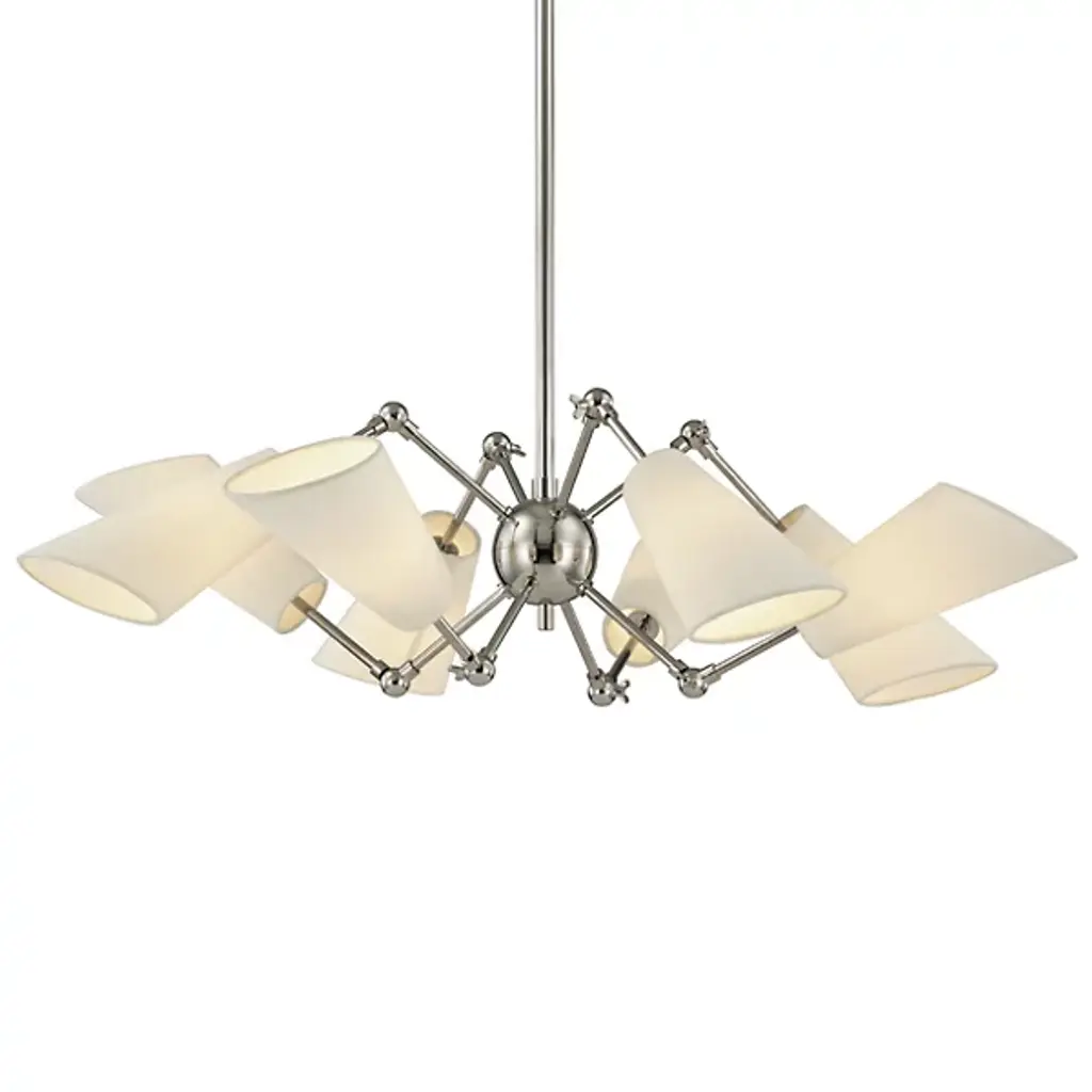 Like a large, friendly spider the Buckingham Chandelier by Hudson Valley Lighting suspends overhead, offering versatile decorative lighting for large, open spaces. Its spindly metal legs extend out from a central spherical hub, showcasing swivel-detailed joints from which each arm is adjustable. Quasi-conical Off-White Linen shades cap the arms, diffusing and funneling light for a more focused ambient effect that is both beautiful and incredibly useful.