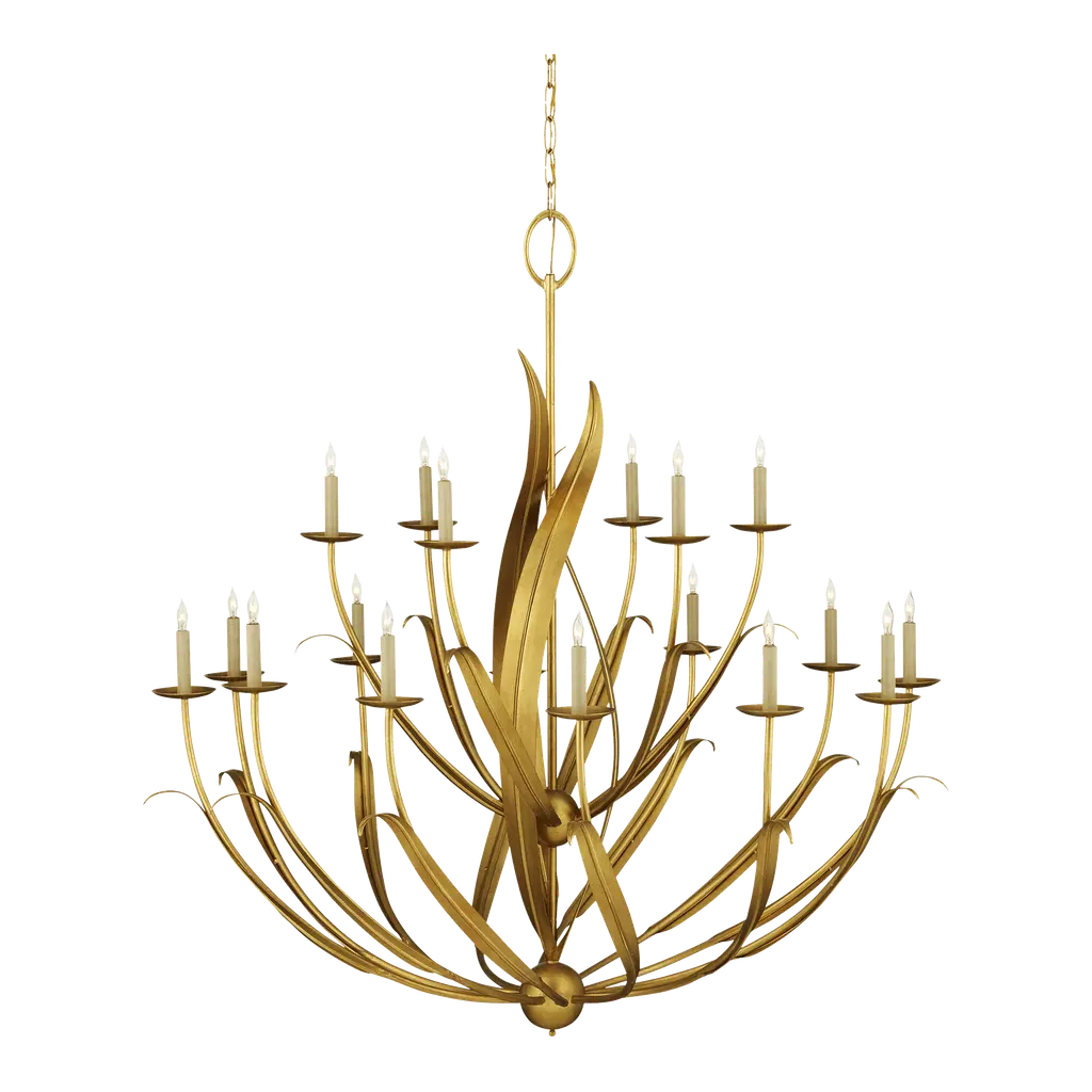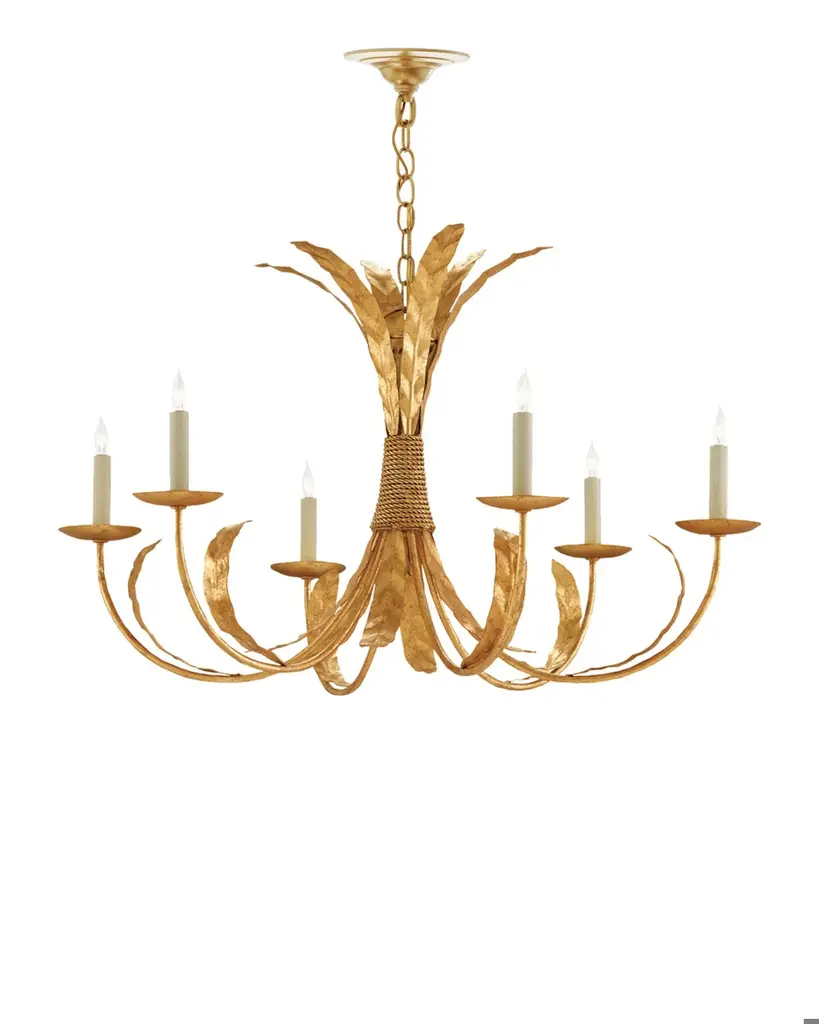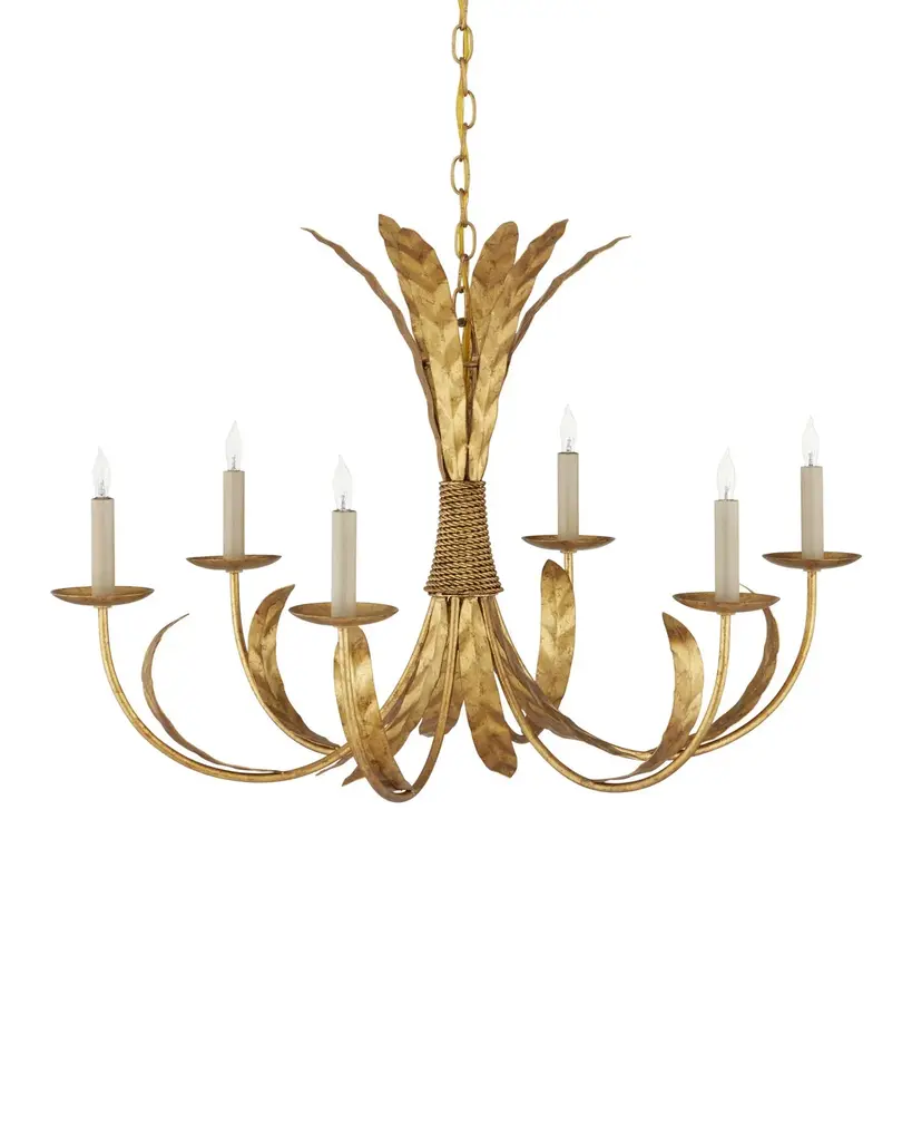 Designed by Bunny Williams for Currey and Company, the sheaf of feathers ornamenting the classic shape of the Bette Chandelier is a special design note, as is the brilliance of the Grecian gold leaf finish on the wrought iron frame. This beautiful gold chandelier that is cinched in the middle to make it a beautiful form is in our Bunny Williams Collection.
